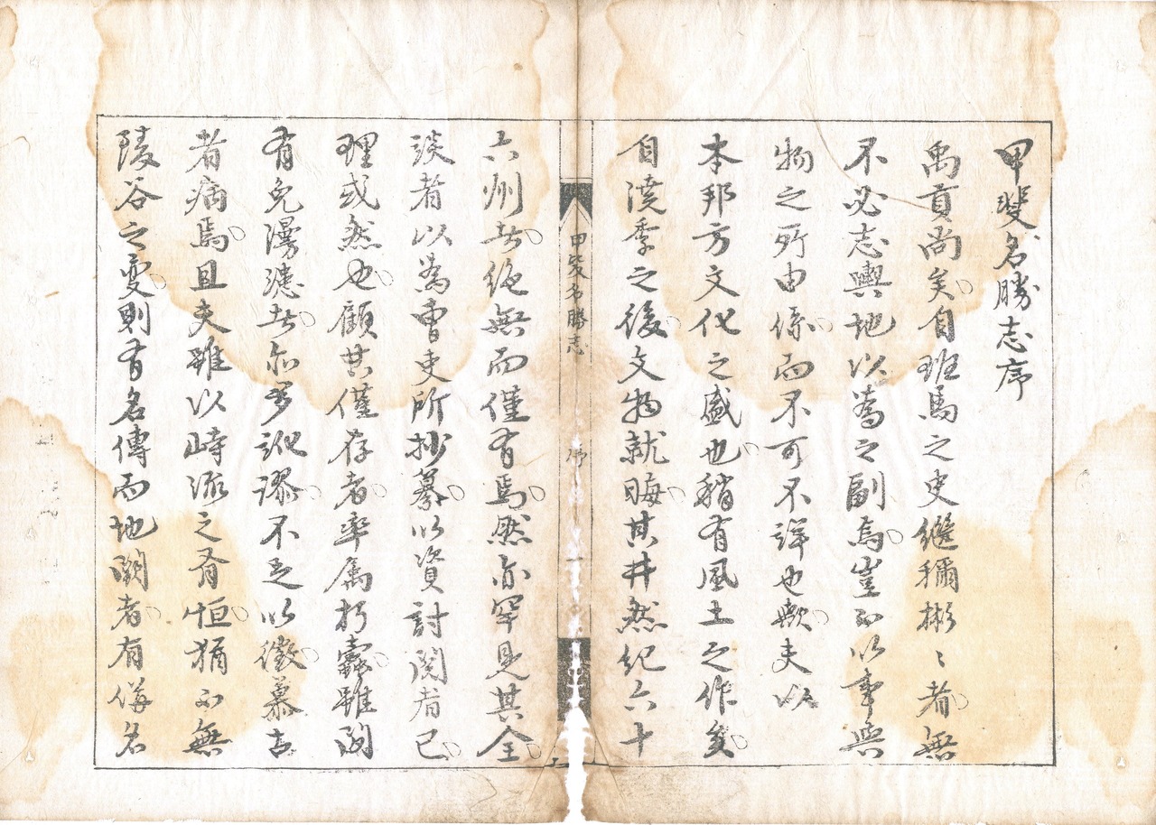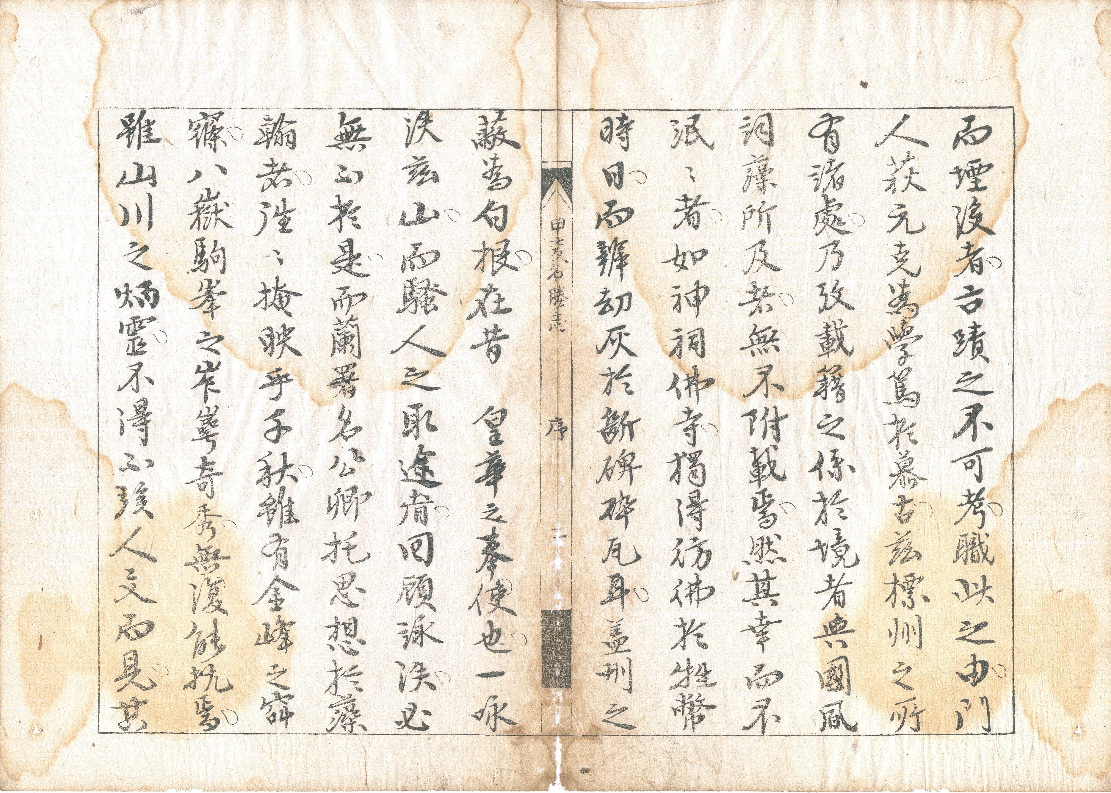 【備考】分類「地誌」。袋綴じ展開収録。底本は版元不明だが、一般的に[甲斐国山梨郡]著者蔵板か、[甲府]内藤伝右衛門(温故堂)板である。天明3年に記された『甲斐名勝志』は文化11年(1814)に成立した『甲斐国志』とともに近世甲斐国の代表的な地誌。文政3年(1820)に完成した昌平坂学問所の地誌調所が編纂した諸国地誌の解題目録『編脩地誌備用典籍解題』では『甲斐国志』など幾つかの甲斐国地誌とともに、『五畿内志』に準じた地誌と分類された。『甲斐国志』に比べ内容が簡略で、元克の和歌研究が反映されている点が特徴。当初は私家版であったが、後に地元では甲府の書肆村田屋孝太郎、江戸では書肆・須原屋井八により刊行された。江戸の蘭学者・前野良沢も本書を高く評価した。全5巻(3冊)で、序文は加賀美光章による。内容は1巻で『和名類聚抄』などに拠る古代甲斐国の国司一覧や郷名など地誌情報のほか甲斐八景和歌など。続く2巻以降で、山梨郡・八代郡・巨摩郡・都留郡の順で郡別の寺社や名所古跡や和歌などを記す(Wikipedia参照)。