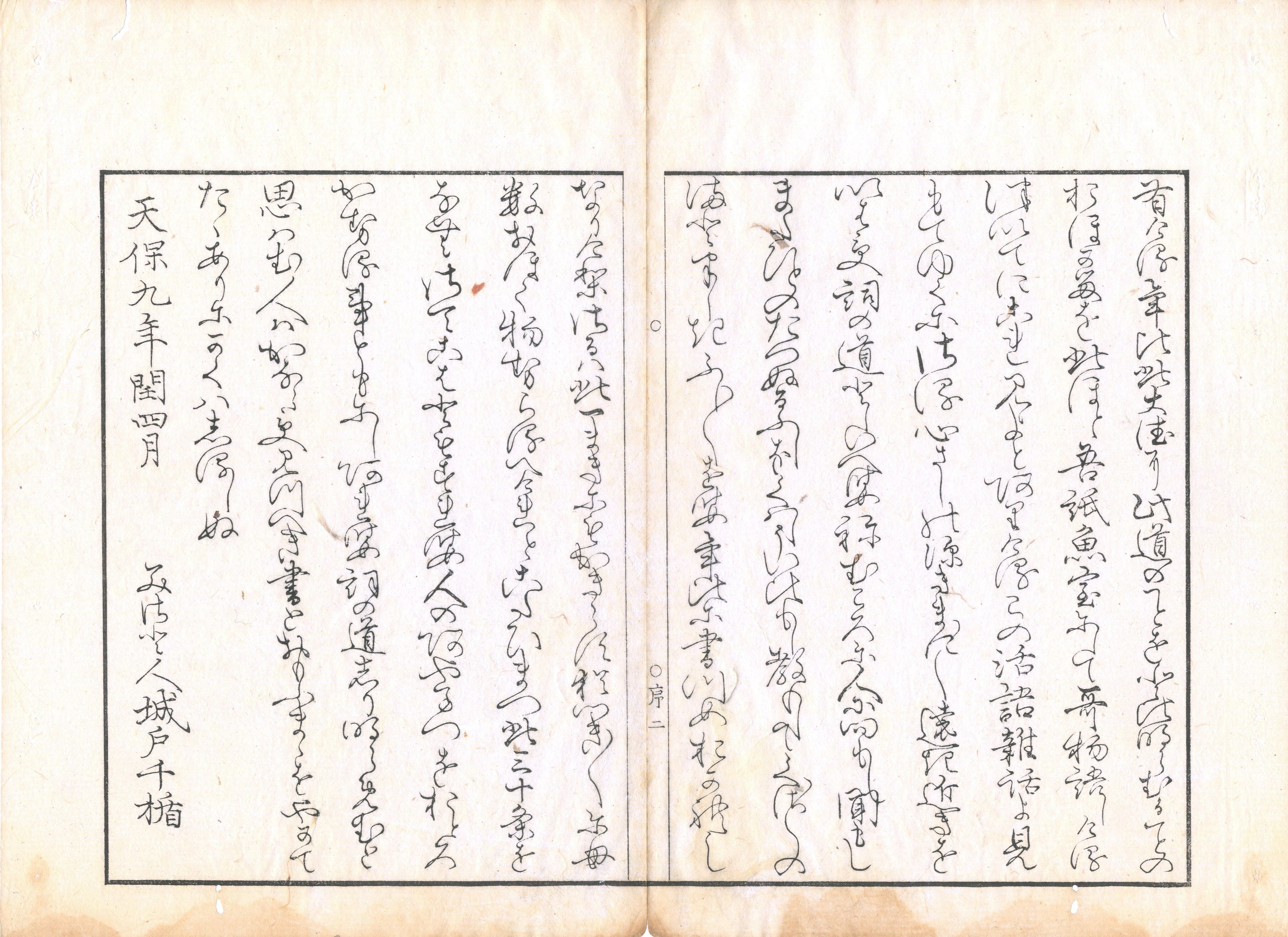 【年代等】初編:天保4年春自序。天保9年閏4月、城戸千楯序。天保9年初刊。天保10年2月再刊。2編:天保10年3月、大橋長広序。天保10年1月自序。天保11年8月初刊。3編:天保11年12月、大江東平序。天保13年9月初刊。明治26年10月再刊。[京都]細川清助(開益堂)板。