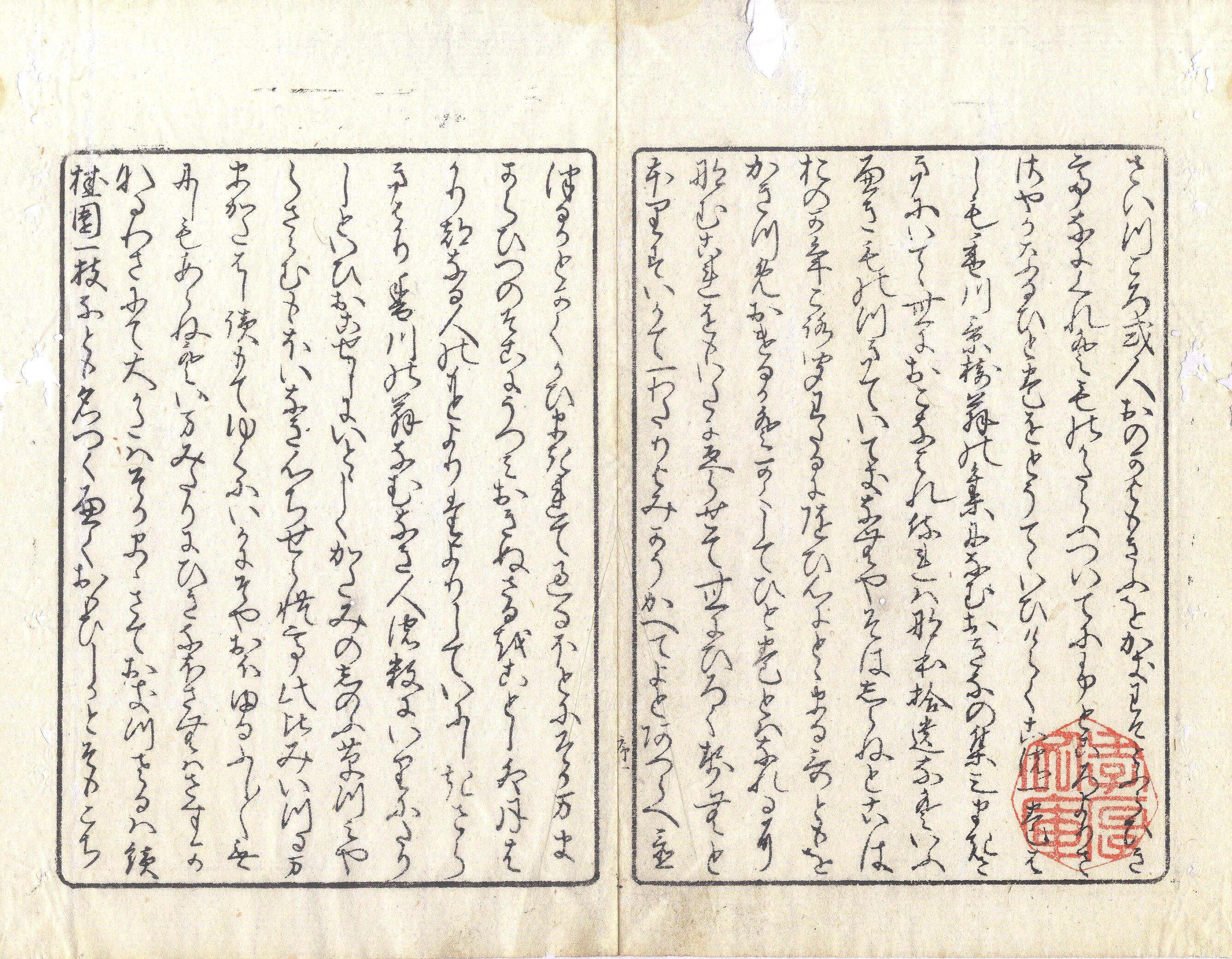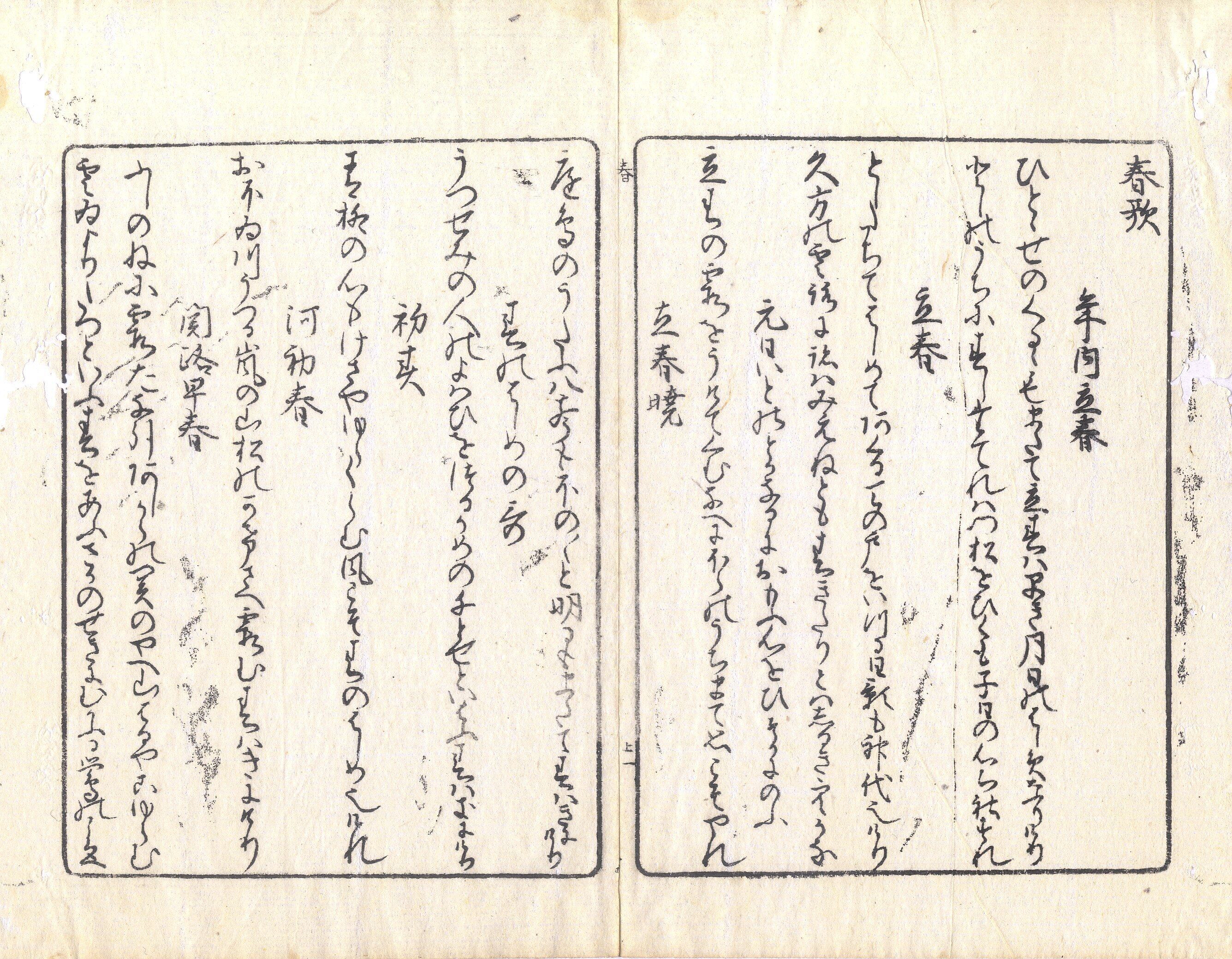 【備考】分類「和歌」。桂園香川景樹大人歌集。仲田顕忠(1801-60)は、江戸時代後期の歌人。享和元年生まれ。幕臣。江戸の人。海野幸典(ゆきのり)にまなぶ。香川景樹をしたい,その歌を「桂の落葉」にあむ。小林歌城(おばやし-うたぎ)が景樹の歌集を評して「桂園一枝拾遺評」をあらわすと,「桂園一枝拾遺再評」を刊行し,反論した。安政7年2月27日死去。60歳。通称は藤右衛門。号は蓬園。歌集に「仲田顕忠歌集」(コトバンク)。SE02362