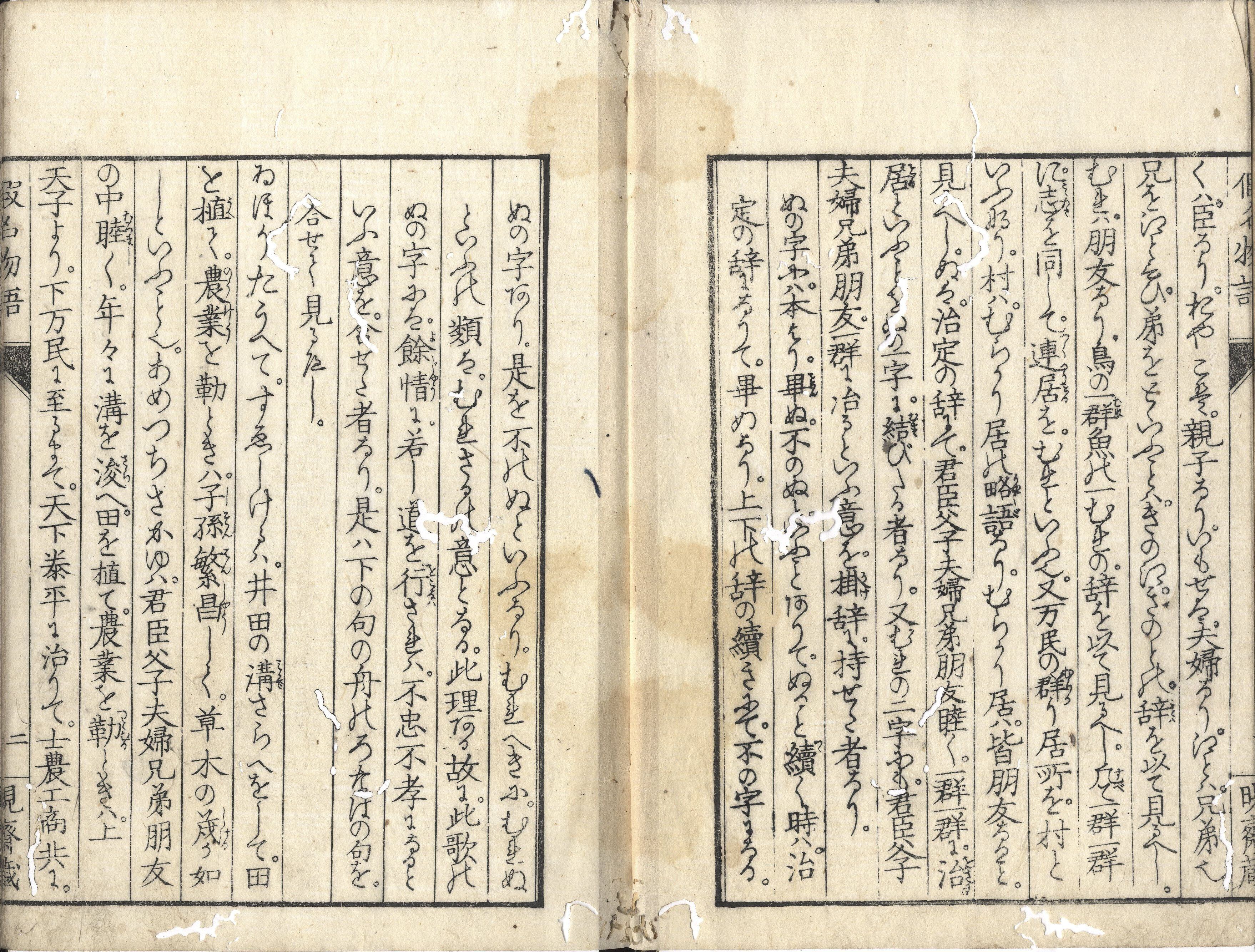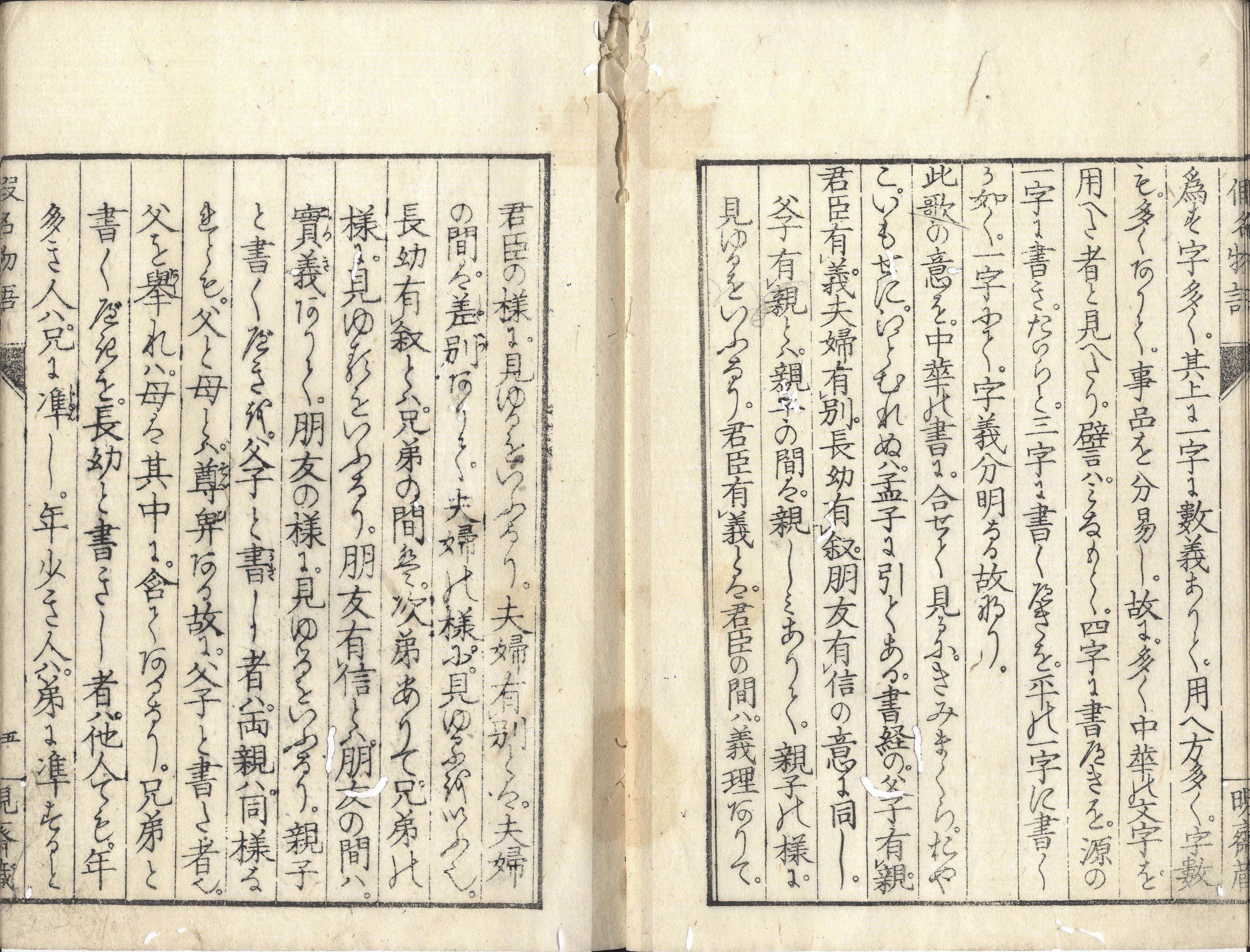 【備考】分類「語学」。同板別本など合計3種を収録(別本2は全冊モノクロ画像)。『仮名物語』は、仮名学習に用いられた「きみまくら」の歌や「いろは」歌の注釈や、万葉仮名・片仮名・平仮名(扁仮名)の成立・変遷・故事等を記した書。