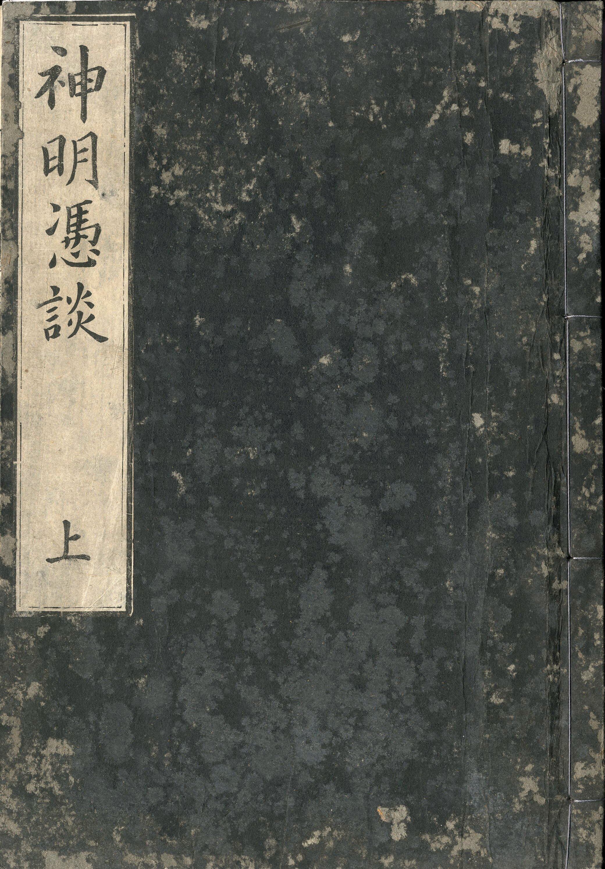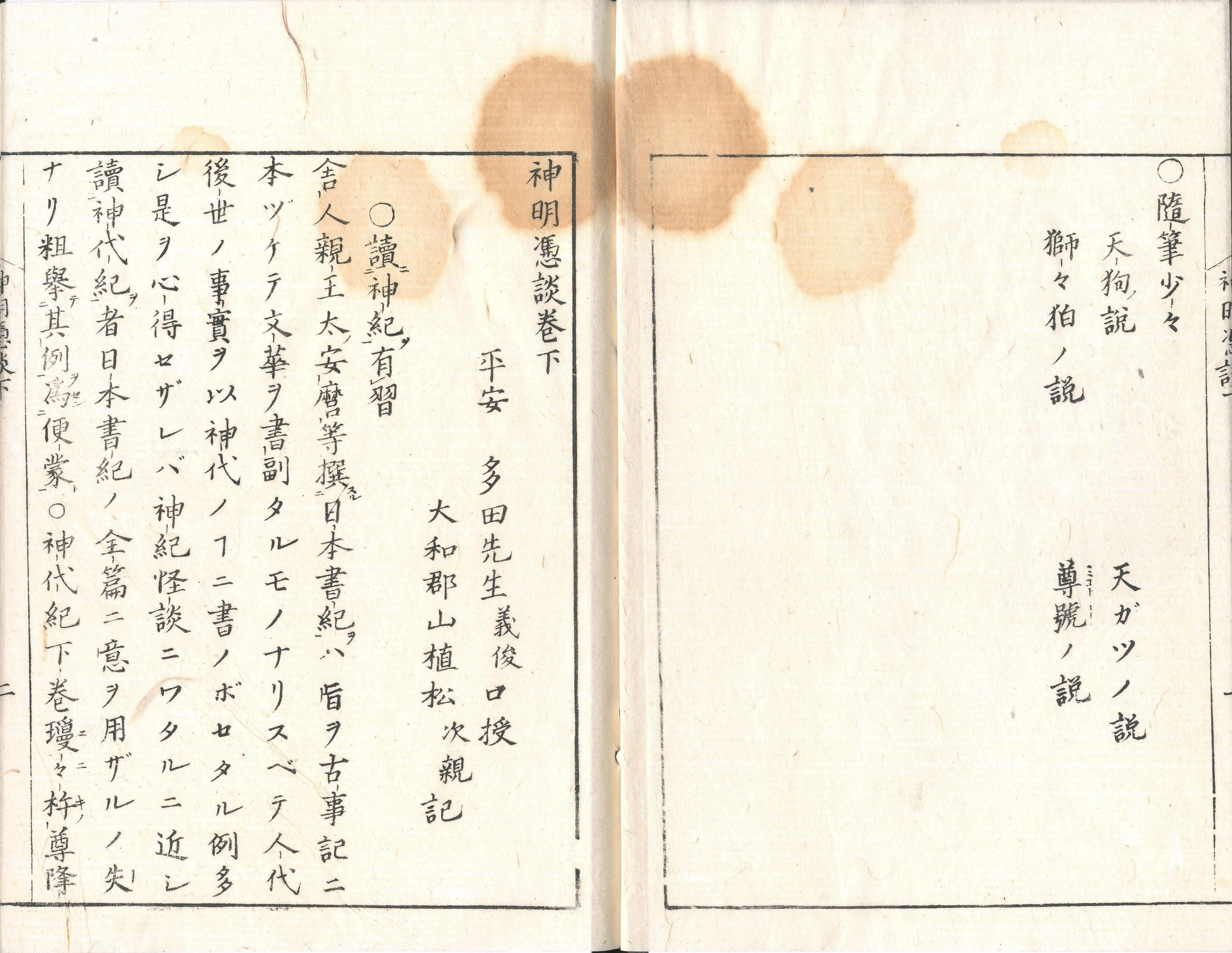 【備考】分類「神道」。神道の諸問題に関する雑記的な論書。漢字カナ交じり。上巻:神代人代之差別、撰日本書紀旨趣、読日本書紀用意、両部唯一并神秘ノ事、神道忌獣肉乎之事、下巻:読神紀有習、和訓考、中臣忌部職掌考、木綿襁考、異国産物納宮社無難考、随筆少々(天狗・天ガツ・獅子狛・尊と命)。序によれば『中臣祓気吹抄』とともに多田義俊の言説を植松次親がまとめたもの(西尾市岩瀬文庫DB)。