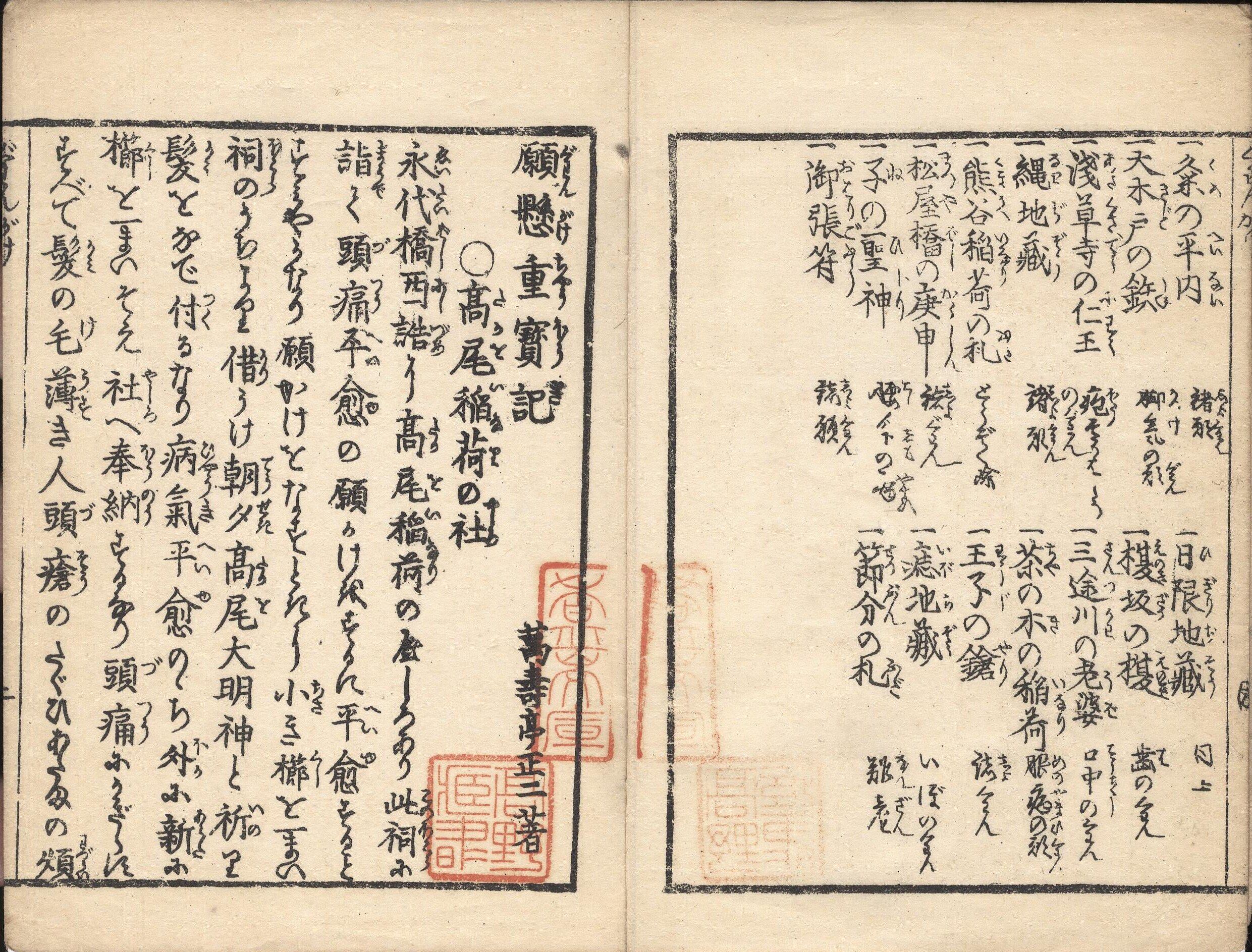 【備考】分類「地誌」。「初編」と記すが初編のみの刊行。当時江戸府内で流行していた願掛け・流行神31例を紹介したもの。例えば、頭痛なら高尾稲荷の社、疱瘡の願なら錐大明神、虫歯や口中一切の願ならおさんの方…というように巻頭目録に、寺社名を願懸けの種類とともに掲げてある。SE02420