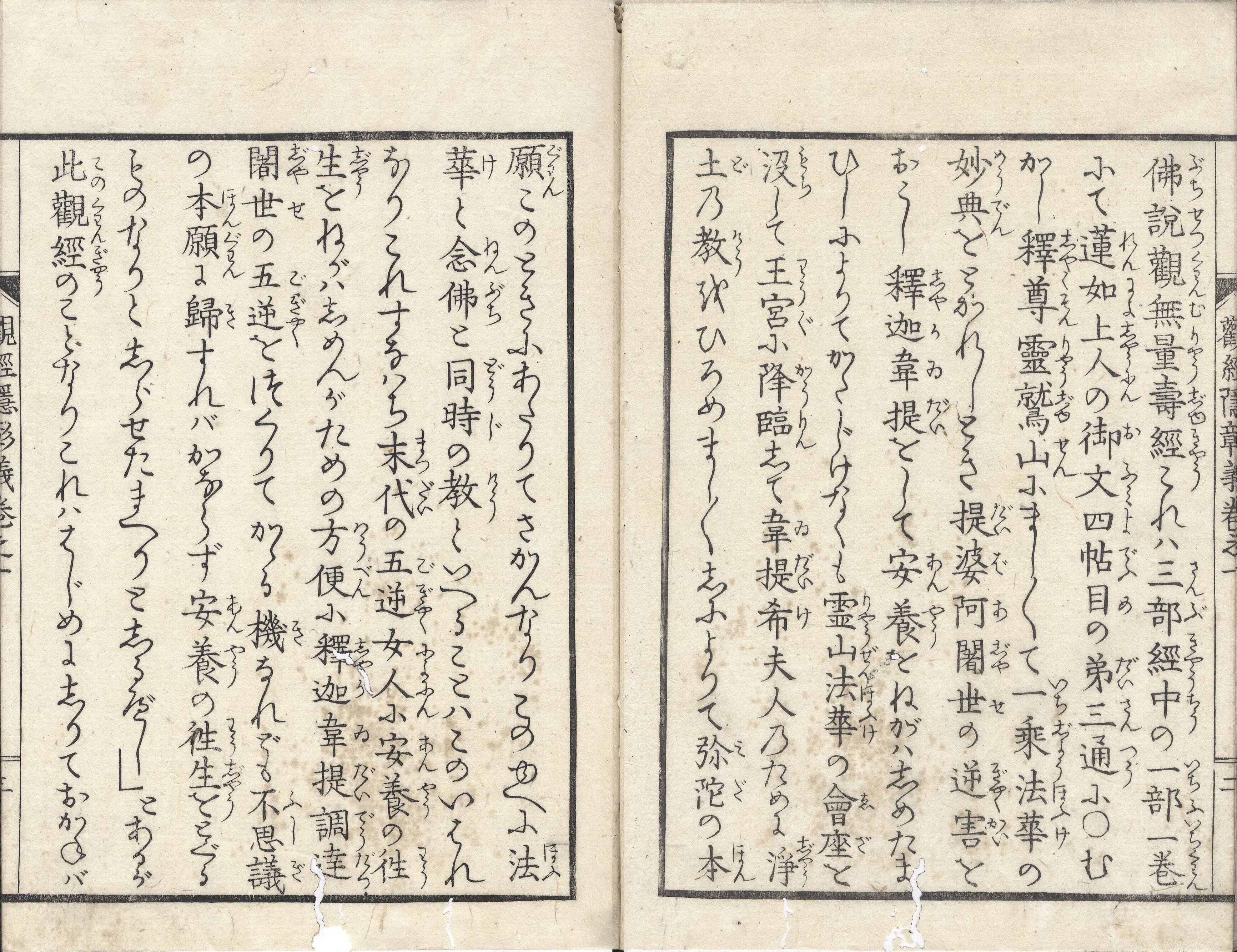 【備考】分類「真宗」。後印本2種([京都]永田調兵衛(文昌堂)板、[京都]沢田友五郎板)も抄録した。本書は『観経(観無量寿経)』の真実義である「隠彰」を詳しく説いた書。「観無量寿経」は”方便の経”と言われていて、表向きの意味と、裏面にひそかに隠された真の意味があり、言わば「二重構造」を持つお経だが、「観経」の表向きの意味を「顕説(けんぜつ)」と言い、「定善・散善」と言われる自分の力でさまざまな修行を修め、善根を積み、阿弥陀さまのお浄土に生まれようとする、”自力の行”を説明した内容となっている。一方、裏面に隠れた真の意味は、阿弥陀さまの救いの働き、つまり第十八願の誓いであり、人々をこの阿弥陀さまの救いの働きに通入させることを説く(みんな、西に向かう命の旅人HP参照)。「顕彰隠密」は、浄土真宗で、『観経』と『小経』の説相を解釈するのに用いる名目で、略して「隠顕おんけん」といい、顕を「顕説けんぜつ」、隠を「隠彰おんしょう」ともいう。顕説とは顕著に説かれている教義で、『観経』では「定散諸行往生じょうさんしょぎょうおうじょう」、すなわち要門の教義であり、『小経』では自力念仏往生すなわち真門の教義である。隠彰とは隠微にあらわされている真実義で、両経ともに他力念仏往生の法すなわち弘願(ぐがん)法である(WikiArc参照)。