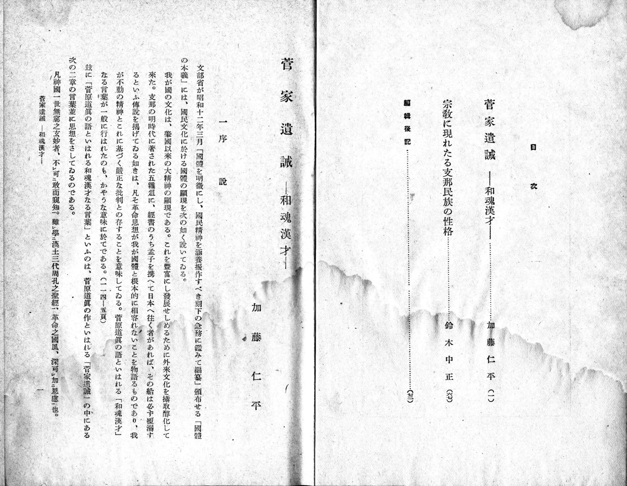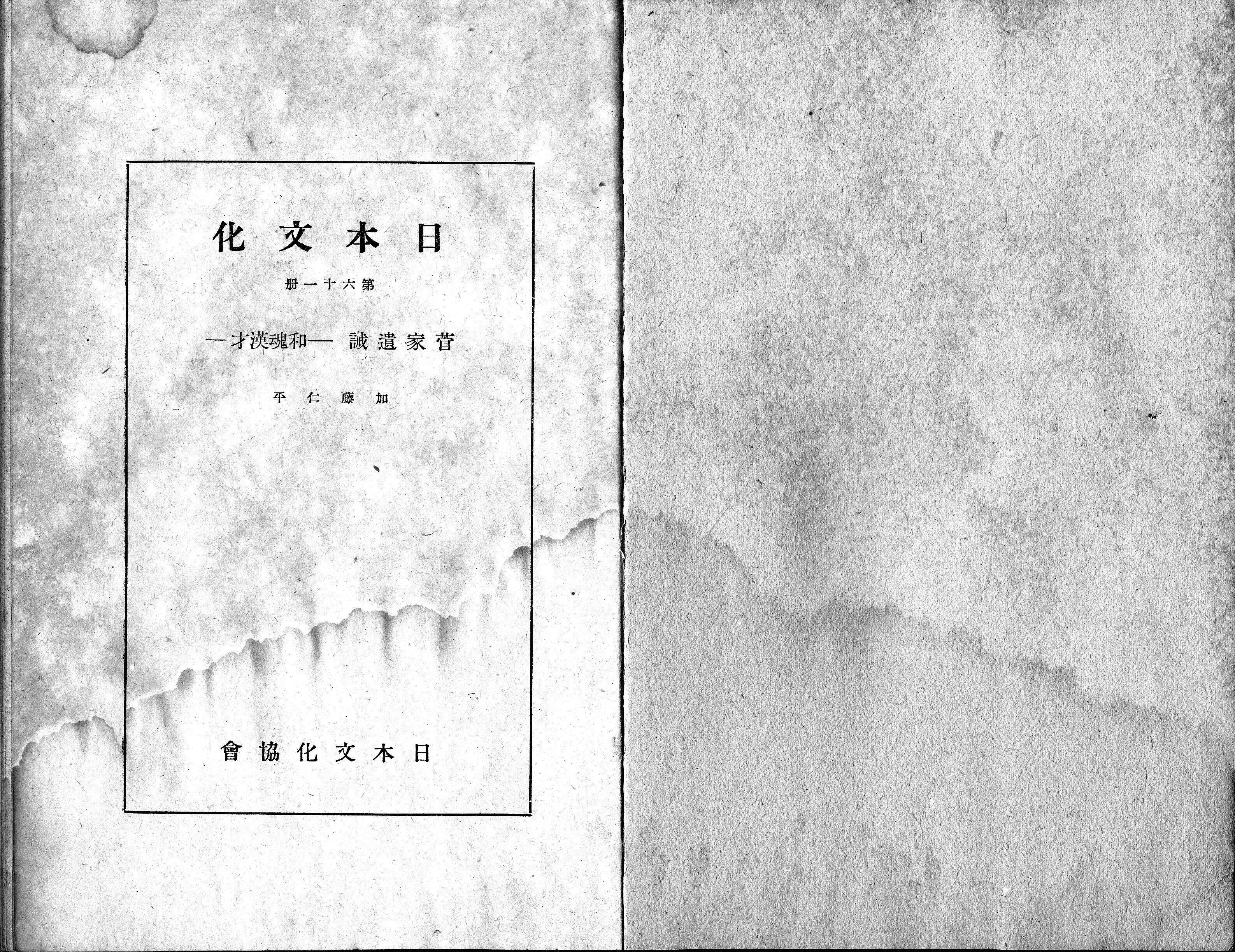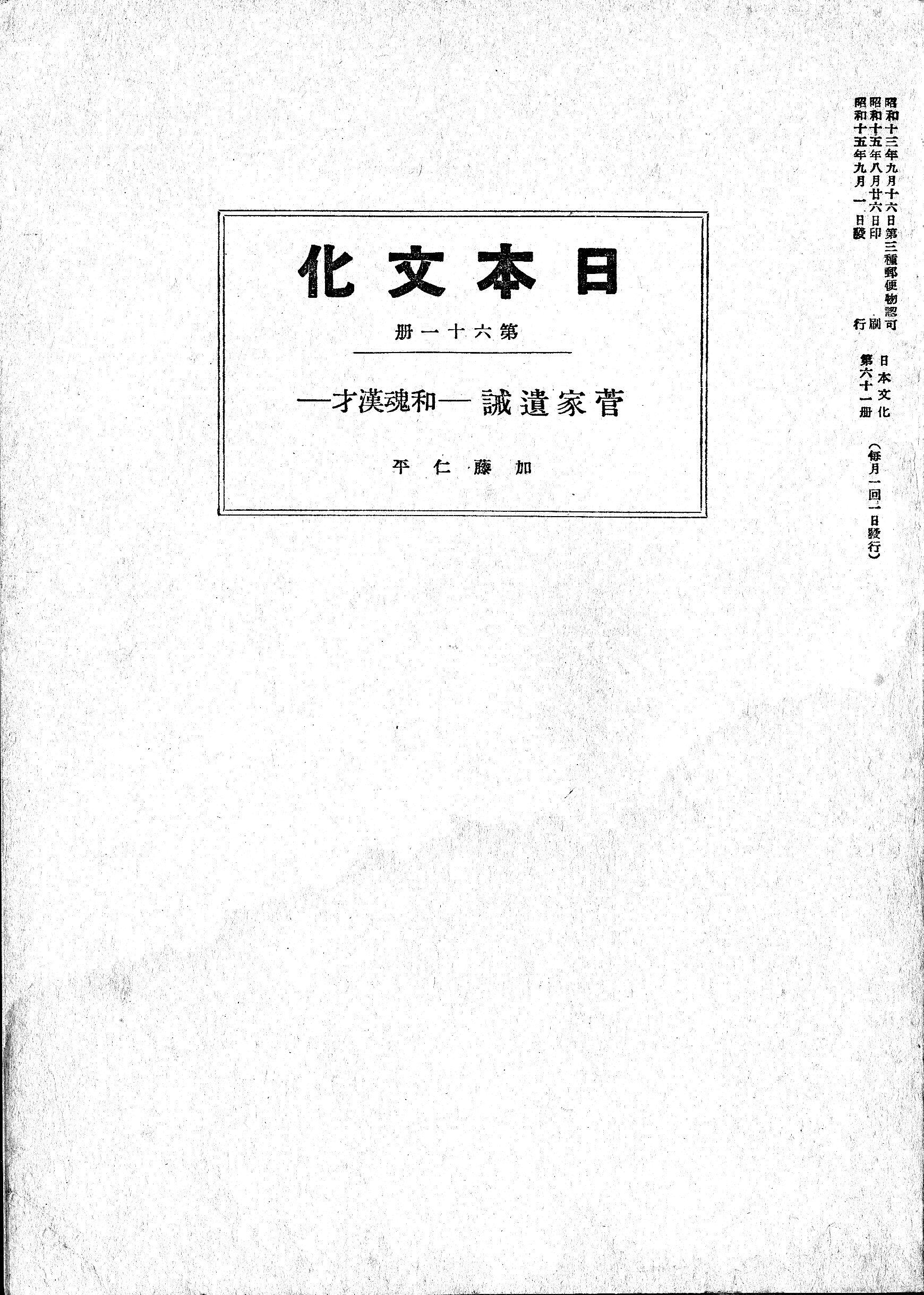 【備考】分類「教訓」。後半に参考として『日本文化』第61冊を収録した。『菅家遺誡』の成立年代は室町時代か。菅原道真に仮託された公家のための訓誡。巻1は20条、巻2は13条より成り、内容は仁君の要政から説き起こし、神事・入租貢税・朝儀・音楽・詩賦・歌吟・社寺修営・主上調度・外蕃謁見・市店交買・田猟・宮中私閨・刑罰・武備・僧尼・冠婚葬祭・服忌・公家新領・朝野恪勤・良家子弟・街路巷保・揚名官職・震雷等に及んでいる。道真の和魂漢才説の起原を成すものとして思想的に重要視されたが、明白な偽作である。本書は江戸末期に国学者の和魂意識や、志士等の尊皇攘夷思想の勃興に乗じて広くもてはやされ、明治以後も教育や思想を統一する原理として適用された。現存する諸本はすべて江戸時代の書写で異同はなく、内容が33条より成るのがもとで、2章を付加したのは後代のものである。版本としては嘉永5年板・文久元年板・明治6年板などがある。SE02431