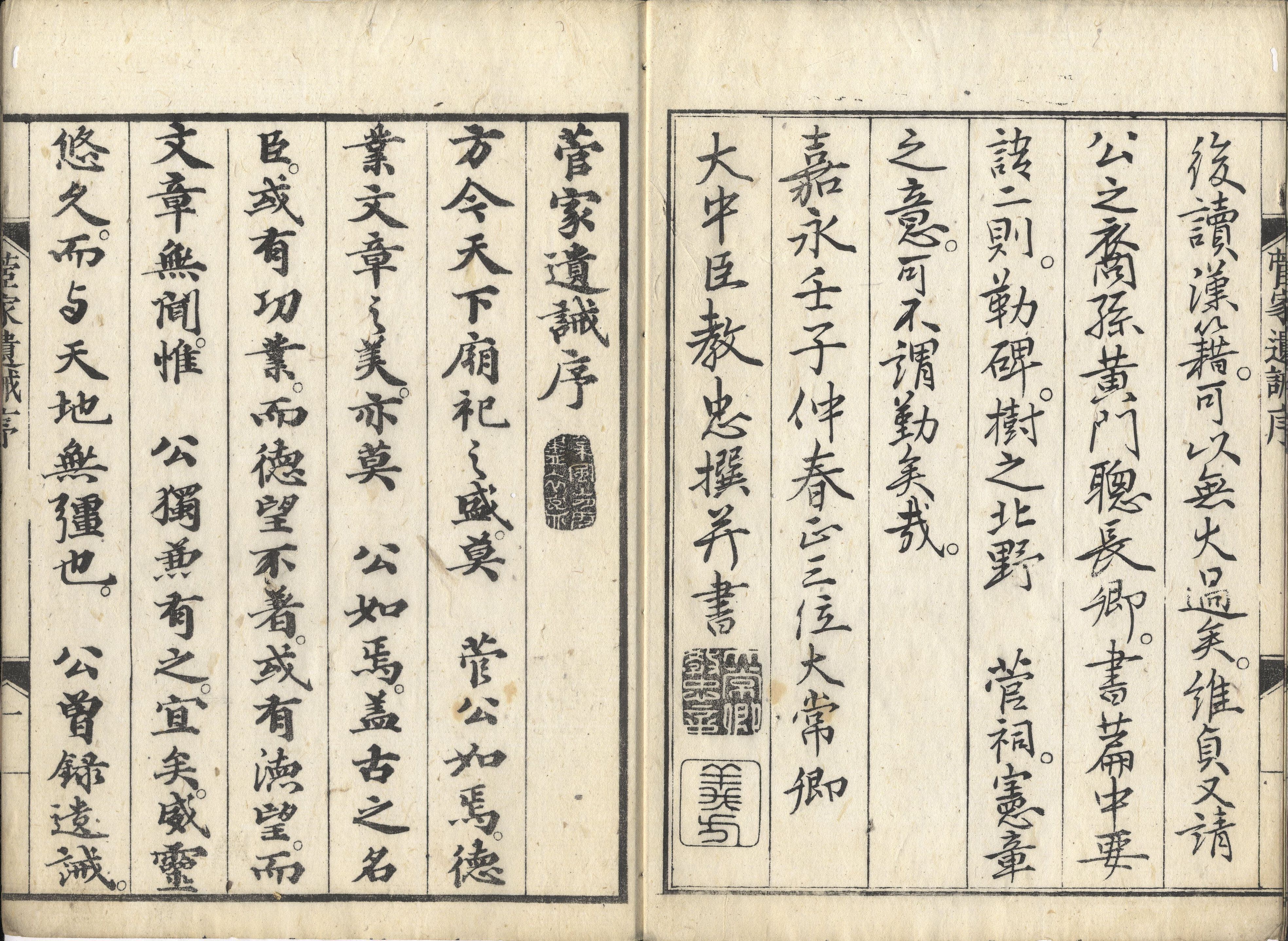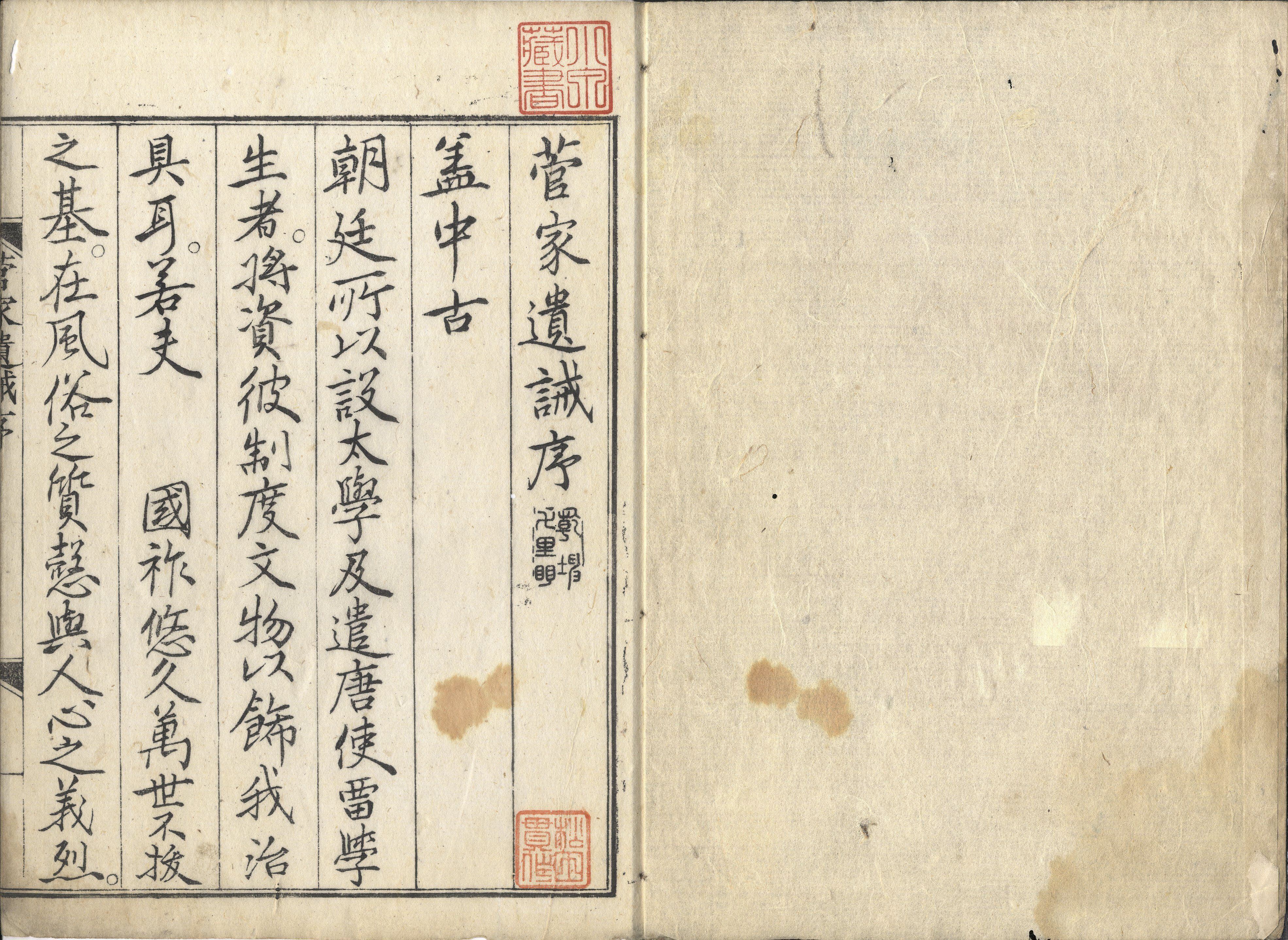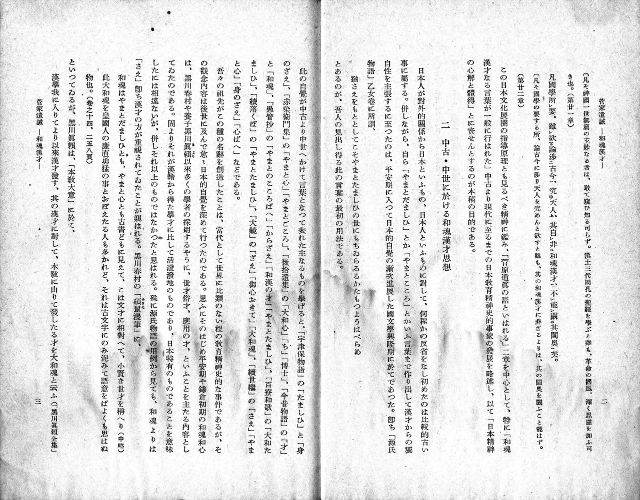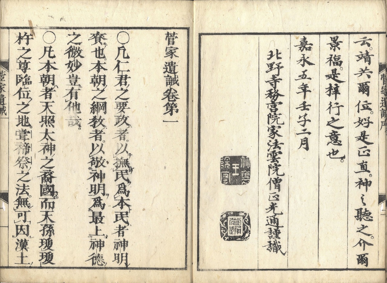 【備考】分類「教訓」。後半に参考として『日本文化』第61冊を収録した。『菅家遺誡』の成立年代は室町時代か。菅原道真に仮託された公家のための訓誡。巻1は20条、巻2は13条より成り、内容は仁君の要政から説き起こし、神事・入租貢税・朝儀・音楽・詩賦・歌吟・社寺修営・主上調度・外蕃謁見・市店交買・田猟・宮中私閨・刑罰・武備・僧尼・冠婚葬祭・服忌・公家新領・朝野恪勤・良家子弟・街路巷保・揚名官職・震雷等に及んでいる。道真の和魂漢才説の起原を成すものとして思想的に重要視されたが、明白な偽作である。本書は江戸末期に国学者の和魂意識や、志士等の尊皇攘夷思想の勃興に乗じて広くもてはやされ、明治以後も教育や思想を統一する原理として適用された。現存する諸本はすべて江戸時代の書写で異同はなく、内容が33条より成るのがもとで、2章を付加したのは後代のものである。版本としては嘉永5年板・文久元年板・明治6年板などがある。SE02431