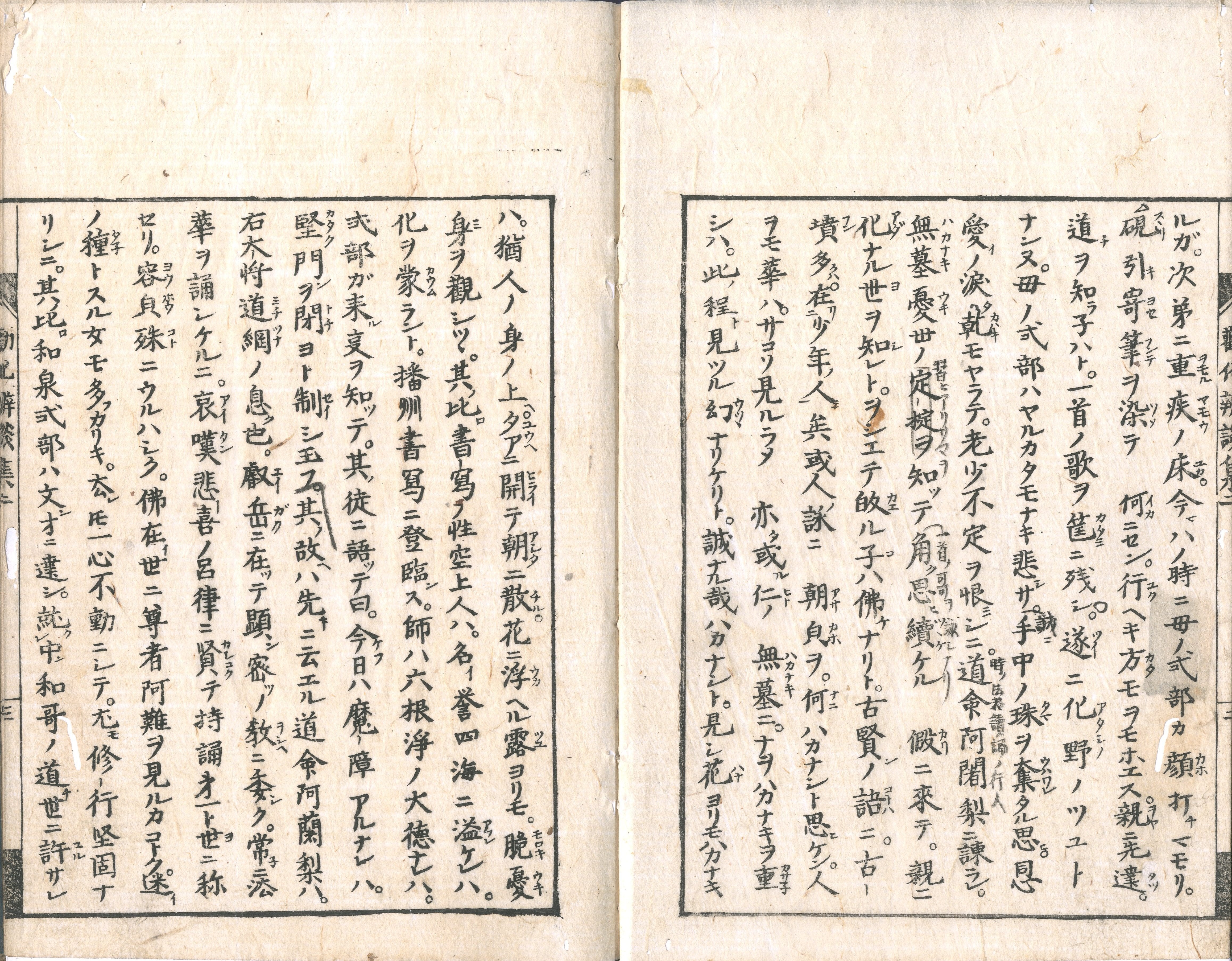 【備考】分類「浄土」。従来『明和書籍目録』に記載の書名「勧化因縁辨断」3冊として存在が知られていたに過ぎないが、このたびその原本3冊を新発見。勧化(仏の教えを説き信心を勧める)の契機となる故事や逸話を集めた仮名書きの仏書。目次と本文の見出しが一致しないが、本文見出しに従えば、1巻は「三谷源左衛門事」と「東海道池鯉鮒(チリュウ)郷穢多之市助事」の2話、2巻は「熊野権現霊威之事、並智鑑和尚和歌之事」「女人成仏之問答」「転女成男之問答」「駿州今泉天録五良右衛門吉清事」「大唐並妙蓮尼之事」「守屋伝兵衛事」の6話、3巻は「慧心僧都宇治平等院ニテ説法之事」「指物屋新兵衛女成仏之事」「丹波国山本源蔵疫神ニ逢フ事、並念仏ハ現当両益ナル事」の3話で、合計11話を収録。