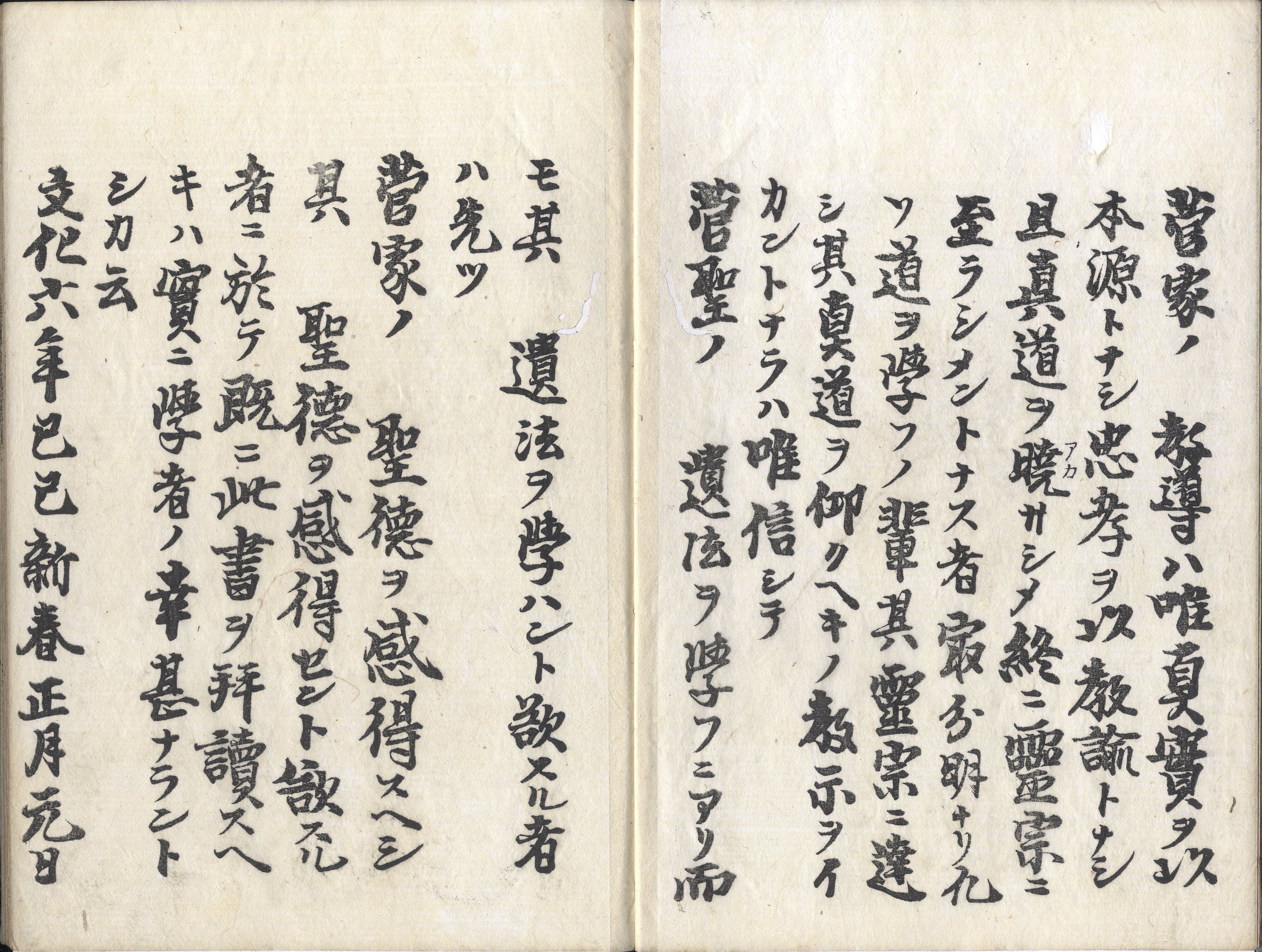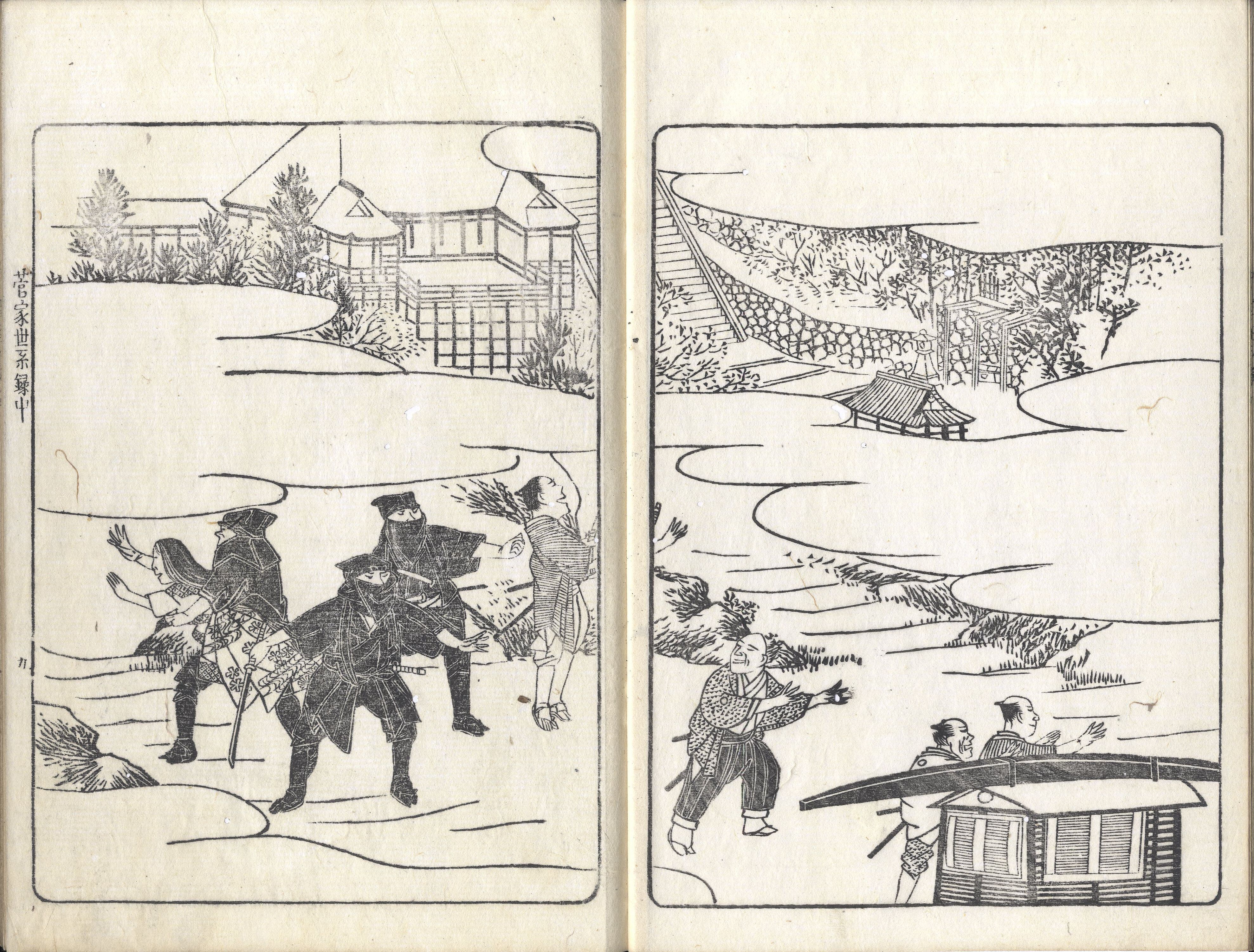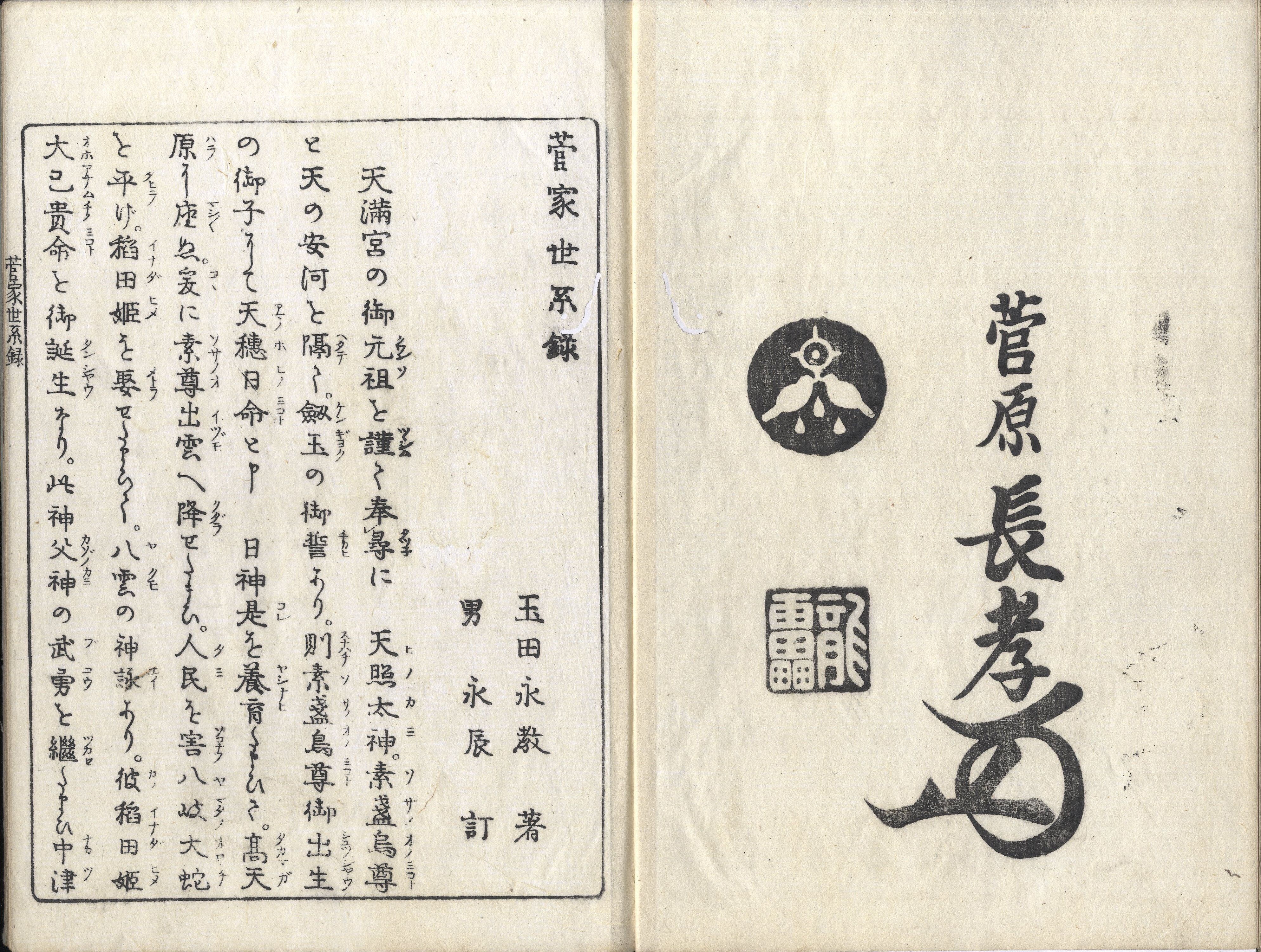 【判型】大本3巻3冊。収録順に縦258・255粍。【作者】玉田永教(ナガノリ)作。玉田永辰(ナガトキ)校。広賢画。【年代等】文化元年作。文化6年1月、菅原長孝序・刊。刊行者不明。【備考】分類「系譜」。異板別本を末尾に抄録した。菅原道真の家系や伝記を挿絵を交えて述べる。玉田永敬作。玉田永辰校訂。文化6年刊。題簽が全く異なるほか本文にも異同がある。 【参考】 玉田永教は江戸後期の神道講釈師。徳島藩士として生まれ、上京して神典を学び吉田家の神道教授となり、全国を遊歴して神道の普及につとめた。《年中故事》《菅家世系録》など、神国日本を賞賛した通俗神道書を著し、賀茂真淵を〈姦悪国賊〉ときめつけた。その影響は吉田松陰にも及ぶといわれる。この玉田派の神道講釈師から,玉田玉枝斎(ぎよくしさい)・玉秀斎(ぎよくしゆうさい)・玉芳斎(ぎよくほうさい)の3兄弟が出て明治の大阪講釈界で活躍、さらに2代目玉秀斎によって書き講談〈立川文庫〉が誕生している(コトバンク)。SE02433