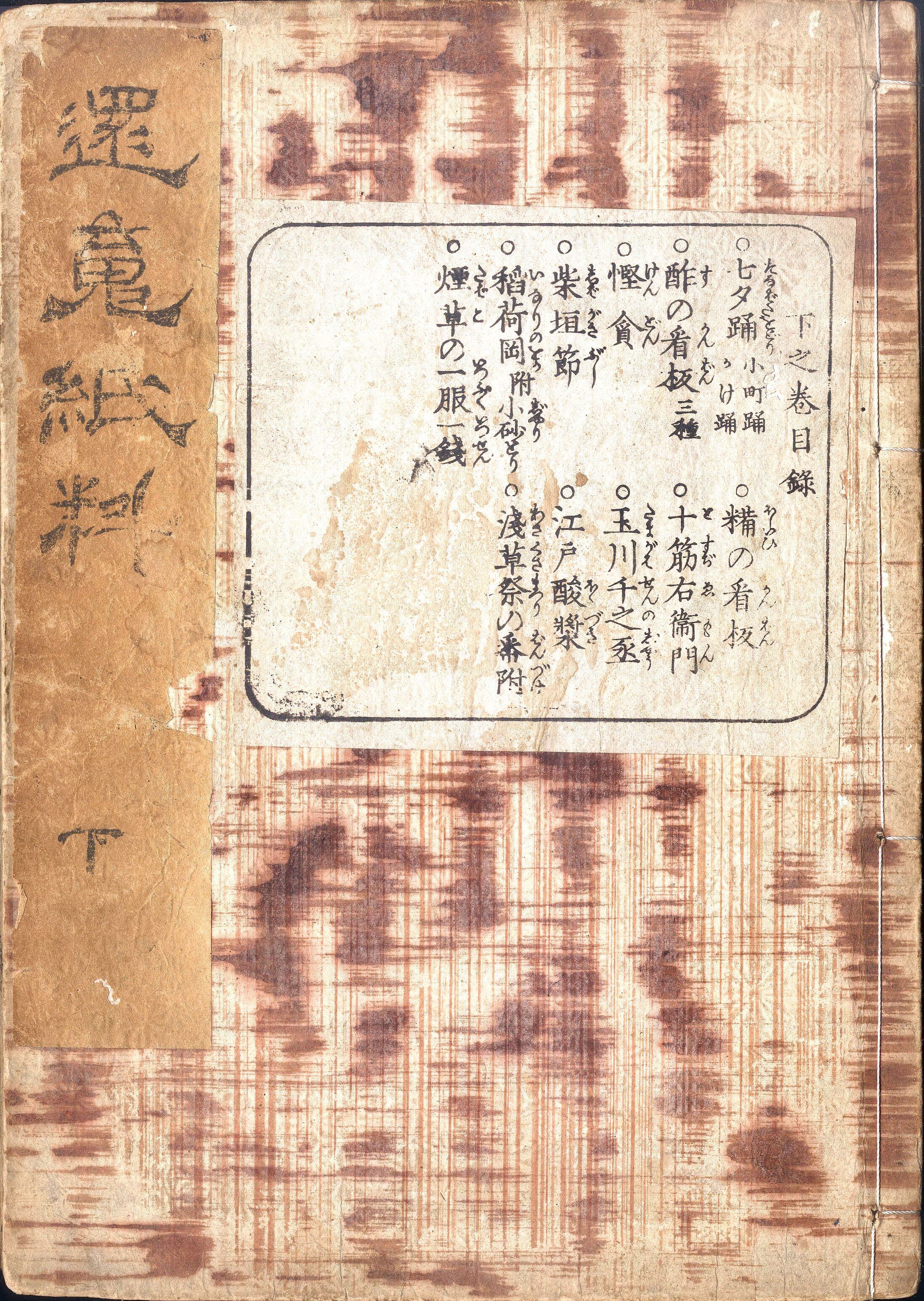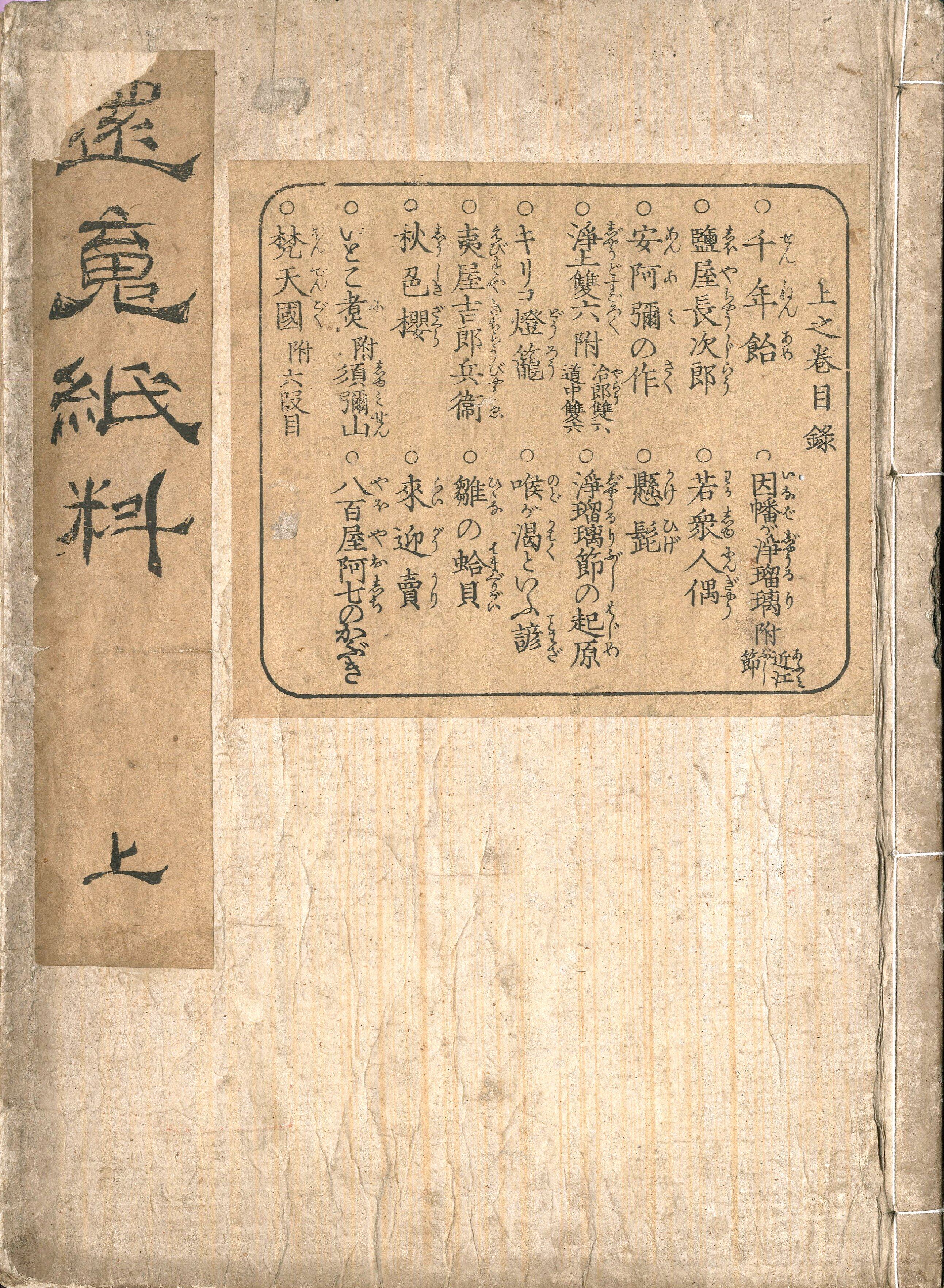 【備考】分類「随筆」。『還魂紙料』は、2巻2冊、随筆、柳亭種彦著。文政7年成り、文政9年、江戸西村屋与八刊。書名の訓みは、柱刻には「すきかへし」とあるが、種彦の合巻『雁金紺屋作早染』(文政9年)中に「くわんこんしれう」と振り仮名があり、これをとる。内容は、風俗・芸能などに関する事物や言葉についての考証を記したもの。取り上げられている事項の見出しを列挙すると、上巻には、「千年飴」「因幡が浄瑠璃」「塩屋長次郎」「若衆木偶(ニンギョウ)」「安阿弥の作」「懸髭(カケヒゲ)」「浄土双六」「浄瑠璃節の起源」「キリコ灯籠」「喉が渇くといふ諺」「夷屋(エビスヤ)吉郎兵衛」「雛の蛤貝」「秋色桜」「来迎売(ライゴウウリ)」「いとこ煮」「八百屋お七の歌舞伎」「梵天国」の17条。下巻には「七夕踊」「糒(ホシイイ)の看板」「酢の看板」「十筋右衛門(トスジエモン)」「慳貪」「玉川千之丞」「柴垣節」「江戸酸漿(ホオズキ)」「稲荷岡」「浅草祭の番付」「煙草の一服一銭」の11条。なお、巻末に既述の7項目についての補足がある。考証は、俳諧・狂歌・浮世草子・辞書・地誌等の諸書を引用した詳細なものであり、著者の博識ぶりをうかがわせる。また、古書の挿絵や古画を精細に模刻(一部、葛飾北斎画あり)している箇所が多いことも特色言える。項目は比較的少ないが、風俗・芸能・雑事に関する考証として利用価値は高い(「日本古典文学大辞典」参照)。/江戸後期の考証随筆。柳亭種彦著。為一(葛飾北斎)画(若干図)。1826年(文政9)刊。2巻2冊。原本の版心(柱)にある〈すきかへし〉を書名にする向きもあるが、同年刊の種彦の合巻に自身音読している。1824年成稿。上巻17項、下巻11項と補説7項。江戸初期の著名俳優、戯曲、芸能、習俗などにつき、古俳書から引例し、古画を模出紹介して精細な考証ぶりを示した高度な考証書(コトバンク)。/千年飴・因幡が浄瑠璃附近江節・塩屋長次郎・若衆木偶等、主に近世前期の古風俗に関する考証随筆(西尾市岩瀬文庫・古典籍書誌DB)。