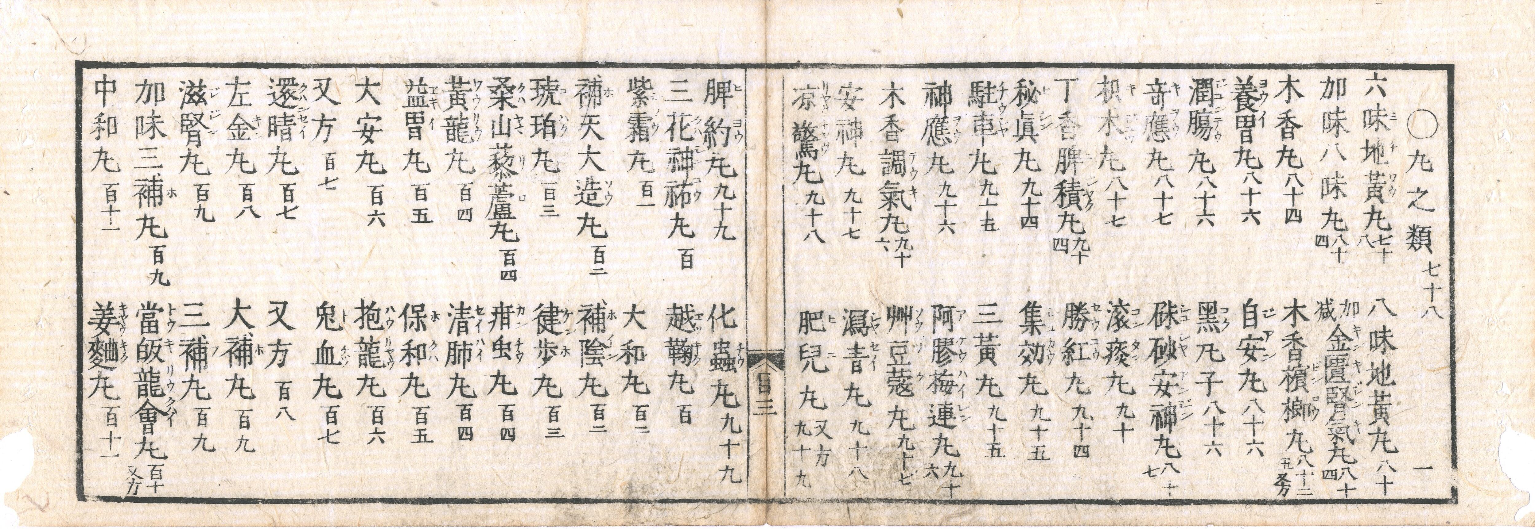 【備考】分類「薬物」。袋綴じ展開収録。本書は、江戸時代で最も詳しい部類の漢方薬辞典。巻頭には薬学の基礎知識を述べる。まず「湯散丸之解」で薬物における「散剤」「丸剤」「湯剤」の区別などを示し、「分両之定法」で調剤用の計量器や秤の単位、和漢における秤の違いなどに触れる。以下、「水ヲ用ユルノ例」「蜜ヲ練ルの法」「鍛錬煎煮火ヲ用ユルノ例」など合計13項を収録する。続く本文では、「円之類」(「牛黄清心円」以下43方)、「丹之類」(「延齢丹」以下53方)、「丸之類」(「六味地黄丸」以下203方)、「散之類」(「正舌散」以下143方)、「湯之類」(「十全大補湯」以下16方)、「雑方之類」(「屠蘇酒」以下8方)、「膏薬之類」(「万病無憂膏」以下6方)、「目薬之類」(「清明丹」以下5方)、「薬酒之類并雑方」(「八珍酒」以下12方)、の9分類で合計489方(見返には旧版(明和板であろう)で410余種とし、再刊にあたって69種を増補したとする)を収録し、それぞれ成分や効能、また、処方について詳述する。