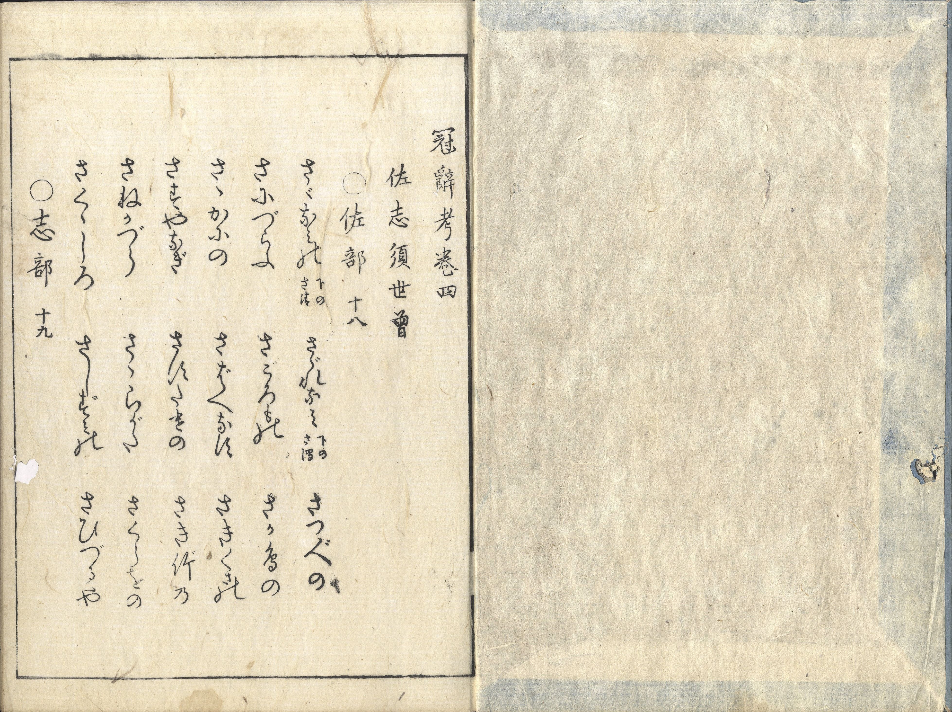 【備考】分類「語学」。後印本(書袋および第1・10巻)も抄録した。『古事記』『日本書紀』『万葉集』の枕詞326語(序文には「三百四十余」とある)を五十音順に配列して用例をあげ、枕詞の意味、被枕詞へのかかり方などを考証した書。序文に真淵の枕詞論が記されており、それによれば、枕詞はもともと音調を整えるためのものであったが、和歌の発達とともに修飾的性格を持つようになったとし、次に枕詞を5類に分け、さらに散文にも用いられることを指摘し、枕詞の価値を強く主張する(「日本古典文学大辞典」参照)。SE02451
