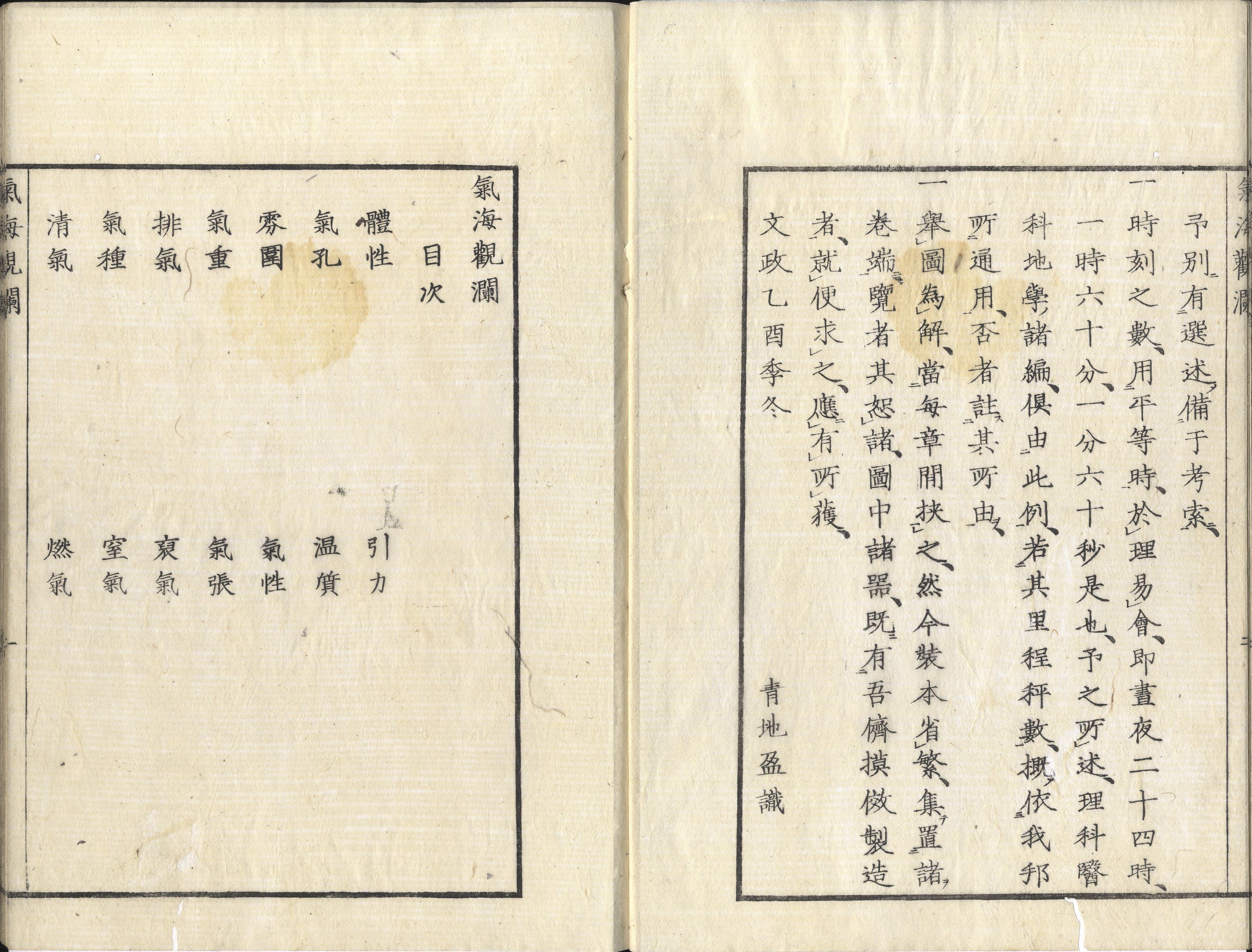 【備考】分類「物理」。日本最初の物理学書。青地林宗著。1巻。文政10年(1827)刊。西洋の理科書を抄訳し、物質の定義、力学や自然現象を図解して漢文で説明したもの。青地林宗(あおちりんそう)が1825年(文政8)に書き、27年に出版した日本で最初の物理的科学の刊本。桂川甫賢(1797‐1844)による序文4ページと凡例4ページ・本文80ページ・図6ページからなり、全文漢文で書かれている。〈凡例〉に、さきに西洋の理科書を渉猟し、格物綜凡若干編を訳述したが、そのうち〈気性〉数十章を抄し、気海観瀾と題し出版する、とある。その内容は、体性、引力、温質、気性、気種、窒気、清気、燃気、硬気、吸気、光、色、音、越列吉的爾(エレキテル)、気化、雲、雨、電雷、虹、水性、験水、潮汐等40項目にわたり、19世紀初頭ヨーロッパの物理・化学の基礎的知識が簡潔に記述されている(コトバンク)。 林宗(安政四‐寛政一二)は伊予松山の人 馬場佐十郎に蘭学を学び 天文台訳員となる この書は林宗が かねて泰西理科書より訳述しておいた『格物綜凡』のうち 「気性」に関する部を抄したものであり 我邦理科書の濫觴の一つである(日本科学古典全書)。SE02498