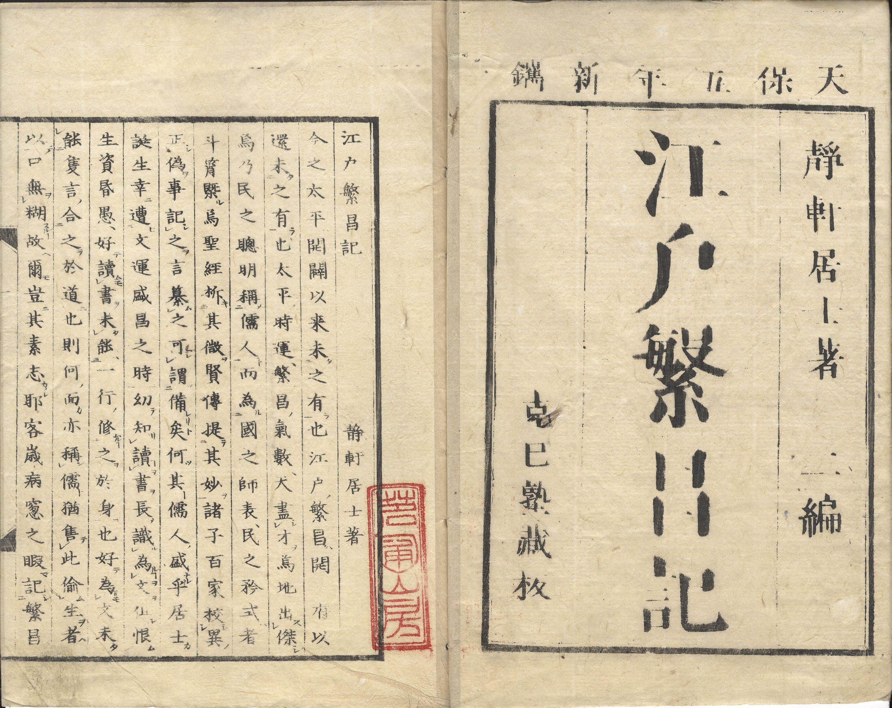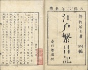 【備考】分類「地誌・随筆」。江戸後期の漢文戯作(げさく)。寺門静軒(てらかどせいけん)著。5編5冊。1832~36年(天保3~7)刊。さらに第6編は『江戸繁昌後記青楼之巻(せいろうのまき)』として41年刊。また第5編を書き継いだ『江戸繁昌後記』は初編・2編が78年(明治11)に刊行。浪人儒者の生活の資とするために書き始められた本書は、相撲(すもう)、吉原、両国烟火(はなび)といったぐあいに江戸の世俗の繁華を漢文で戯(ざ)れ書きするという新しい試みに大当りをとるが、作者生まれつきの皮肉な目と批判精神により、江戸期には希有(けう)の現実風刺の文学ともなり、そのために初編・2編がまず1835年に発禁処分を受け、懲(こ)りずに3編以下を刊行したため、天保(てんぽう)の改革(1841~43)にあたって作者はついに武家奉公御構(おかま)いの処分を受け、現実風刺の徹底した『江戸繁昌後記』は明治の新政府の下でなければ刊行しえないこととなった。幕末・明治期には本書の評判に倣って、「繁昌記もの」とよばれる一分野ができたほどである(コトバンク)。SE02080