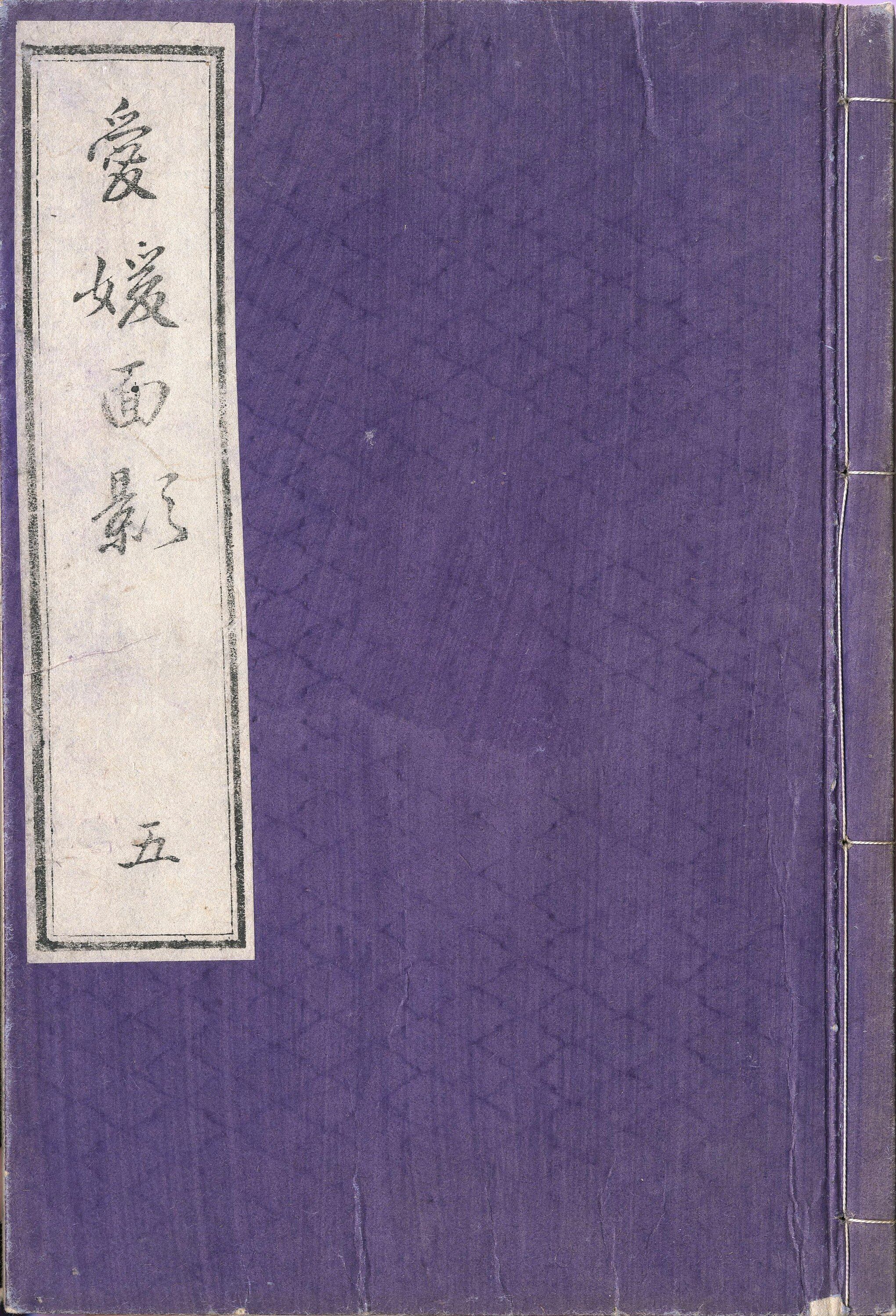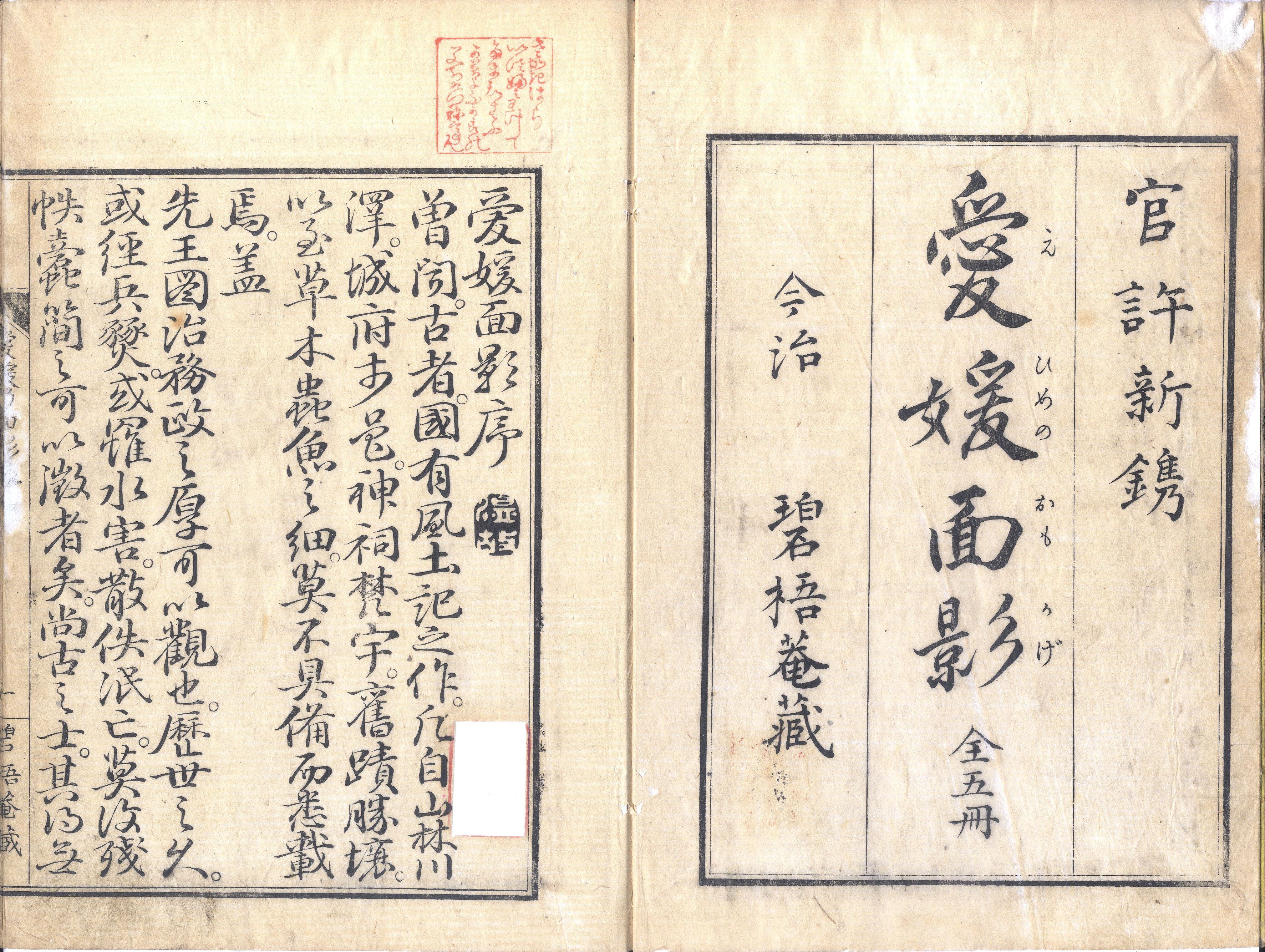 【備考】分類「地誌」。明治43年後印本も抄録した。本書は伊予国の地誌で、伊予版の名所図会。1巻は宇摩郡・新居郡・周布郡・桑村郡、2巻は越智郡・野間郡、3巻は風早郡・和気郡・温泉郡、4巻は久米郡・伊予郡・浮穴郡・喜多郡、5巻は宇和郡。愛媛県生涯学習情報システムHPによれば、愛媛県は明治6(1873)年2月20日に誕生したが、新県名に「愛媛」を採用した背景には今治藩医・国学者の半井梧庵(1813-89)が編纂した地誌『愛媛面影』の存在があった。そもそも「えひめ」という名称は、『古事記』に「伊予国をえひめ愛比売と謂ふ」と記された女神の名前に由来する。「愛比売」に「愛媛」の文字を当てたのは『愛媛面影』が最初で、いわば梧庵は「愛媛の名付け親」であったが、このことは一般にあまり知られていない。本書は近世伊予国の代表的な地誌で、愛媛の地方史・地域史研究の源流として位置づけられる。梧庵は古代の「伊予国風土記」の散逸したのを嘆き、自らの地理認識及び歴史観のもとで、伊予国全域を対象とする私撰の一国地誌『愛媛面影』(5巻5冊)を明治2(1869)年に刊行した。その作成にあたって梧庵は、多くの先行文献を調査し、自ら伊予国内の社寺・旧跡を訪ね、実地踏査にも力を注いだ。本書の最大の特色は、近世後期に古き伊予国の面影を追究し、当時全国的に流行した名所図会のスタイルにならって文字と図版で記録化した点にあった。特に実物実景の写生をもとに分かりやすく描いた図版は、近世後期の伊予の姿を現代に生き生きと伝えている。