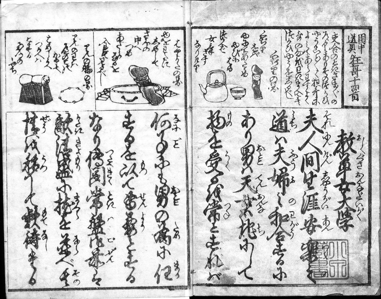 【判型】中本1冊。縦176粍。【作者】婦好亭作。【年代等】江戸後期刊。刊行者不明。【備考】分類「往来物」。異本も全冊収録(モノクロ画像)した。分類「艶書」。『女大学宝箱』をもじった艶本の一つ。池田英泉作『教訓女才学』と本文がほぼ同じであり、その海賊版と思われるが未詳(「婦好亭」は英泉と同一人物の可能性もある)。『国書総目録』には、『教訓女才学(絵抄)』は、天保7年、婬男亭助成(好成)の作とするから、本書も天保以降の刊行に違いない。『女大学』になぞらえて綴った性生活の手引き書で、「何事にも男の為に任する」という立場から夫婦和合の道や性愛における女性心得を、主に性交の順序に沿って説く。本文が女性向けに書かれているのに対し、頭書はもっぱら男性向けの記事となっており、「〈閨中道具〉狂歌十四首」「娘を口説伝」「後家を口説やう」「子持を口説伝」「婢女を口説伝」「婬婦にこしをぬかする伝」を掲げる。なお、本書同様の艶本として、早くは宝暦年間刊『女大楽宝開』や、その模倣である江戸後期刊『開宝女大学(茎訓女大学)』がある。SE02241