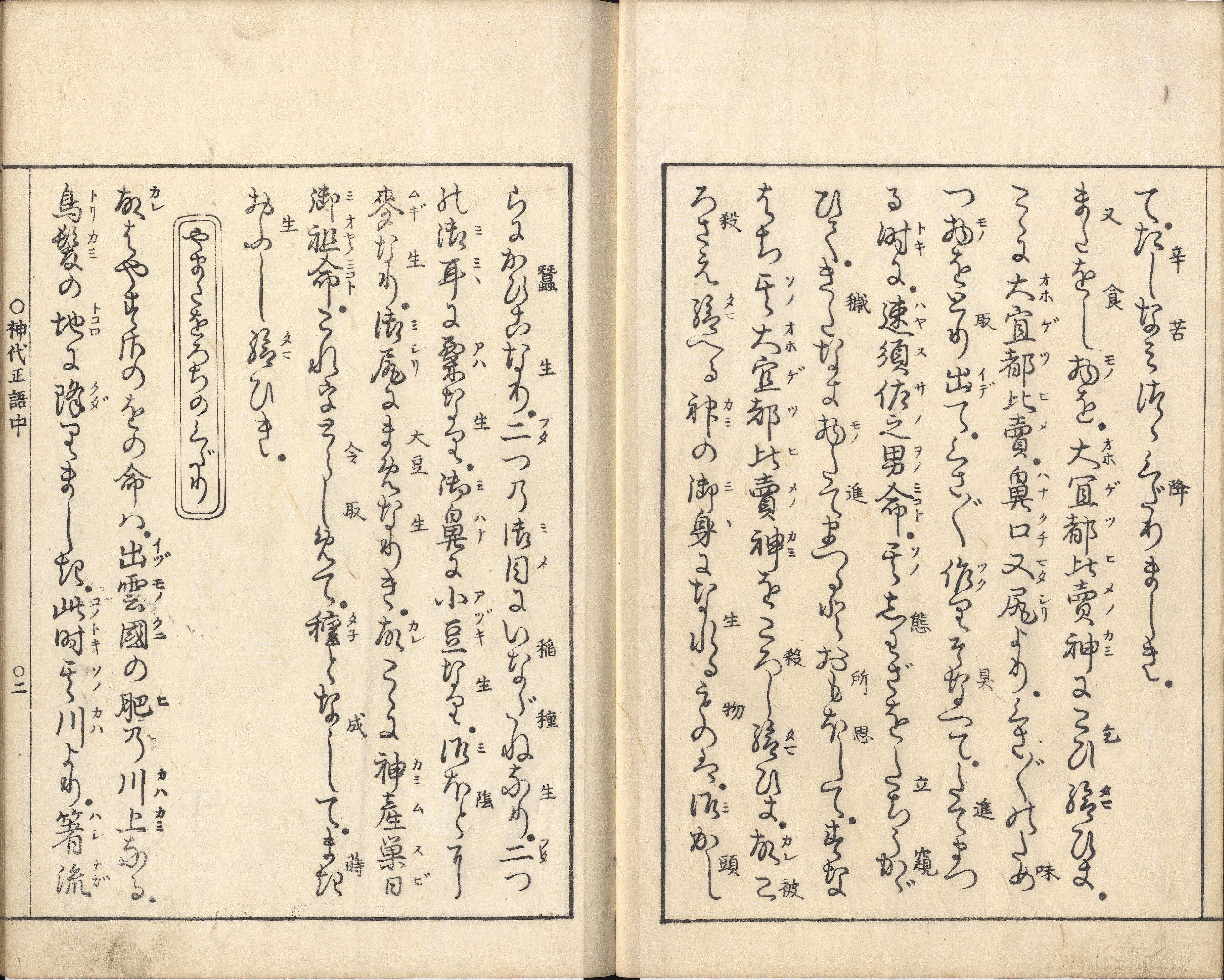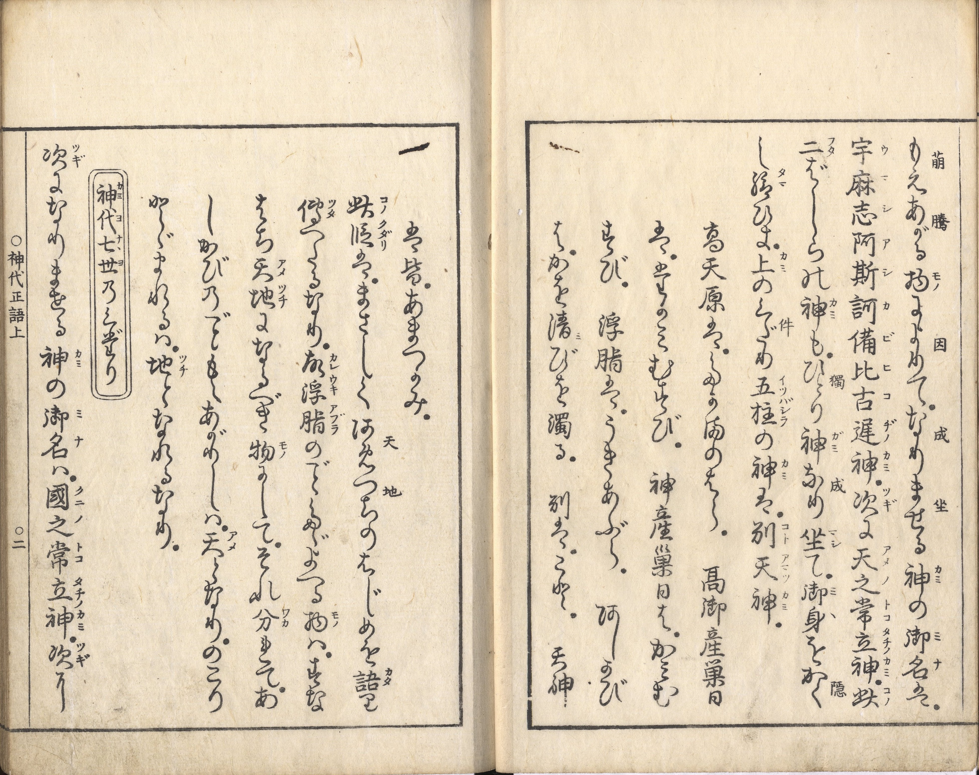 【備考】分類「国学」。同板別本も全冊収録した。『神代正語常磐草』は、本居宣長の『神代正語』(上代古雅の国語仮名文で、『古事記』の神代の事を記したもの)に略注を施し、かつ、しばしば挿絵(色刷り数葉含む)を施したもの。編者の細田富延(1783-1828)は、江戸後期の国学者で、天明3年生まれ。出雲国(島根県)の千家俊信(センゲトシザネ)の門で学んだ。著作に『神代正語常磐草』など。文政11年1月3日死去。46歳。伯耆国(鳥取県)出身。通称は喜太郎。号は玉の舎。