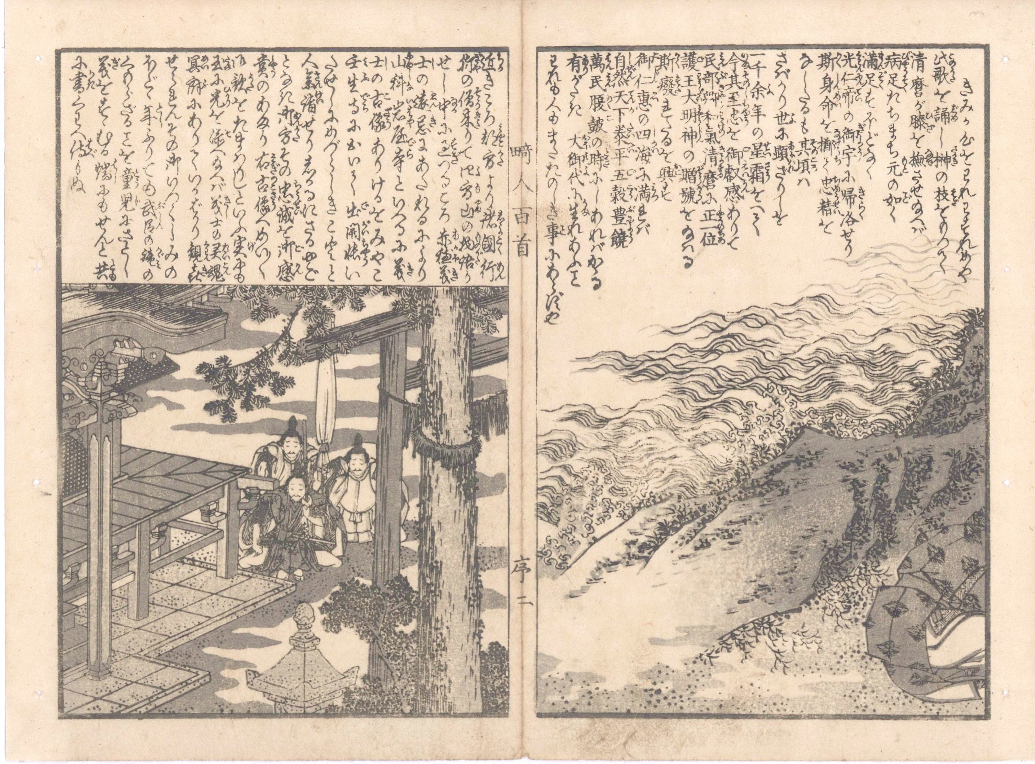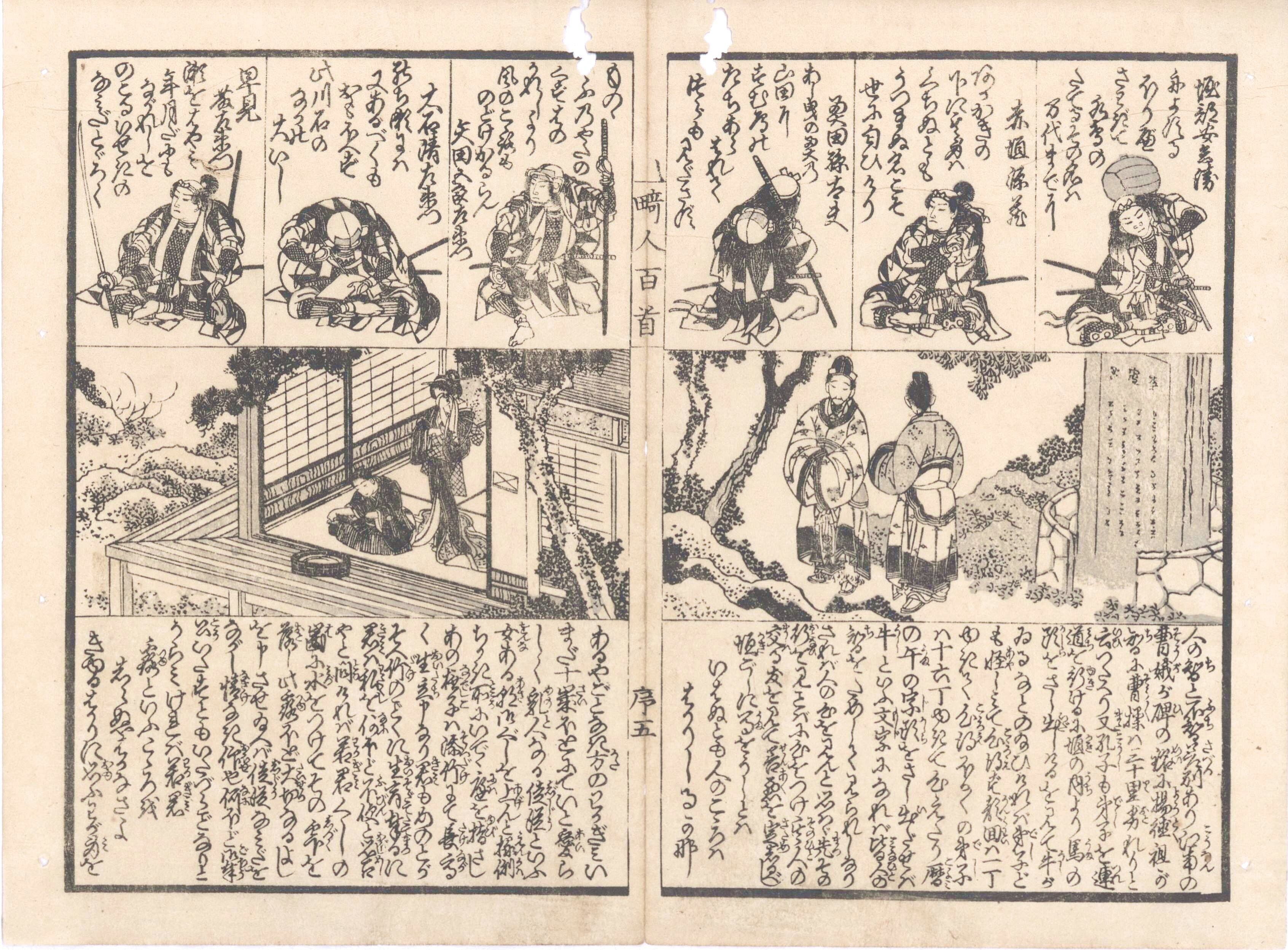 【備考】分類「和歌」。袋綴じ展開収録(見開き図再掲)。『畸人百人一首』は、「常磐なる 松を霞の 色そへて なほかづまさる 春の一入」(渡会常政)から「千早ふる 天の岩戸の あけそめし 日かげの桂 さやかにぞみる」(伊勢貞丈)までの100首を収録した異種百人一首。頭書に歌人の略伝を掲げる。前付に「和気清麻呂故事」「山科岩屋寺赤穂義士像」「左京太夫顕輔卿故事」「民部丞実重故事」「鴨長明故事」「人の智・不智の事」ほかを載せる。SE02512