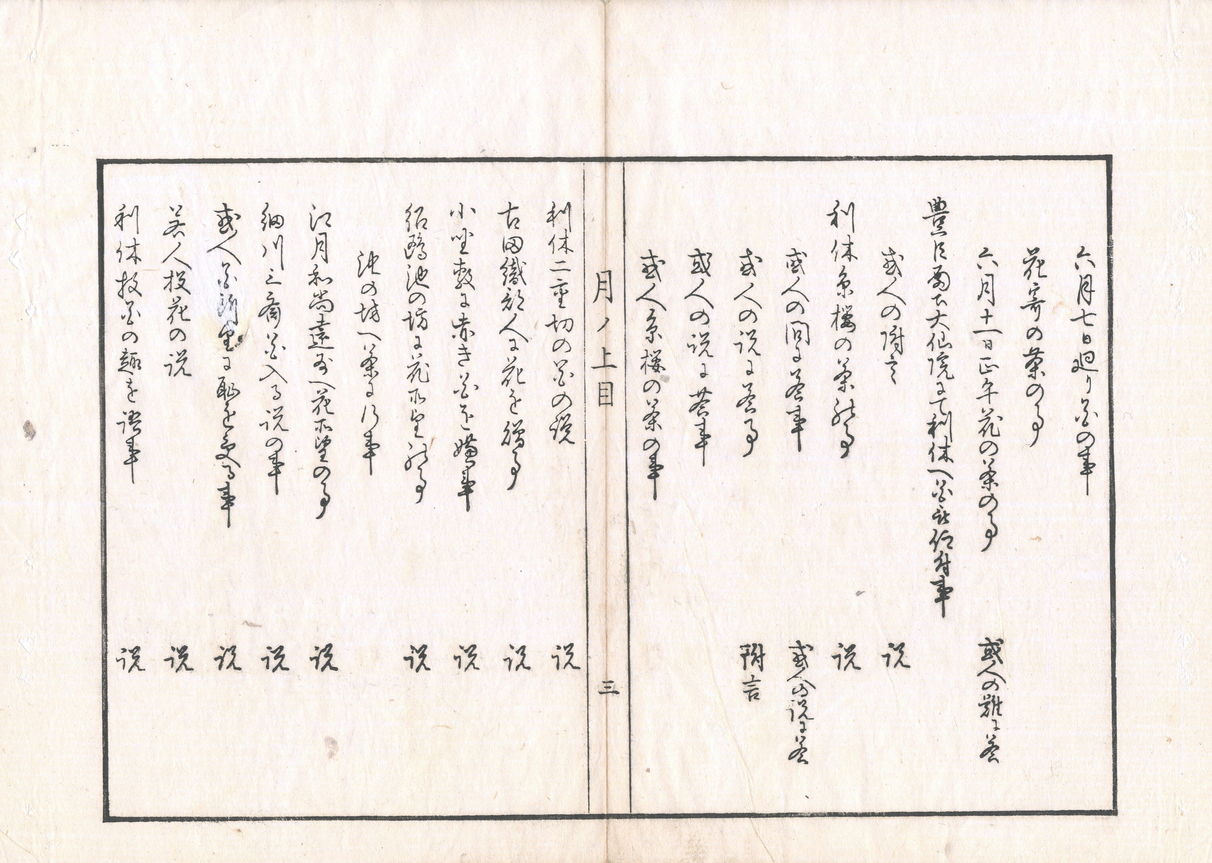 【備考】分類「茶道」。袋綴じ展開収録。見返に「此書、一名『指掌編』は、日本茶道博士、速水宗近の随筆茶話にして、先哲名家の小伝をあらはし、其外この道の心得たるべきをしるせしなり」とある。茶道の故事や茶人の小伝、茶事の伝承等に関する様々な言説を集めた書。上巻に「豊臣殿下雪の暁、針屋宗春へ御成の事」以下74項、中巻に「後西院帝御茶の事」以下101項、下巻に「秀吉公短檠の置所を問給ふ事」以下70項を収録する。