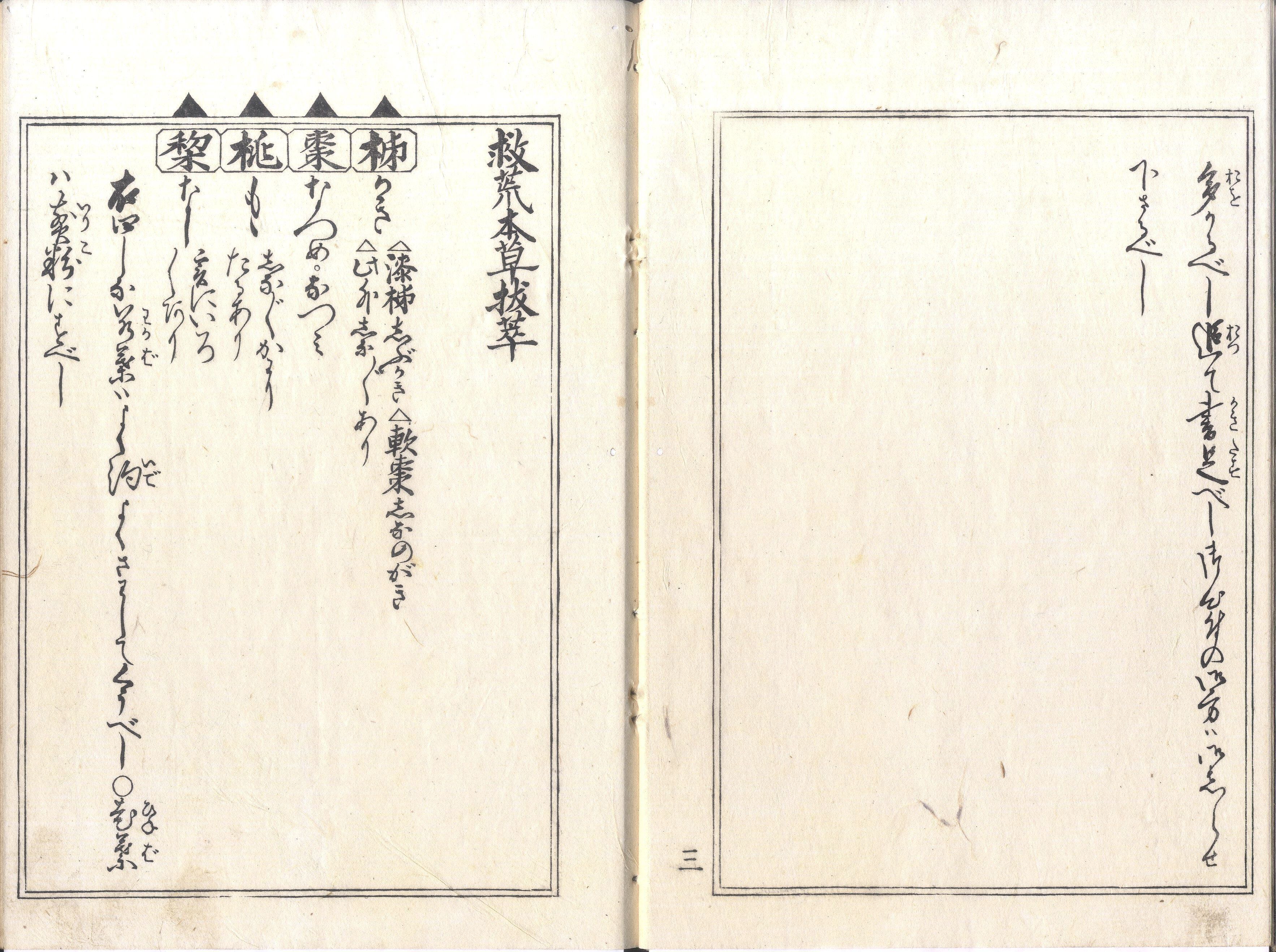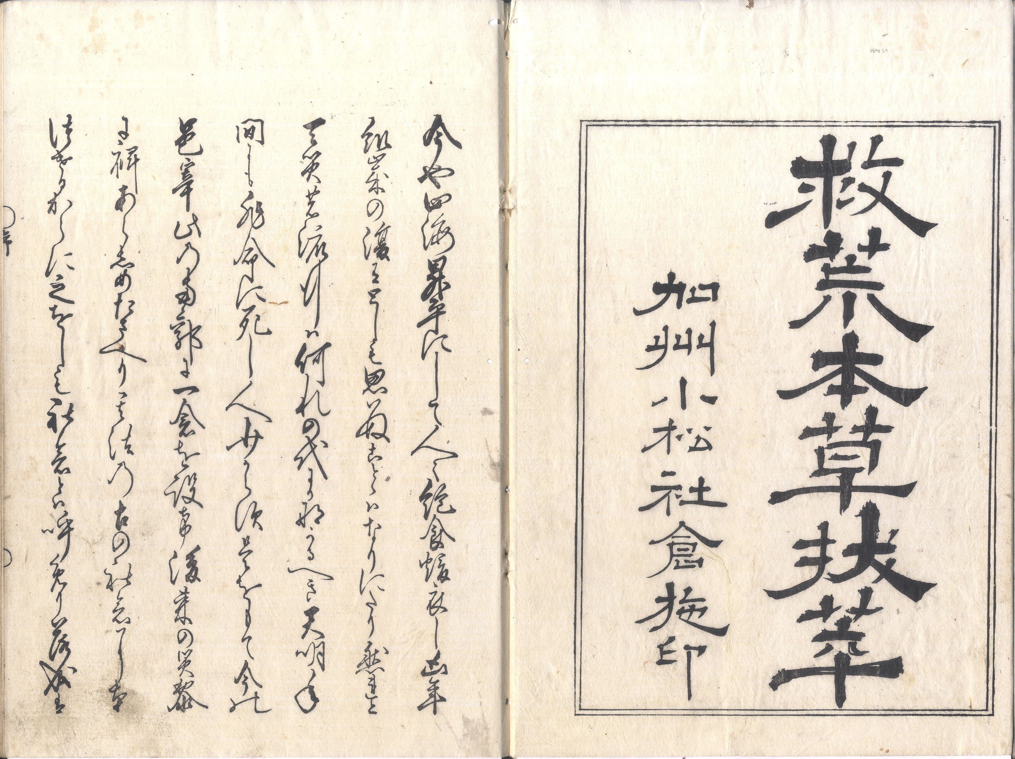 【備考】分類「本草」。凡例によれば、『救荒本草』や『救荒野譜』等には約500種の救荒食物(飢饉時に代用食となり得る植物)を掲げるが小松藩内では入手できないものや、文献の記述と味が異なるものなどもあるため、それらを除き、『本草啓蒙』を典拠に同地方で調達しやすい救荒食物の食用の可否やか調理・加工法、味覚・効能・禁忌などを記したもの。収録した救荒作物は、木類47種、草類96種、菜類12種で、合計155種。末尾の附言で若干の情報や心得を補う。SE02542