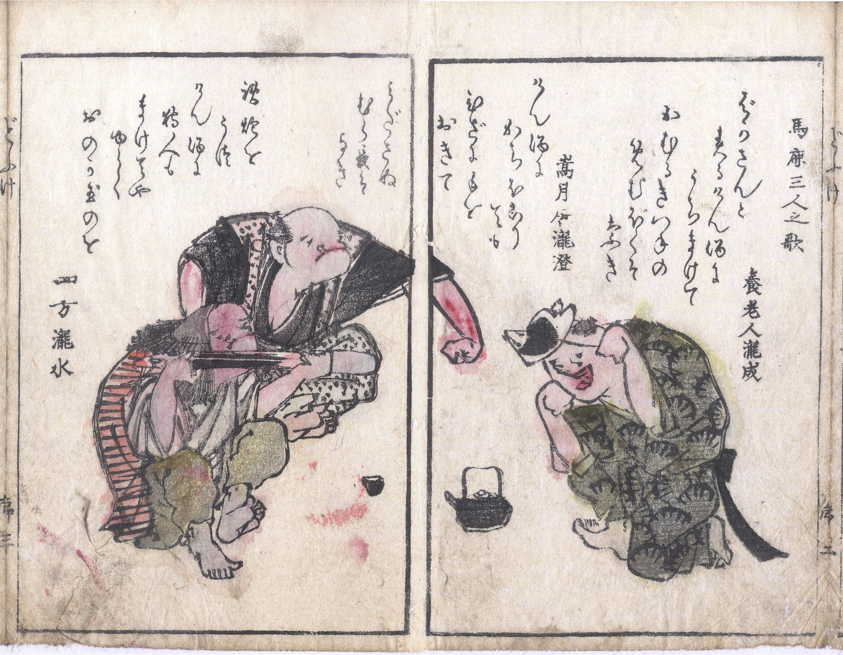 【備考】分類「狂歌」。完本には手彩色などがあるため同板別本(数丁落丁)も全冊収録。いずれも袋綴じ展開収録(見開き図は再掲)。『狂歌百人一首泥亀(スッポン)の月』の改題本。小倉百人一首をもじった『狂歌百人一首泥亀の月』。江戸庶民の哀歓を詠い上げた江戸のもじり歌には、現代社会にも通じる面白味がある(「BOOK」データベースより)。また、東洋大学百人一首コレクションの解説に「叙末に「丙子春日」「文政四巳年亥冬日応需写之」とある。小倉百人一首の下句をそのまま活かし、それに合うように上句を当世風にもじり、狂歌に仕立てたもの。各首に一画ずつ歌意に合った彩色戯画を配す。半丁に作者名・狂歌・彩色戯画が余裕をもって配置されている。数か所に錯簡がある。改題本に『狂歌百人一首泥亀農月』(きょうかひゃくにんいっしゅすっぽんのつき)、本展示本以外に文政11年(1828)書写本と天保4年(1833)刊本(四方瀧水編、保永堂板)がある」とある。口絵に「馬鹿三人之歌(養老人滝成・嵩月房滝澄・四方滝水)」を掲げる。SE02561