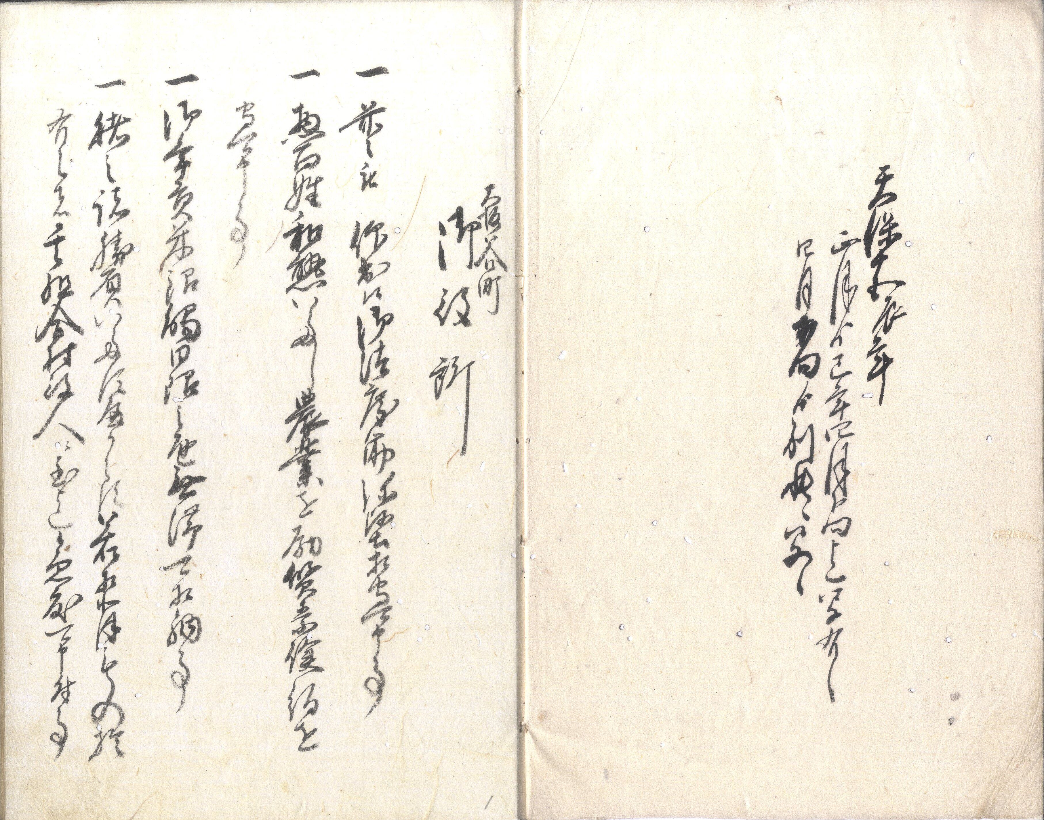 【備考】分類「法制・記録」。上記数カ月の各方面からの触書、年貢その他に関する諸記録。墨付き表紙とも55丁(110頁)で、多彩な記事が含まれ、興味深い。