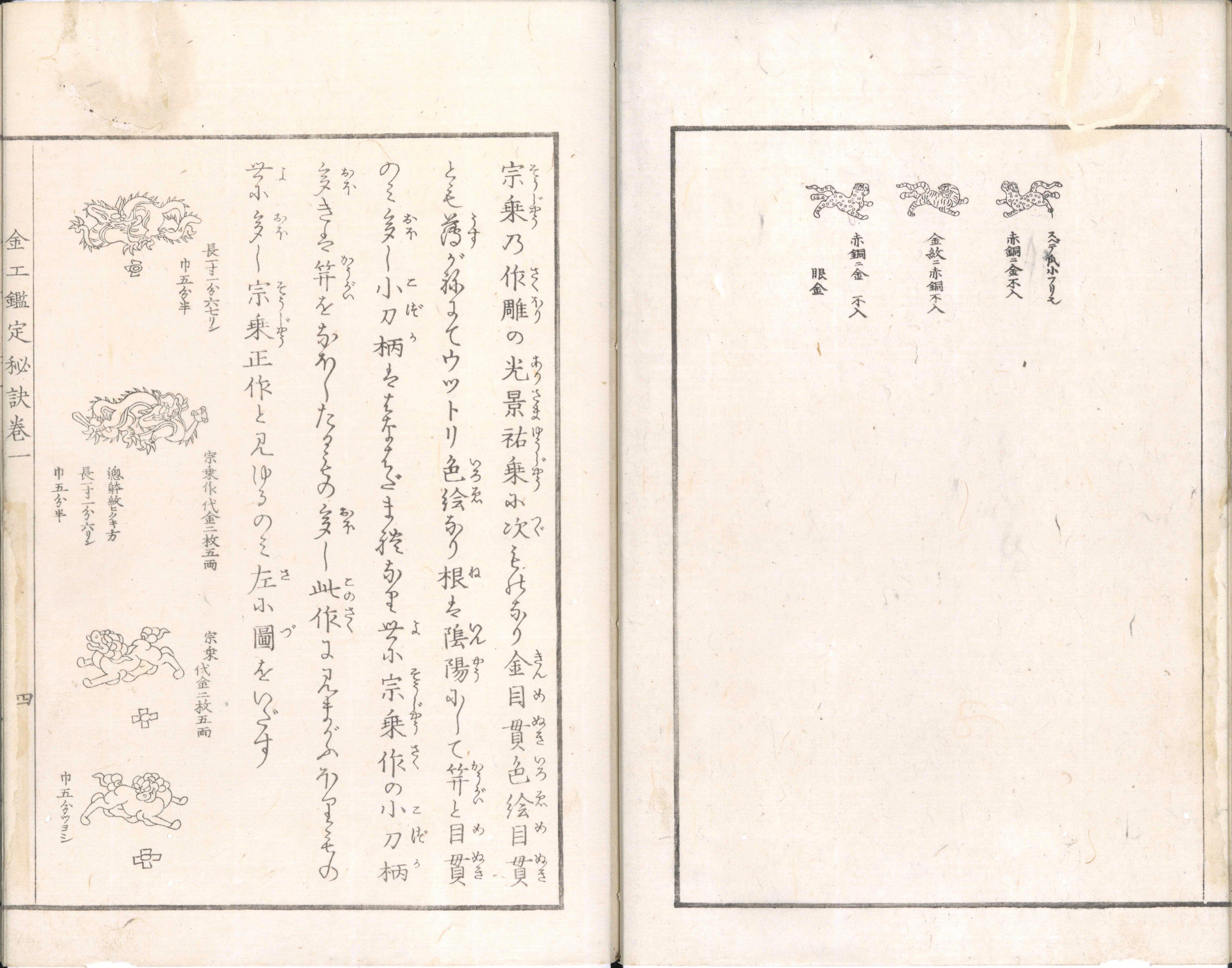 【備考】分類「金工」。剞劂:渋谷誠華堂。本書に挿入されていたメモも末尾に収録した。『金工鑑定秘訣』は、凡例によれば、後藤家彫刻の秘伝や見所を精しく紹介した金工鑑賞事典。また、凡例では、実物と模写の違いや鑑定の心得などにも触れるが、目利きの秘訣・秘事は一概に言葉で説明し難いとも付け加えている。/巻1は後藤家代々の目貫類金工の原寸大模写図録。巻2は鑑定の要点や諸金工落款を示す(西尾市岩瀬文庫・古典籍書誌DB)。SE02597