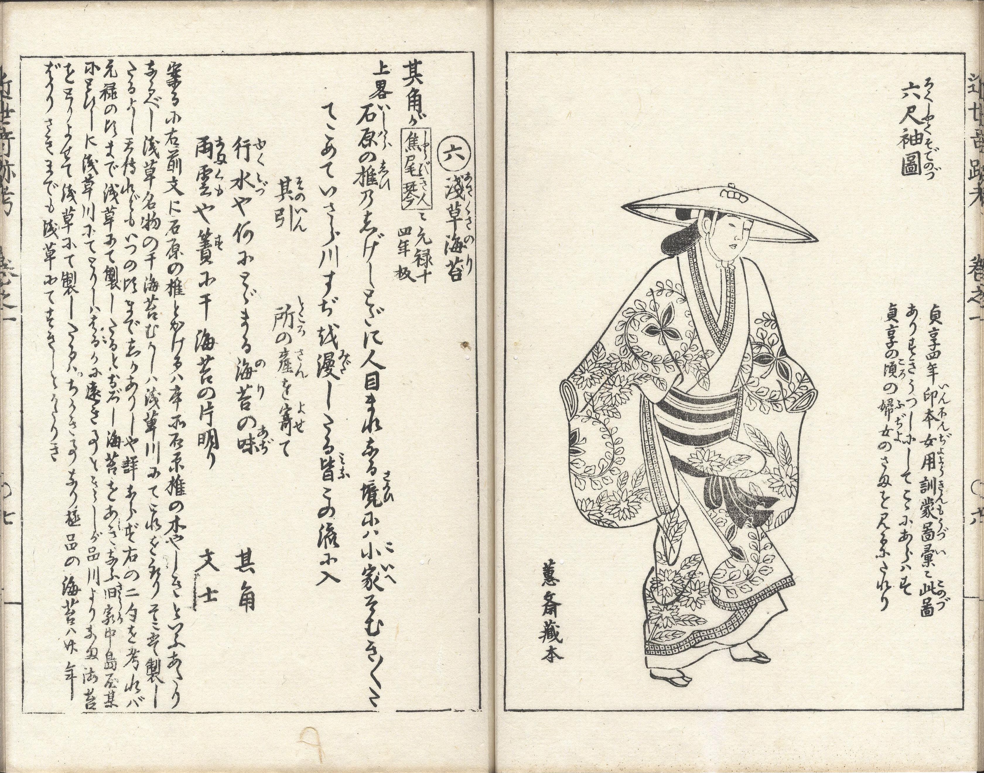 【備考】分類「随筆」。京伝の考証随筆である。凡例によれば、古い時代の考証は良くされるが、さほど昔の時代ではないため疎かに扱われがちな近世初期の事物について、考証したという。また考証にあたっては、些細なことでも典拠が得られなければ載せない、“奇を好むにすぎて、あらぬ虚譚(きょだん)を述べ、考え疎かにして口碑の誤りを伝うる説と同じく見ることなかれ”とあり、考証内容に自信のほどが窺える(東京大学附属図書館HP)。SE02599