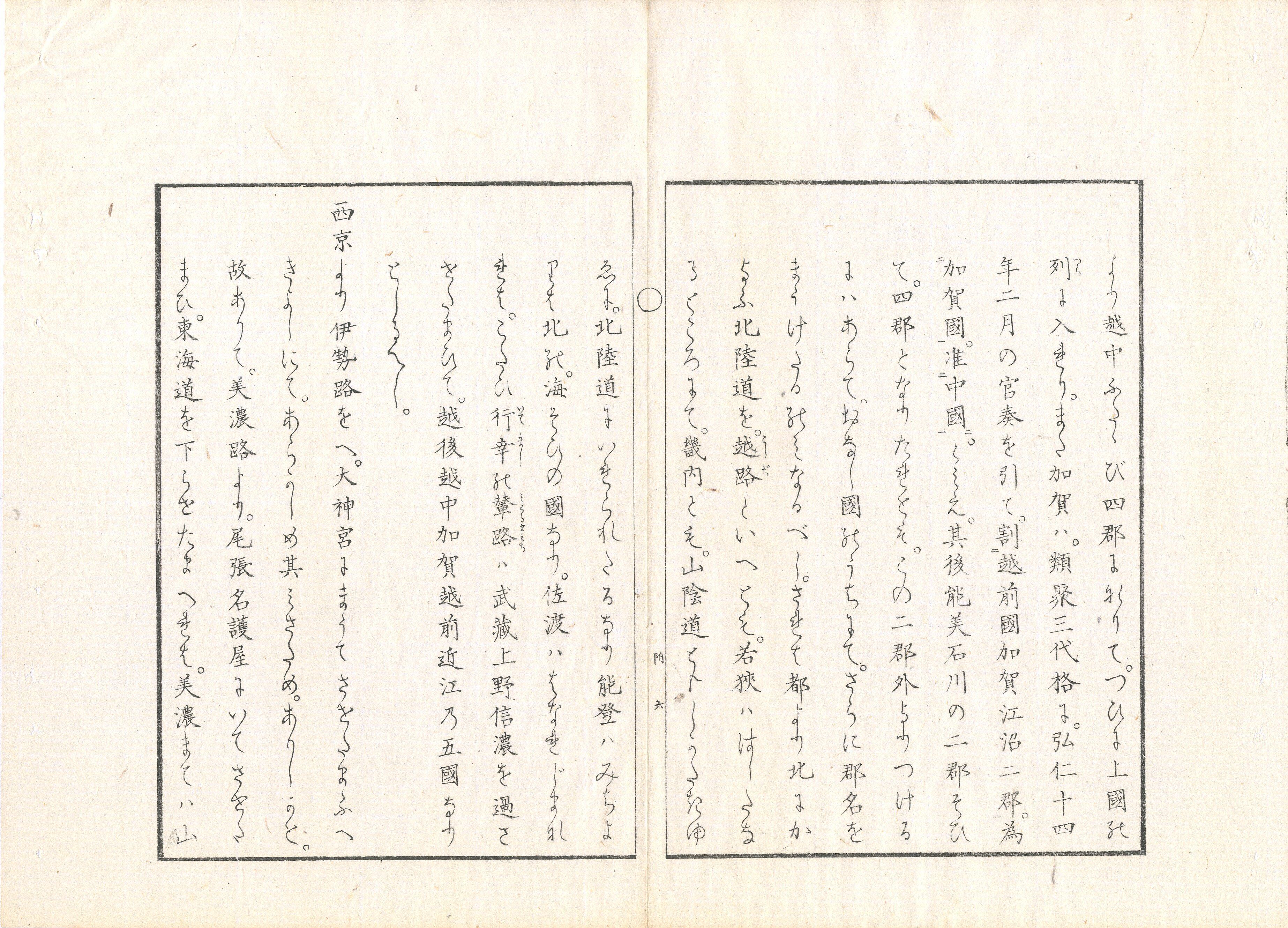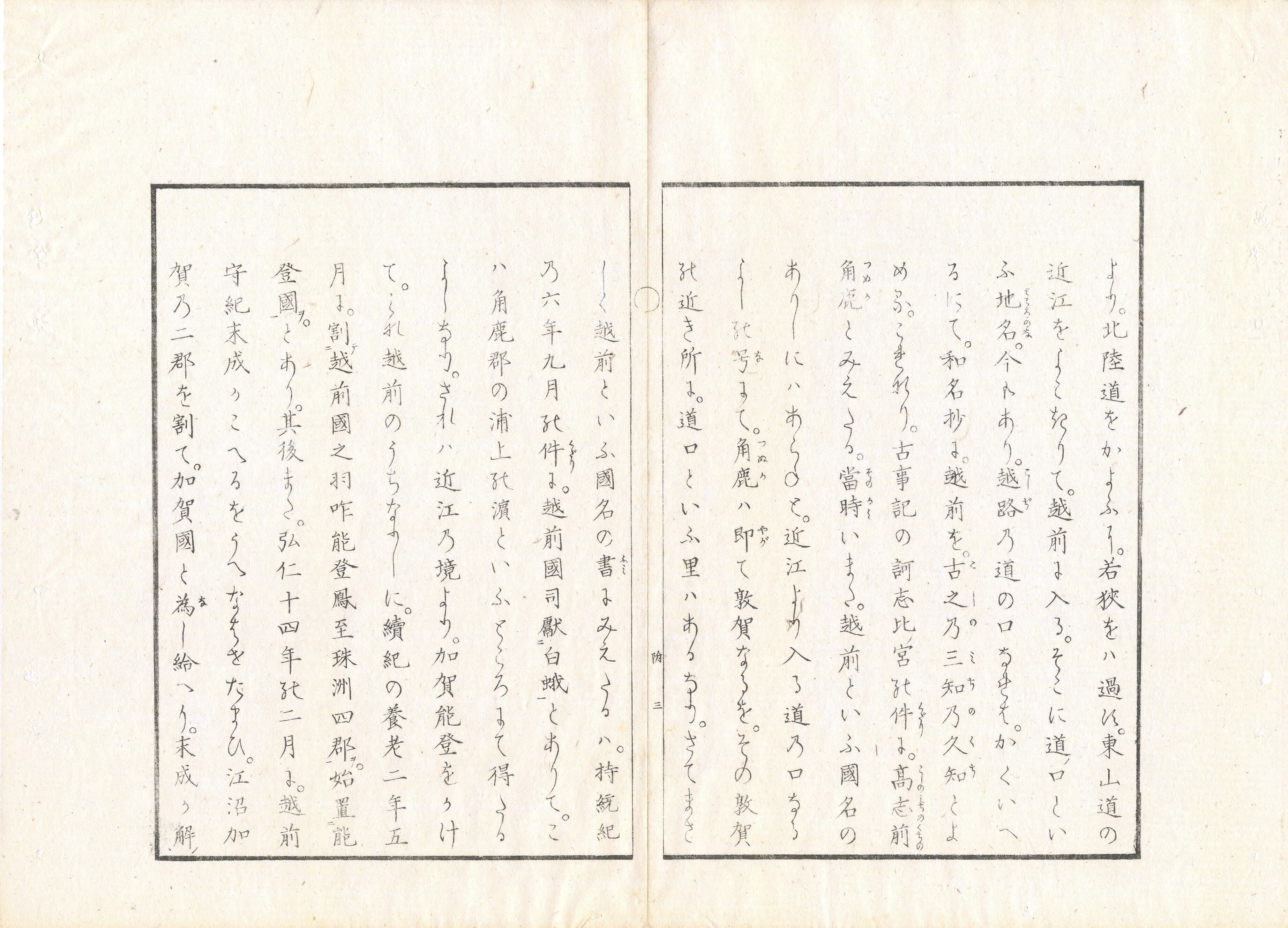 【備考】分類「紀行・地誌」。袋綴じ展開収録。明治11年(1878)の天皇の北陸巡行に随行した作者が、各地の古来の伝承などを紹介しつつ、それに対する感想、或は反論を述べたり、和歌を詠むなどしている。国学者である作者の、「万葉集」を始めとする様々な文学についての豊富な知識を活かした、鋭い意見が随所にみられる。作者が関心を持つ場所も、一般的な名所のみならず、そのような知識に基づくものがある点も興味深い(奈良女子大学学術情報センターHP参照)。