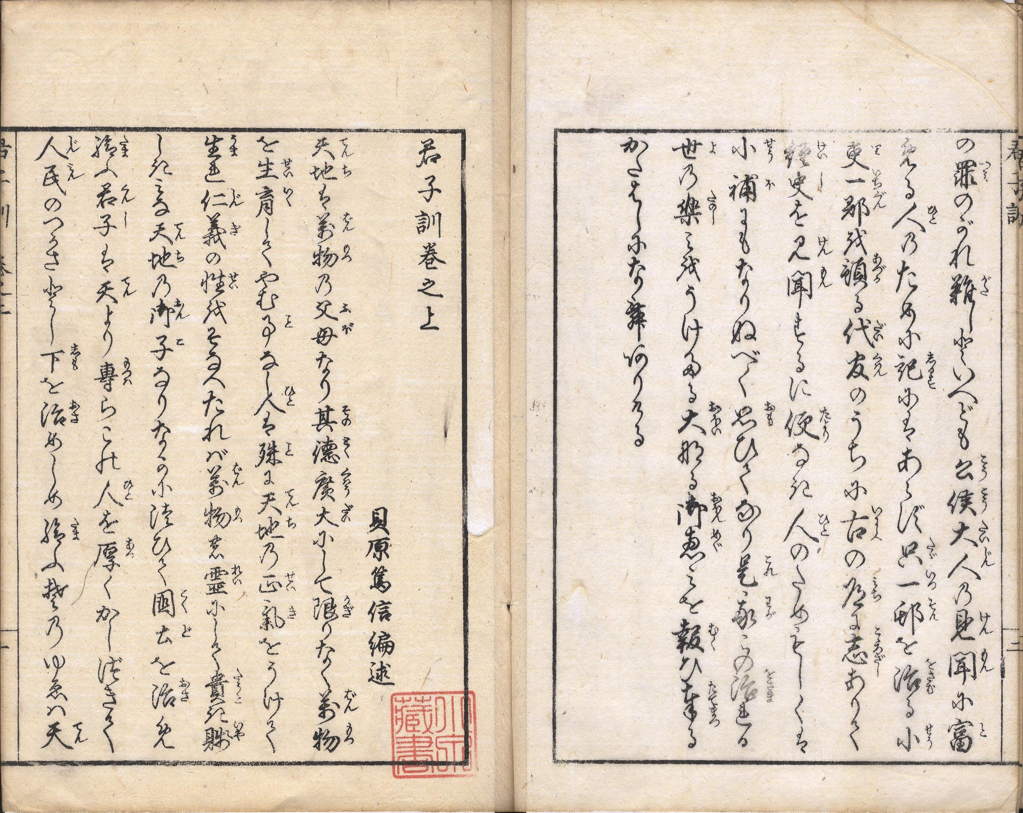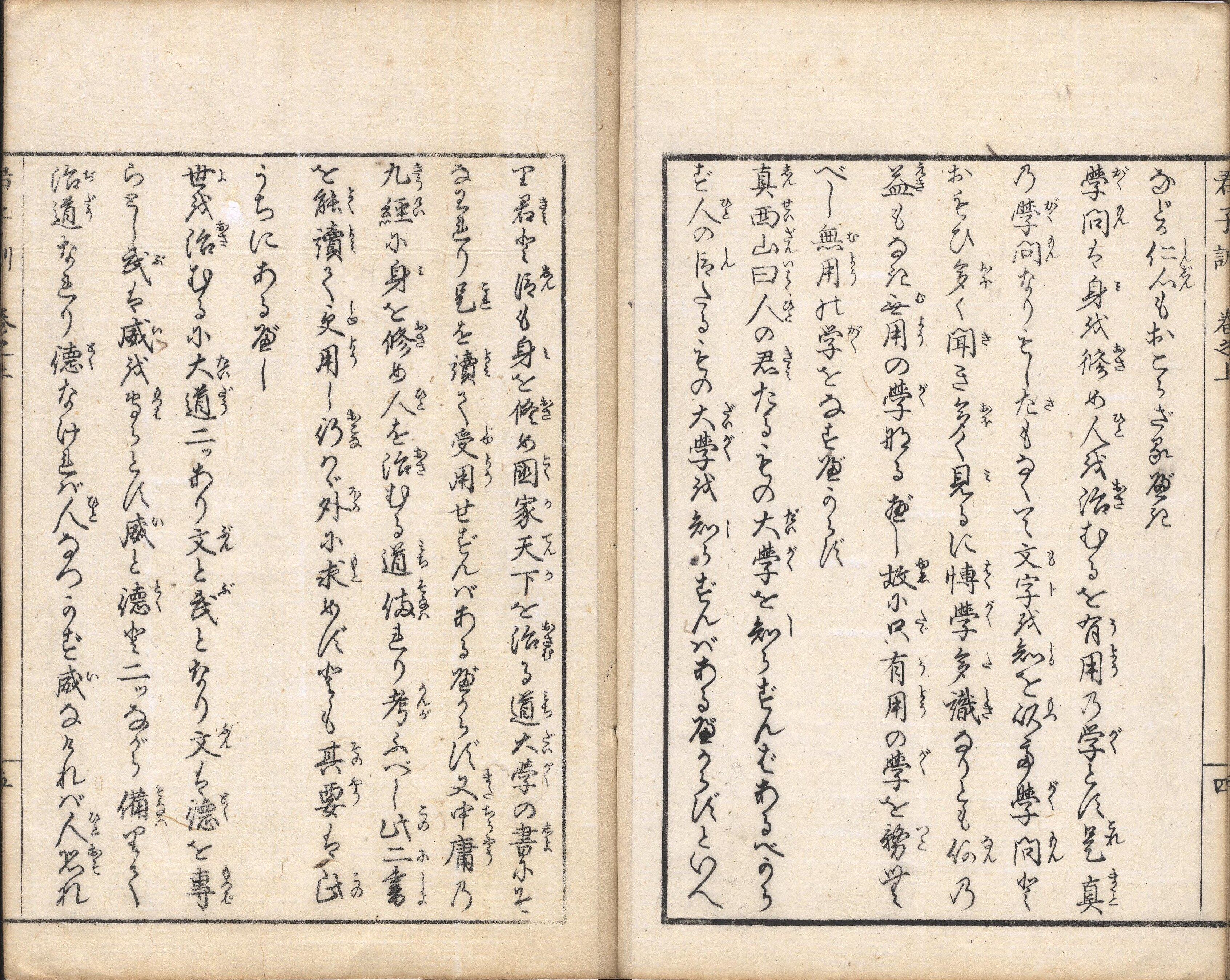 【備考】分類「儒学・教訓」。治民経済の道を論じた書。自序に「公侯大人の見聞に富める人のために記すにはあらず、只一村を治むる小吏、一郡を預かる代官のうちに、古の道に志ありて、経史を見聞するに便なき人のため」に記したとあるが、主として経史を引用して、平易に経済の道、民を治める法、古の道を述べたもので、その太平の世に生をうけたことを感謝しつつ、なぜ、そのような太平の世となったか、恵みの原因を追求し、それに報いるよう努力すべきことを説く(「日本思想史文献解題」参照)。なお、本書の初刊は天保13年8月板(夜須郡曽根田村・佐藤藤右衛門蔵板)で、天保14年板とは全くの異板。村主、村役人などといった人々の為の訓えを述べたもの。所謂益軒十訓の内の一書(福岡大学HP参照)。