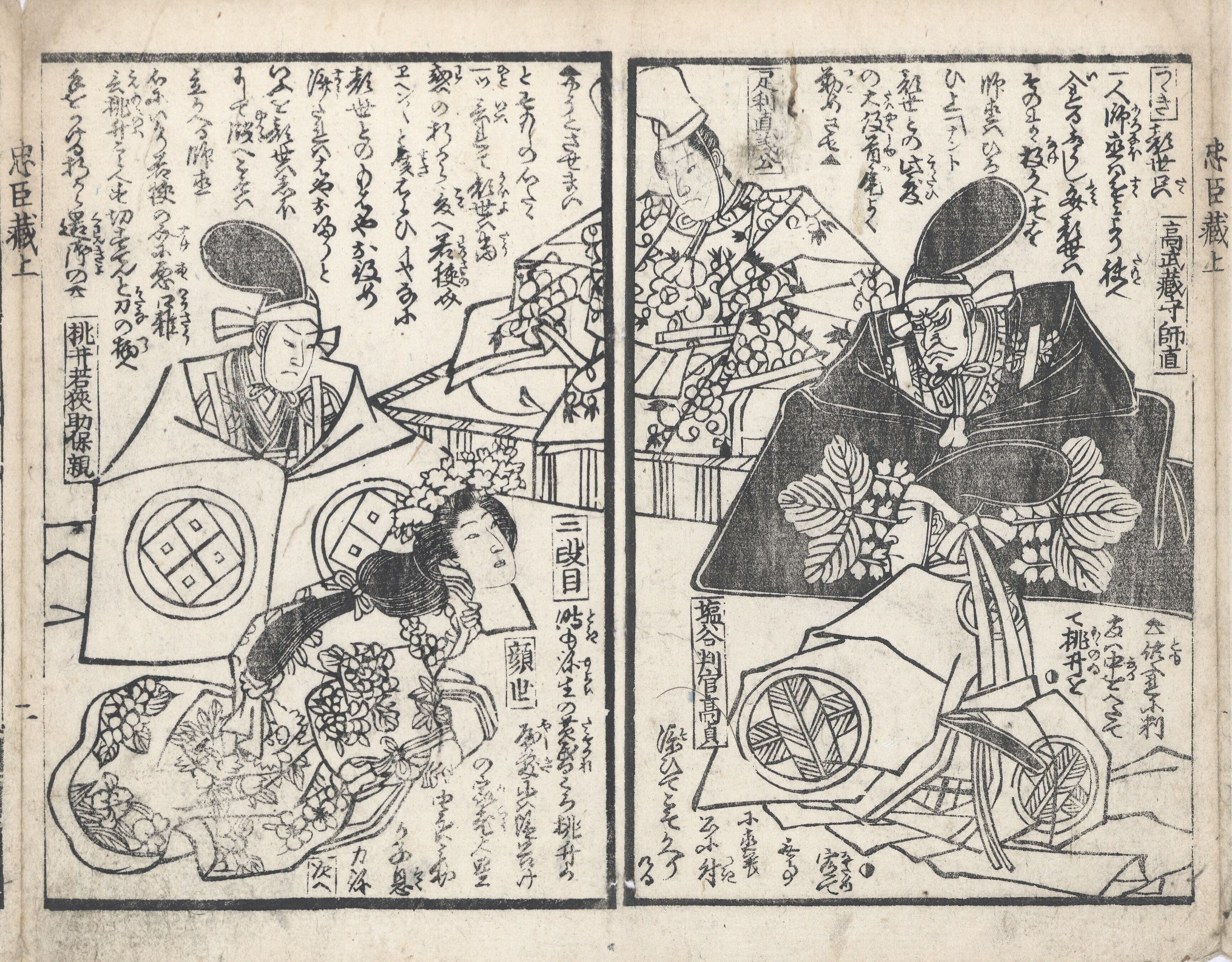 【備考】分類「合巻」。二世竹田出雲らによって作られ、江戸中期以降に上演された浄瑠璃・歌舞伎の代表的作品であり、赤穂浪士を劇化した元禄以後の作品の集大成とされる「仮名手本忠臣蔵」を合巻仕立てにしたもの。赤穂義士事件を素材とし、時代を室町時代におきかえ、全11段で構成した。塩谷(冶)判官が高師直の無礼に堪えかねて刃傷に及び、その身は切腹。忠臣大星由良之助が苦難の末、同志とともに師直邸に討ち入り仇を討つという筋の展開や人物設定にすぐれ、各段ごとに見せ場があり、大好評を博した。歌舞伎でも上演され、演出上のくふうがこらされ、数多い上演を通してますますねりあげられ、日本人の心をとらえる名狂言として上演回数は数えきれない(コトバンク参照)。SE02672