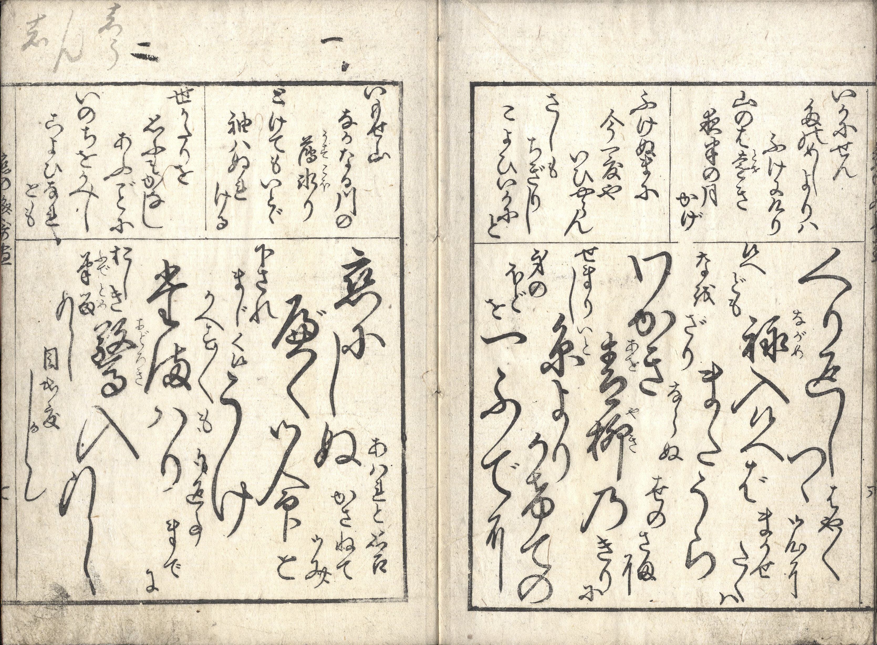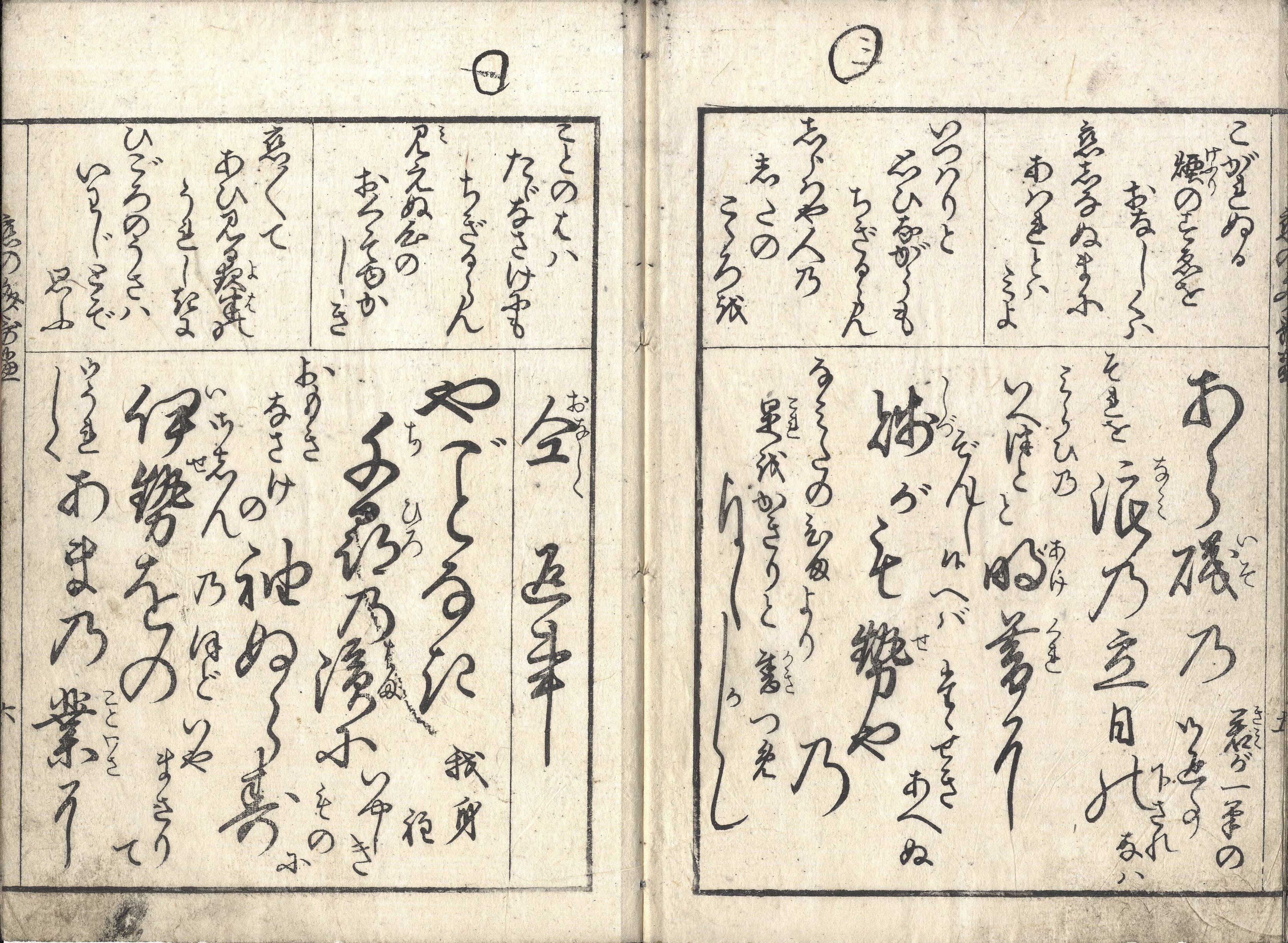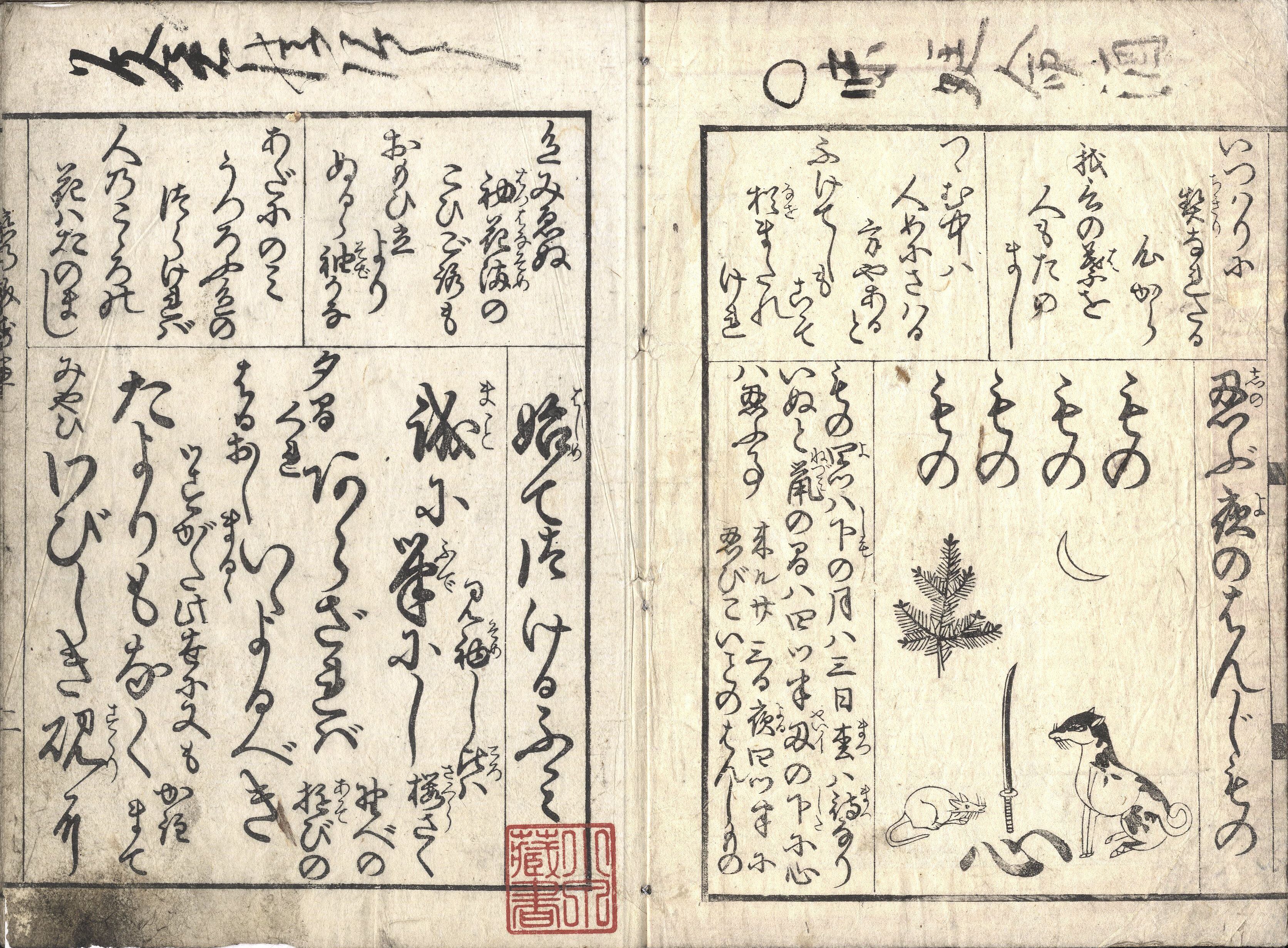 【備考】分類「艶書・往来物」。異板および異本を含め3種を全冊収録した。見返しに判じ物(忍ぶ夜のはんじもの)を掲げる。SE02704