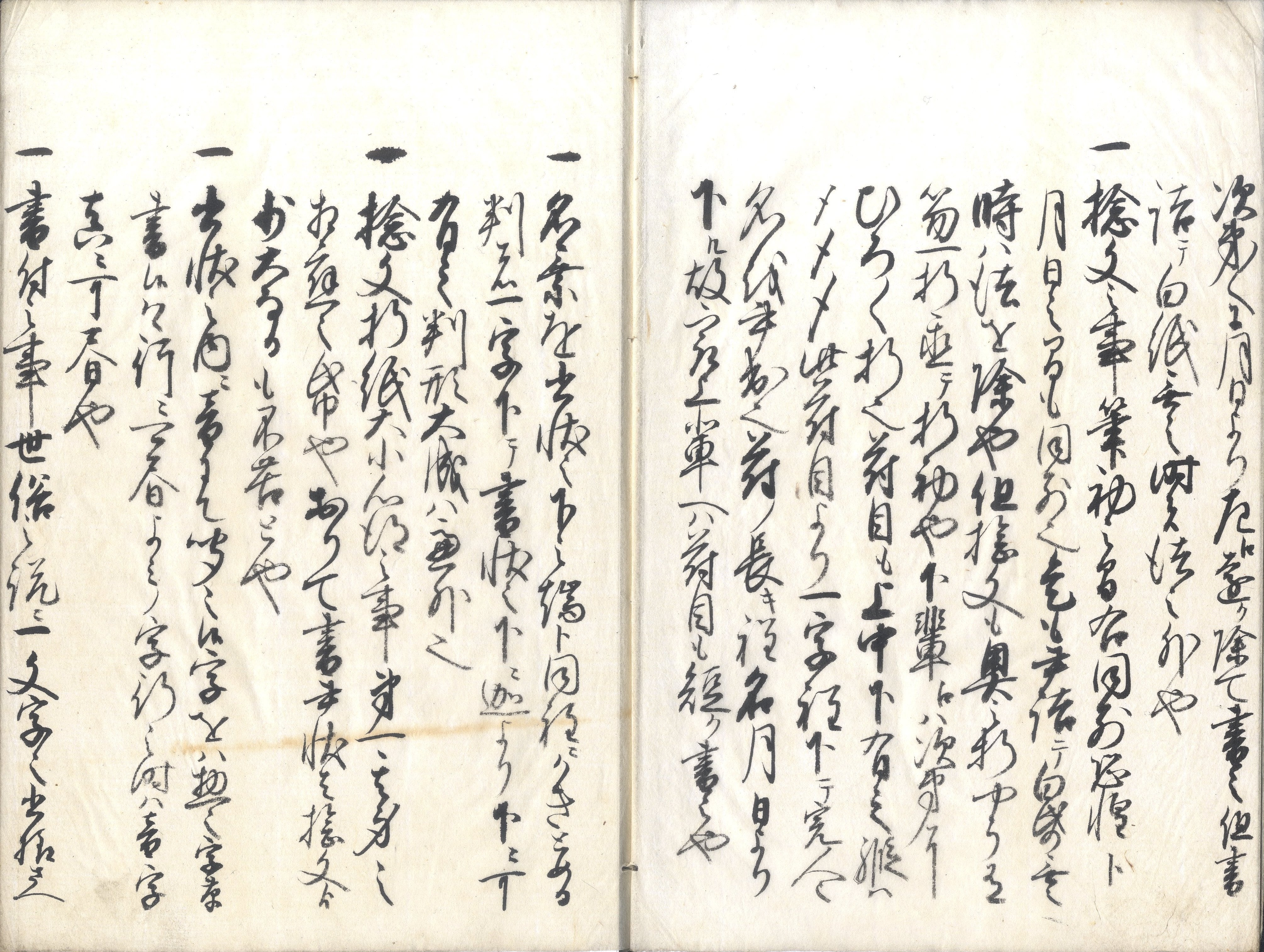 【備考】分類「有職故実」。武家書札礼の要点を記した書。両紙、捻文、名乗、捻文・折紙大小、字音・字訓、書付、一の字、祝儀状、料紙の定法、料紙の長さ、捻文、端書、追而書、僧家書状、年号書き、色紙、月日付、料紙上下余白、高人の名、国越の書状を始め、歌書の外題書き、弔状、太刀目録、親王連判、捻文・結文など