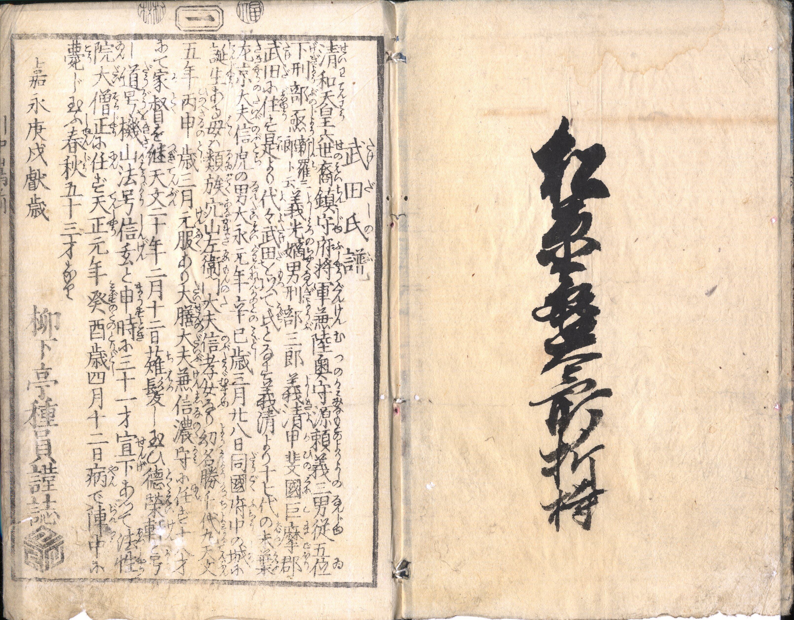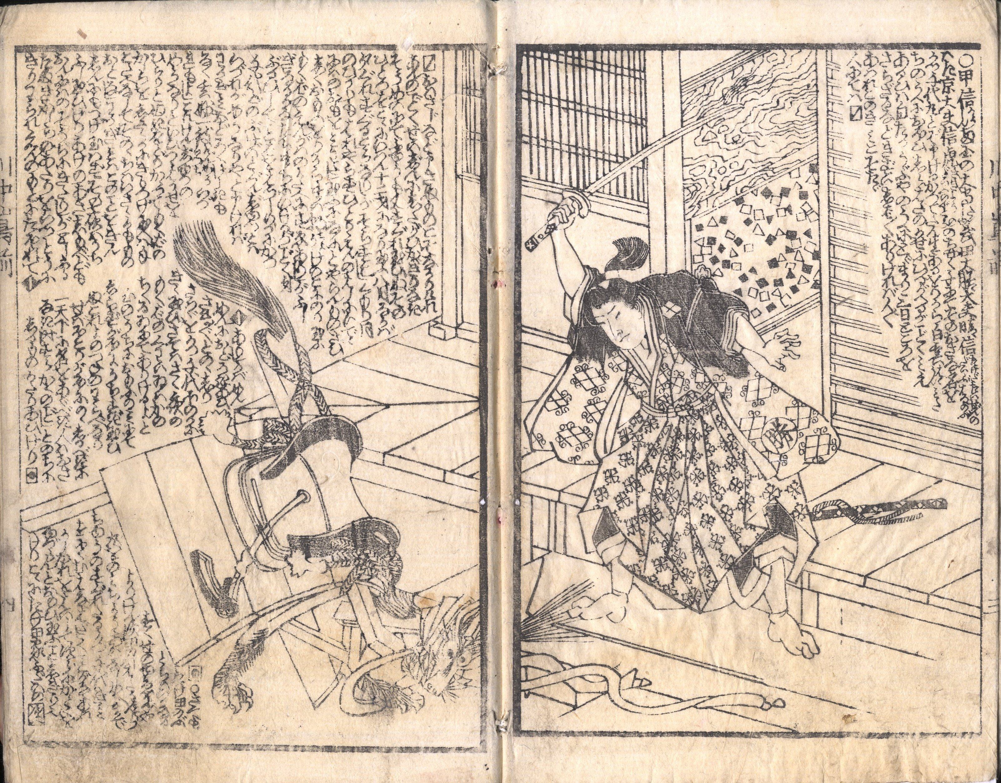 【備考】分類「合巻」。『甲越川中嶋軍記(前編)』は、『甲越川中嶋軍記』は、江戸時代後期の草双紙(合巻)。文章は戯作者の柳下亭種員、画は歌川芳虎。刊行は嘉永3年(1850年)または翌嘉永4年か。『甲越川中嶋軍記』はこの激増期の作品で、『甲越川中嶋軍記』は文化6年から文政8年頃に刊行された速水春暁斎作の読本『絵本甲越軍記』を元にしており、川中島における信玄・謙信の一騎討ちを中心としたダイジェストとなっており、文章を配した柳下亭種貞は一般的な「作」「編」を用いずに「訳」を用いている。内容は甲斐・越後間の戦いに重点が置かれており、『絵本甲越軍記』で詳細に記されている晴信(信玄)の初陣や信玄の父信虎の追放などについては簡略化されている。画に関して、『絵本甲越軍記』では各巻に数葉ずつ挿絵があるが、『甲越川中嶋軍記』では共通する場面は少なく、画工の芳虎は『絵本甲越軍記』を参照していなかったものと考えられている。著名な川中島の戦いにおける一騎討ちの場面については、『甲越川中嶋軍記』では文章において両軍は川の中で戦ったと記しているに対し画では床几に座した信玄が軍配で謙信の太刀を受け止める様子が描かれており、混乱が生じている。こうした混乱が生じた背景には当時、浮世絵など一騎討ちの画題では信玄が床几に座した構図が定型化しており、一方の文章においてはリアリティを重視して川の中で戦ったとする説を採った可能性が考えられている(Wikipedia参照)。SE02712
