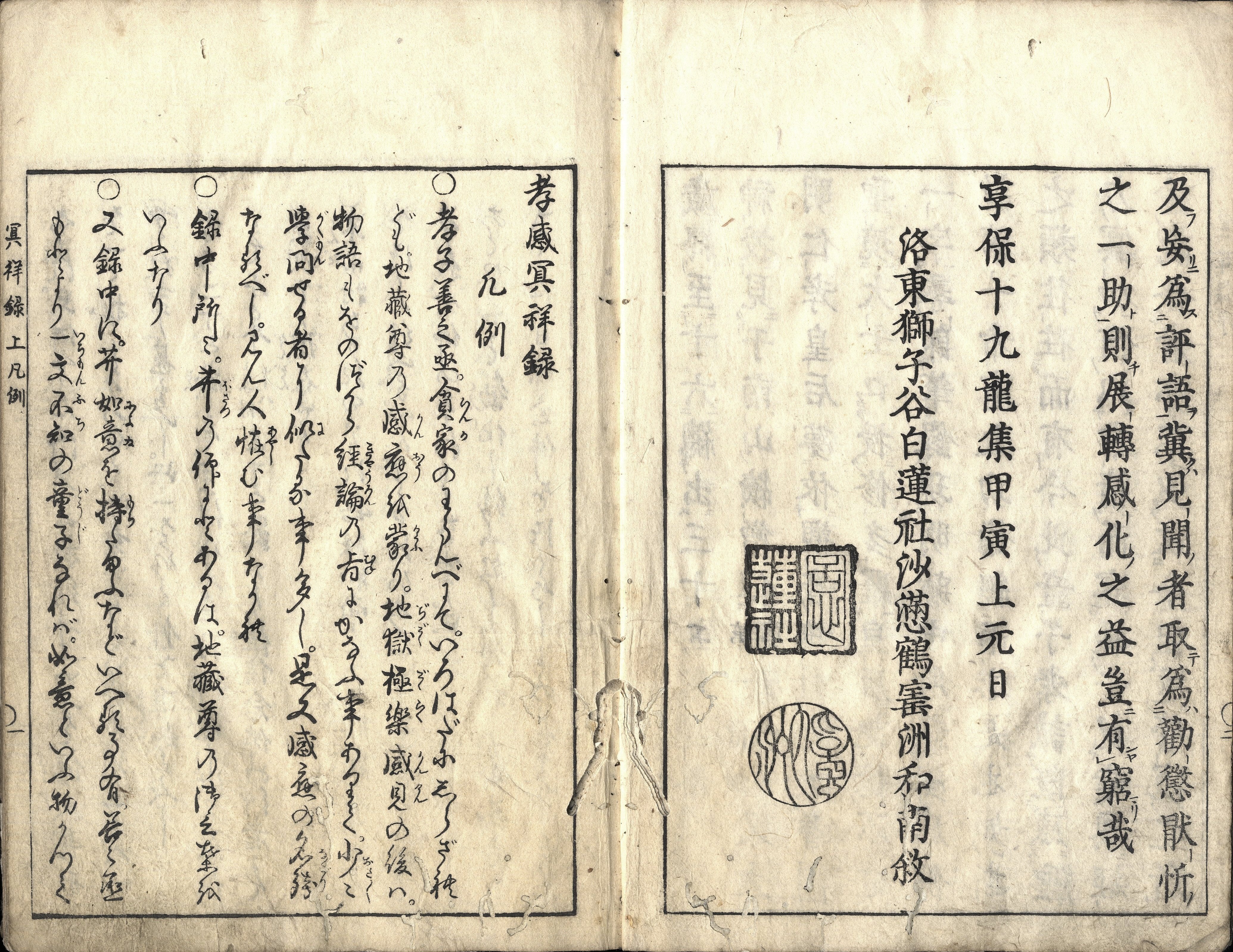 【備考】分類「仏教」。袋綴じに間紙挿入が不可能なため、間紙なしでスキャンした。父(松野善四郎)の病気平癒祈願のために地元の観音堂や薬師堂を参詣した奥州伊達郡南半田村(福島県桑折町(コオリマチ)の孝子善之丞(後に出家し直往と称す。墓は福島県伊達郡桑折町南半田字八反田)が地蔵菩薩(実は守一山無能寺の開山である無能上人)の導きによって地獄および極楽めぐりをした体験を記した実録書・勧化本。SE02714