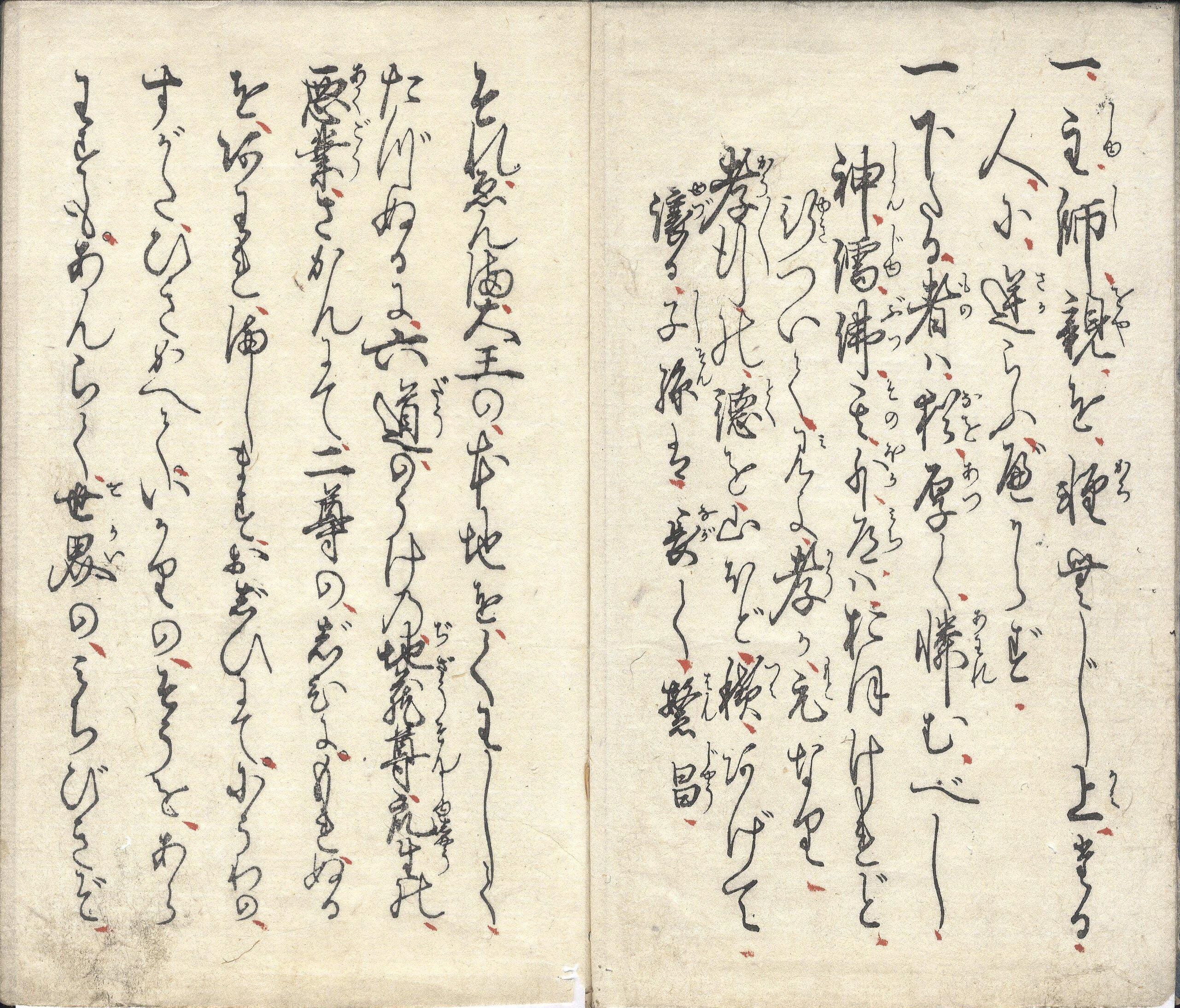 【備考】分類「仏教」。尾張給父村は、現・愛知県(海西郡)愛西市。巻頭に「延命地蔵大菩薩」、本文に「孝命和讃」「西の河原和讃」および道歌5首などを収録する。SE02772
