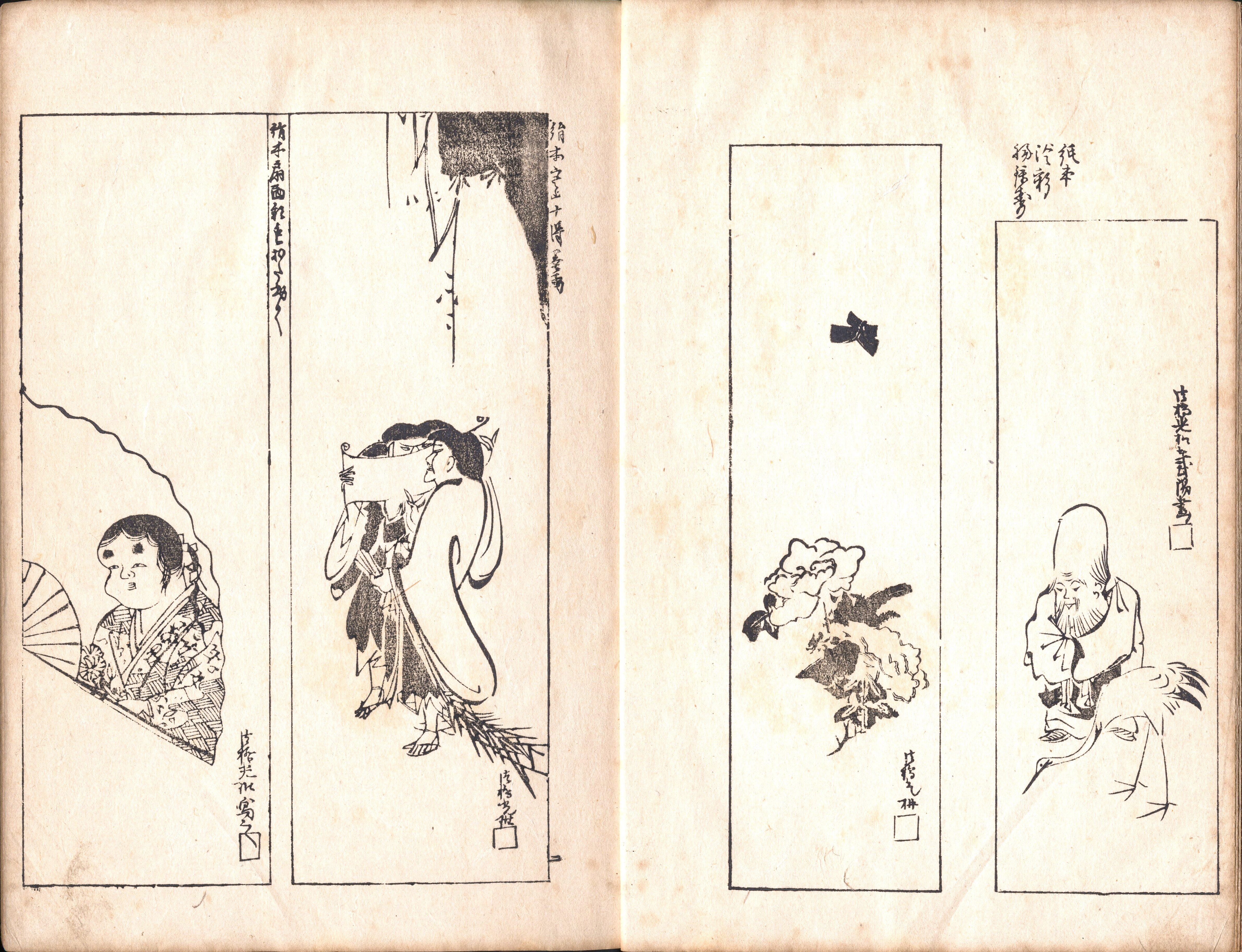 【備考】分類「絵画」。尾形光琳作画の縮図集。『光琳百図(前編)』は、酒井抱一が、文化12年(1815)の光琳百回忌を記念して遺作展を開催した際に編集・刊行した光琳の作品集。続編はその10年後に刊行されたもの。SE02777