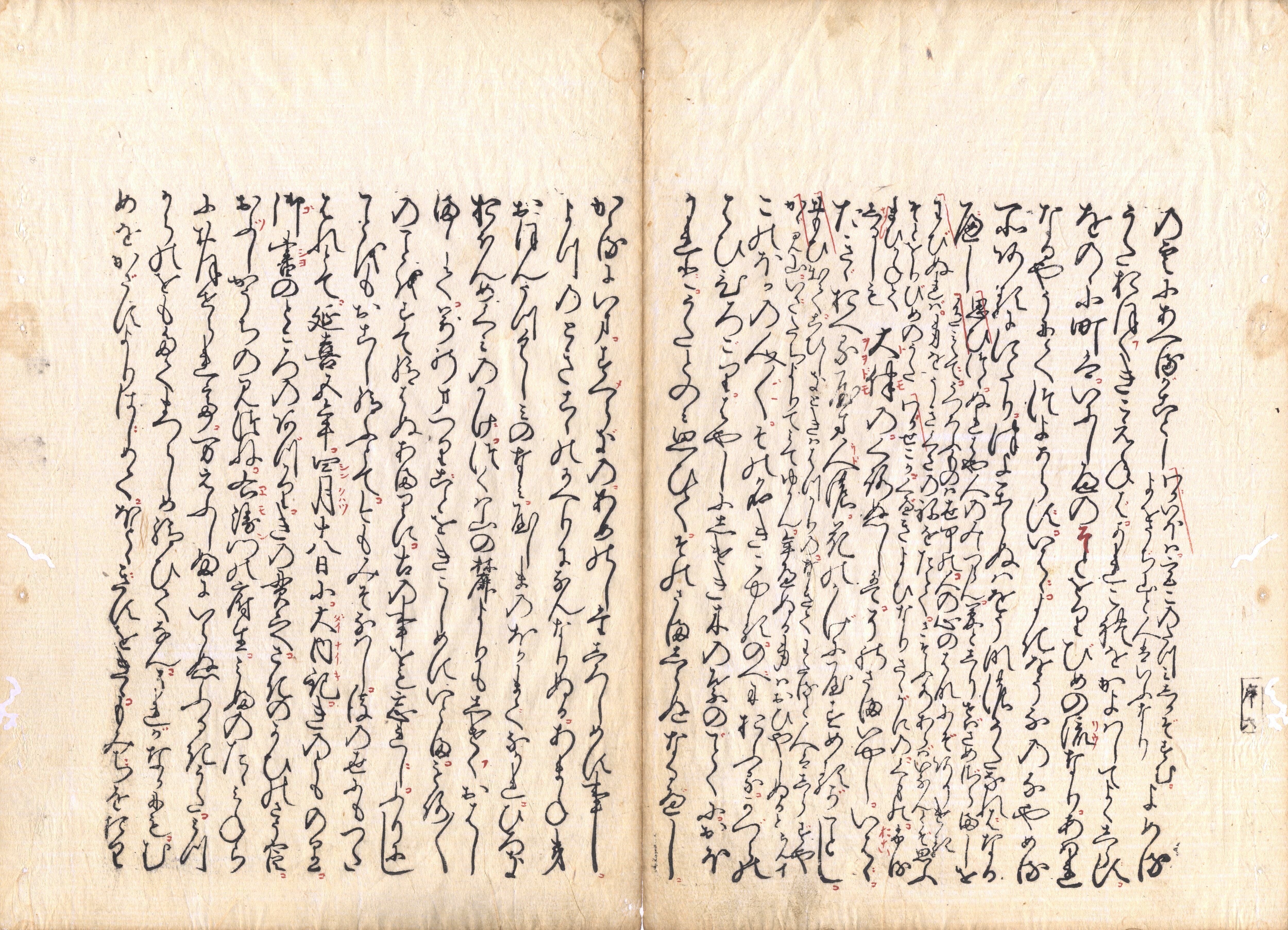 【備考】分類「歌集」。袋綴じ展開収録。板元の一人、河内屋久次郎は江戸前期(延宝~天和頃)の書肆。『古今和歌集』は、平安時代前期の最初の勅撰和歌集。 20巻。歌数 1095首余。醍醐天皇の命により、紀友則 (きのとものり) 、紀貫之 (つらゆき) 、凡河内躬恒 (おおしこうちのみつね) 、壬生忠岑 (みぶのただみね) が撰集にあたった。成立年について、延喜5 (905) 年に一応完成して奏上したとする説、その年に勅命を受け、同 13~14年頃完成とする説に分れる。春 (上下) 、夏、秋 (上下) 、冬、賀、離別、羇旅、物名、恋 (一~五) 、哀傷、雑 (上下) 、雑体、雅に部立されている。仮名、真名 (漢文) の序が付せられ、その内容は歌論史的にも大きな意義がある。歌は時期的に、詠み人知らず、六歌仙、撰者の時代に区分され、撰者の歌が最も多く、ほかに素性 (そせい) 法師、在原業平、伊勢、小野小町、遍昭 (へんじょう) なども多い。『古今集』は和歌を宮廷文学として確立し、その体系、表現、美意識は、以後の文学史の展開に大きな影響を与えた(コトバンク)。SE02797