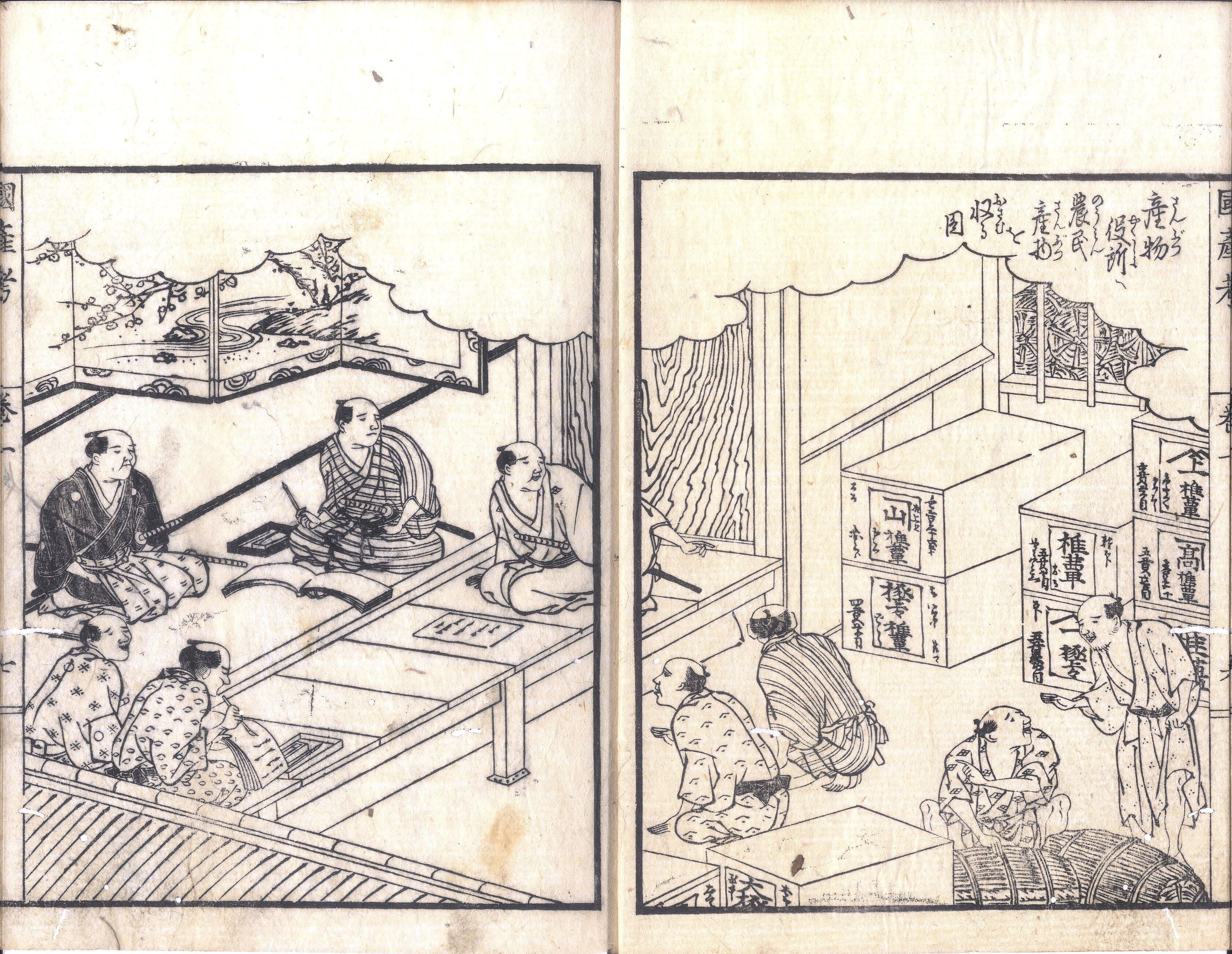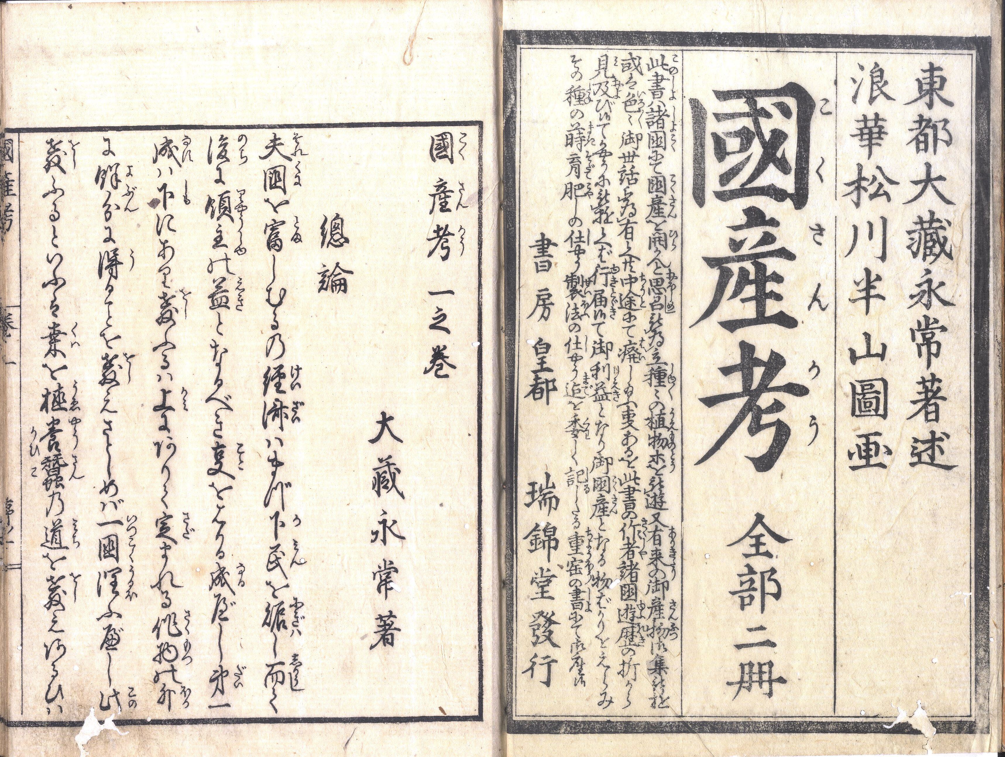 【備考】分類「物産」。1巻末尾が破損につき、『広益国産考』8冊本によって補った。江戸後期の農書。著者は同時代の農学者大蔵永常。1859年(安政6)に全8巻が版行された全8巻の『公益国産考』に先駆けて刊行された冒頭の2巻本。農学書。著者は大蔵永常(おおくらながつね)。彼の生涯最後の集大成である。全8巻よりなり、1859年(安政6)に刊行された。ただし、この第1および第2巻にあたる部分は、『国産考』上下として42年(天保13)に出版されており、全巻の執筆を終えたのが44年(弘化1)である。一之巻では、国産(特産)奨励を述べた総論のあとに、紙、コウゾ(楮)をはじめ、30余りの特産の解説と、その加工についての記述が続く。二之巻はスギ、ヒノキ、マツそして砂糖、三之巻はイグサ、イチビ、四之巻はヤマイモ、ワラビ、カキなど、五之巻は醤油(しょうゆ)、灯油、蝋(ろう)綿、養蚕など、そして六之巻では、特産は作物に限らないとして、人形の作り方などが紹介されている。また海苔(のり)、茶もここで扱われる。七之巻は主として織物であるが、養蜂(ようほう)なども書かれている。八之巻は果樹の仕立てが主である。大蔵永常の説明は、彼が実際に試みた体験などがもとになっており、きわめて具体的である。挿絵も美しく、宮崎安貞の『農業全書』とともに江戸時代二大農書といわれる(日本大百科全書)。著者最晩年の書で、幕末から明治初期の農業技術の発達に大きく寄与した。永常は、ハゼノキの栽培・加工を説いた処女作《農家益》の版行以来、ハゼノキ、カンショ、綿、イグサ、アブラナなどの特用作物の栽培・加工に関する著作を多数ものしているが、本書はこれら特用作物にとどまらず、諸国の特産物となるべき樹木、果樹、茶、養蚕、養蜂、製紙、ノリ、土人形製造などの技術も詳述した、永常農学の集大成である(コトバンク)。江戸時代の三大農学者のひとり大蔵永常(1768頃‐?)の主著で、彼の農学大系がここに集成されている。この時期、商業資本の台頭により諸領主の財政は危機を深め、農民の疲弊窮乏も特に深刻なものとなった。本書で永常はその救済を産業振興、生産向上に求めて、彼自身の諸国行脚による見聞を基に、きわめて具体的懇切にその手段方法を述べている(岩波書店HP)。SE02807