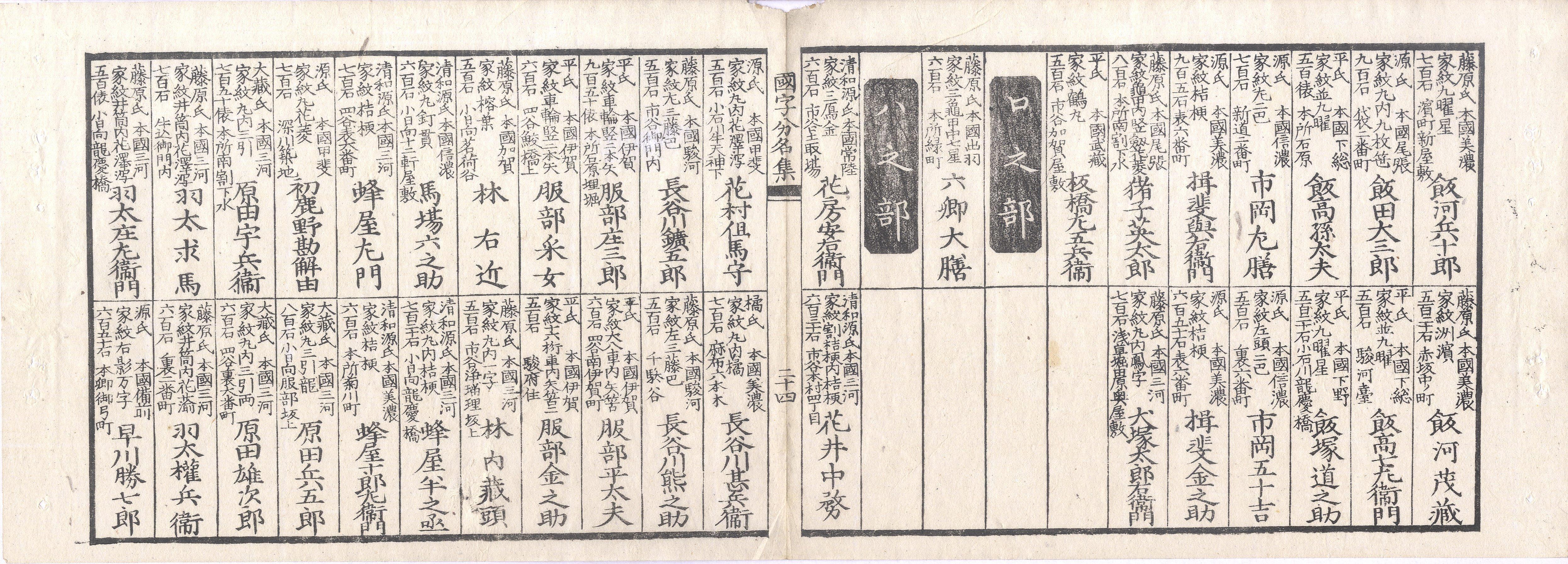 【備考】分類「名鑑」。上巻に「万石ヨリ以下千石マデ」、下巻に「千石ヨリ以下五百石マデ」を収録し、イロハ順に配列した旗本の人名録。各項とも、氏族、本国、家紋、石高、居所、姓名を記し、所々、姓名の傍らに、(高)高家、(交)交代寄合、(儒)儒者、(典)典薬類、(医)医家、(歌)歌学方の略号を付記する。SE02808