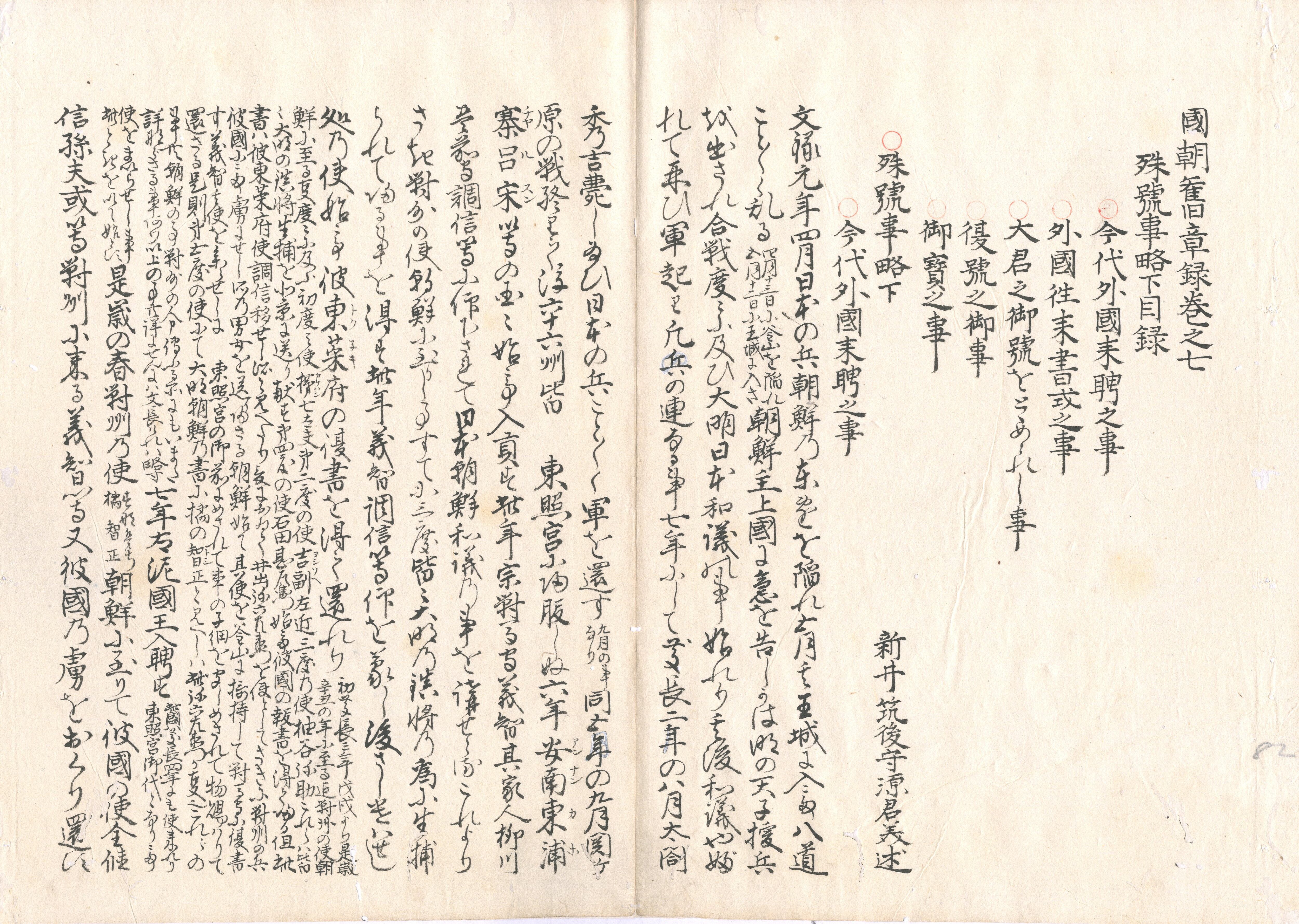 【備考】分類「雑記」。袋綴じ展開収録。江戸幕府の政道や諸大名統制・処分、内政・経済・外交等に関する諸記録を集めたもので、底本は全9巻から成り、「惣目録」によれば、1巻(室新助撰、「天下は天下の論」~「御当家御代々御書判・御朱印の図(御三家松平加賀守書判)」)、2巻(林大学頭撰、「除邑録」)、3巻(林春斎撰、「武家執政之事」~「嘉定之事」)、4巻(新井君美撰「本朝宝貨事略」、林内記撰「年紀考」)、5巻(太宰弥右衛門撰、「米穀金銀之事」)、6-7巻(新井君美撰、「殊号事略」)、8巻(雨森藤五良撰「朝鮮風俗之事」、新井君美撰「琉球国之事略」ほか)、9巻(林内記撰、「先規より御家号を被下候家々之事」)を収録する。