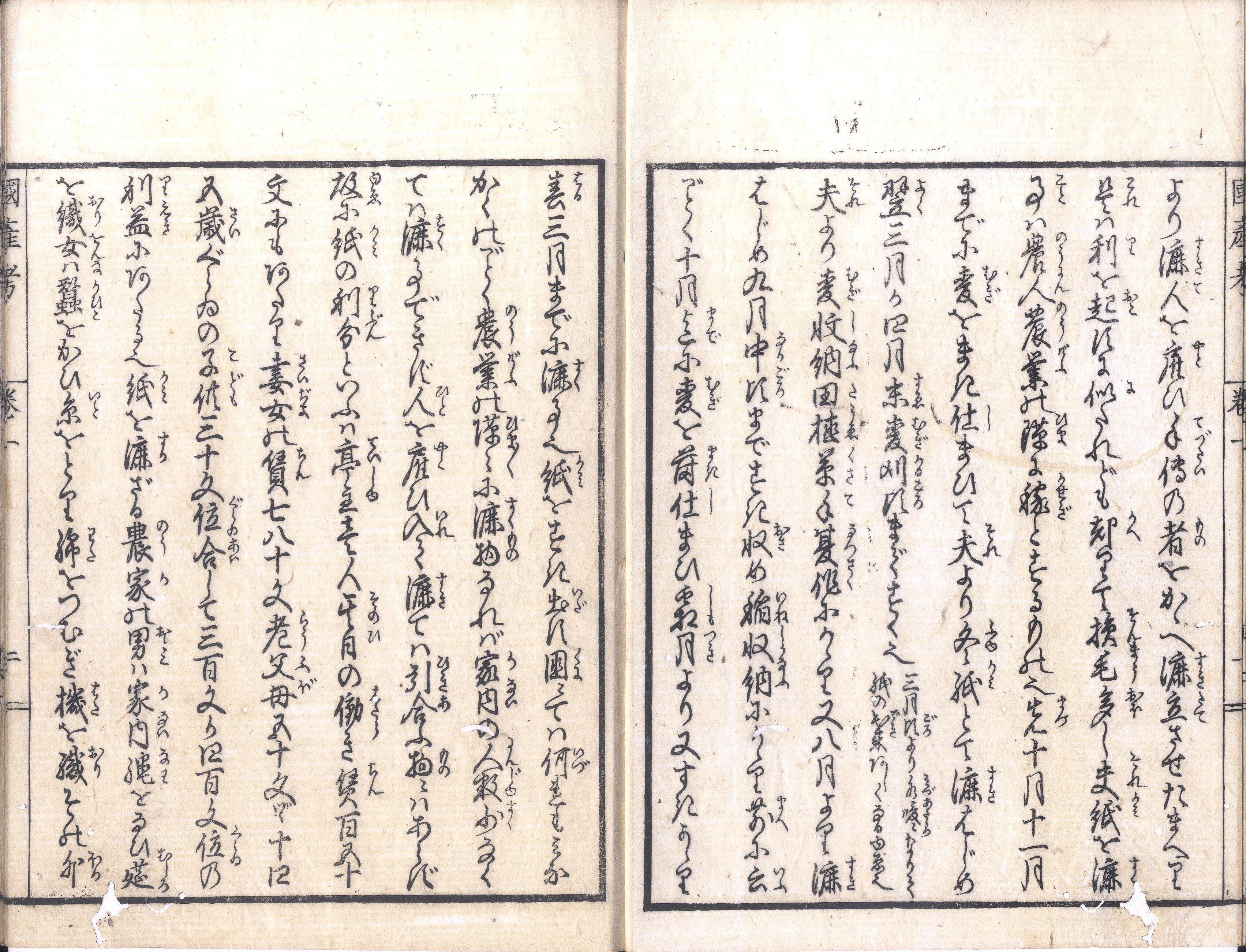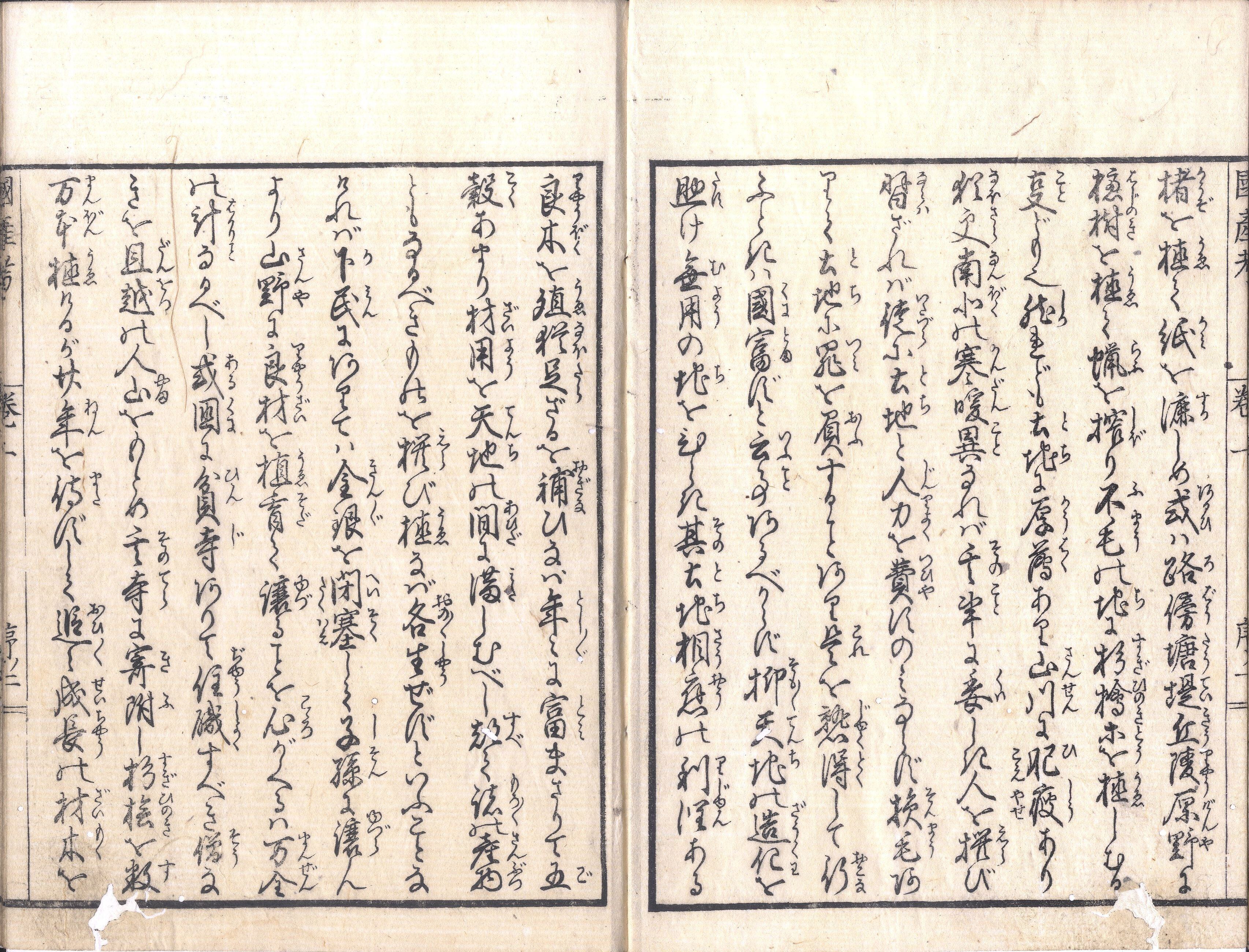 【備考】分類「物産」。1巻末尾が破損につき、『広益国産考』8冊本によって補った。江戸後期の農書。著者は同時代の農学者大蔵永常。1859年(安政6)に全8巻が版行された全8巻の『公益国産考』に先駆けて刊行された冒頭の2巻本。農学書。著者は大蔵永常(おおくらながつね)。彼の生涯最後の集大成である。全8巻よりなり、1859年(安政6)に刊行された。ただし、この第1および第2巻にあたる部分は、『国産考』上下として42年(天保13)に出版されており、全巻の執筆を終えたのが44年(弘化1)である。一之巻では、国産(特産)奨励を述べた総論のあとに、紙、コウゾ(楮)をはじめ、30余りの特産の解説と、その加工についての記述が続く。二之巻はスギ、ヒノキ、マツそして砂糖、三之巻はイグサ、イチビ、四之巻はヤマイモ、ワラビ、カキなど、五之巻は醤油(しょうゆ)、灯油、蝋(ろう)綿、養蚕など、そして六之巻では、特産は作物に限らないとして、人形の作り方などが紹介されている。また海苔(のり)、茶もここで扱われる。七之巻は主として織物であるが、養蜂(ようほう)なども書かれている。八之巻は果樹の仕立てが主である。大蔵永常の説明は、彼が実際に試みた体験などがもとになっており、きわめて具体的である。挿絵も美しく、宮崎安貞の『農業全書』とともに江戸時代二大農書といわれる(日本大百科全書)。著者最晩年の書で、幕末から明治初期の農業技術の発達に大きく寄与した。永常は、ハゼノキの栽培・加工を説いた処女作《農家益》の版行以来、ハゼノキ、カンショ、綿、イグサ、アブラナなどの特用作物の栽培・加工に関する著作を多数ものしているが、本書はこれら特用作物にとどまらず、諸国の特産物となるべき樹木、果樹、茶、養蚕、養蜂、製紙、ノリ、土人形製造などの技術も詳述した、永常農学の集大成である(コトバンク)。江戸時代の三大農学者のひとり大蔵永常(1768頃‐?)の主著で、彼の農学大系がここに集成されている。この時期、商業資本の台頭により諸領主の財政は危機を深め、農民の疲弊窮乏も特に深刻なものとなった。本書で永常はその救済を産業振興、生産向上に求めて、彼自身の諸国行脚による見聞を基に、きわめて具体的懇切にその手段方法を述べている(岩波書店HP)。SE02807