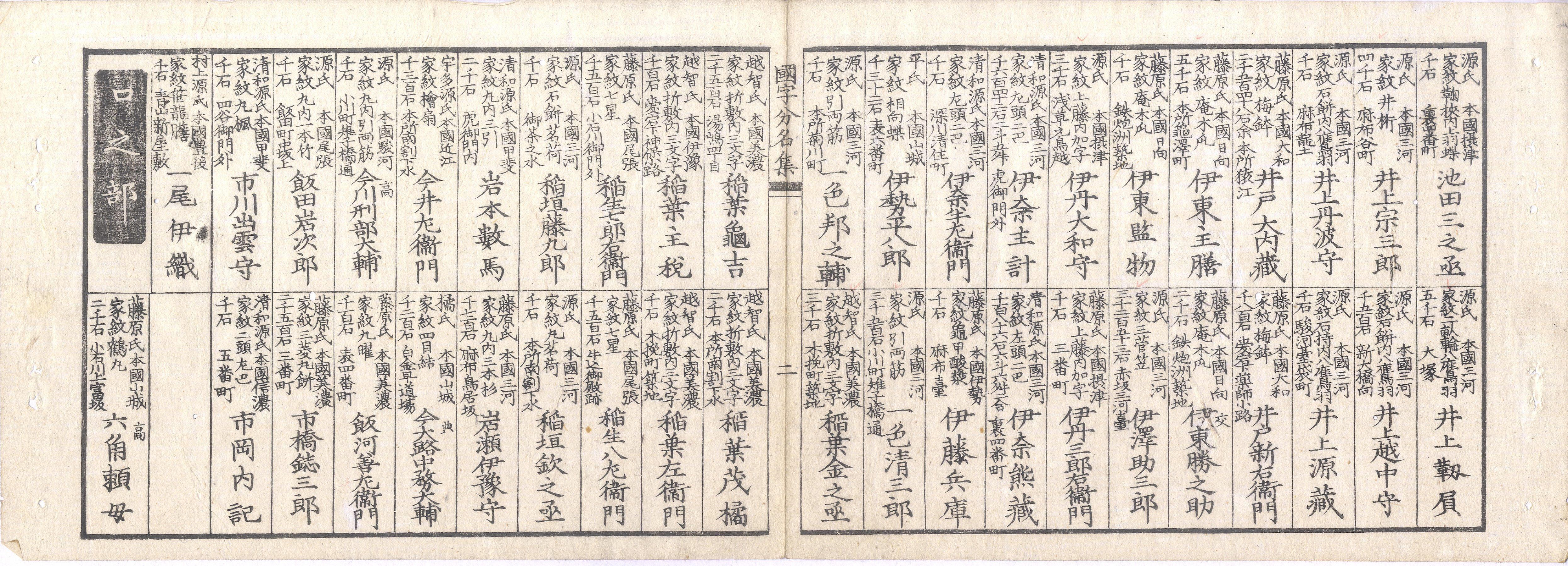 【備考】分類「名鑑」。上巻に「万石ヨリ以下千石マデ」、下巻に「千石ヨリ以下五百石マデ」を収録し、イロハ順に配列した旗本の人名録。各項とも、氏族、本国、家紋、石高、居所、姓名を記し、所々、姓名の傍らに、(高)高家、(交)交代寄合、(儒)儒者、(典)典薬類、(医)医家、(歌)歌学方の略号を付記する。SE02808