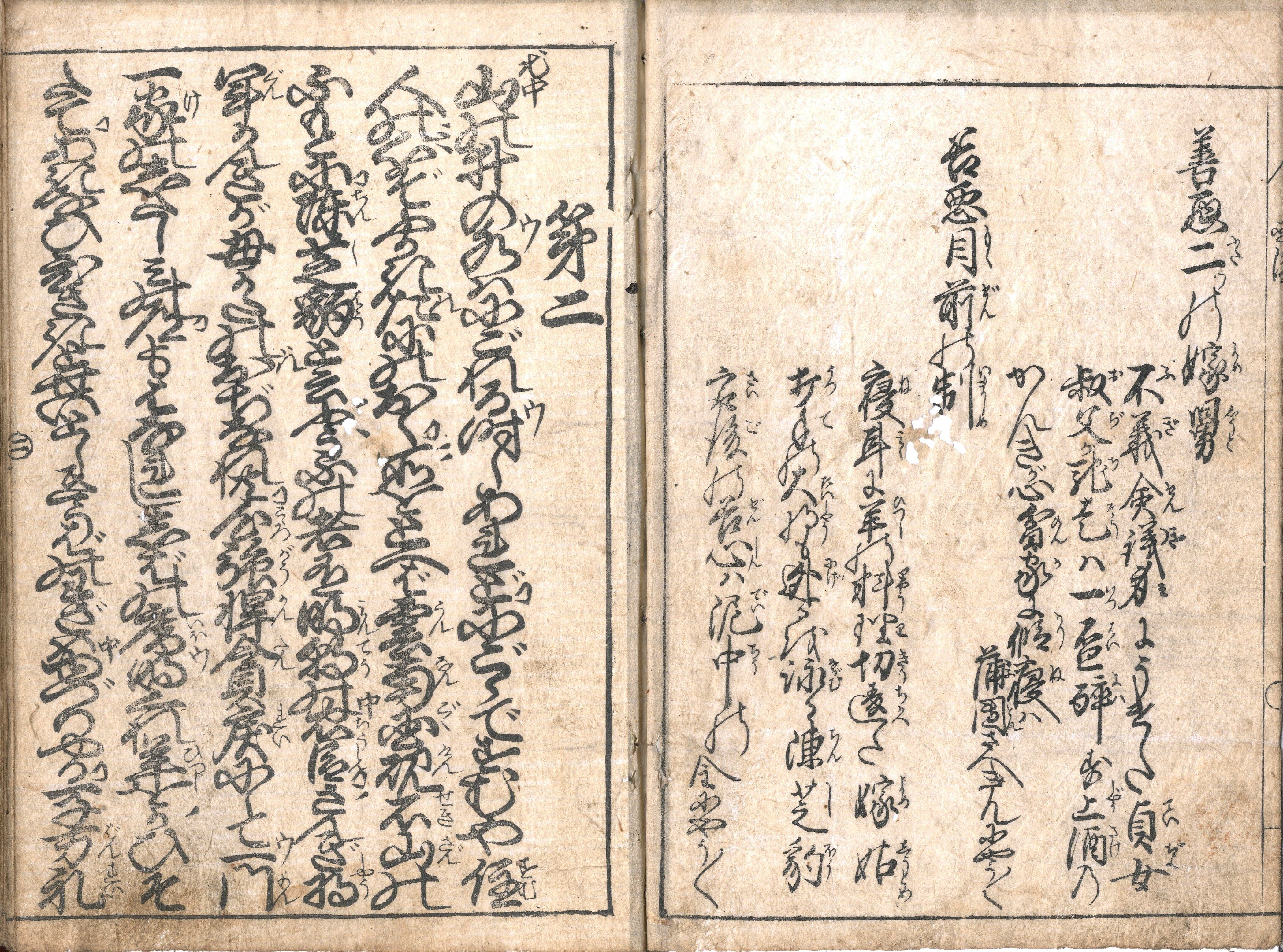【備考】分類「浄瑠璃」。絵入り(各巻3葉)。2巻は「善悪硯石山の茅屋」「善悪二ッの嫁舅」「善悪目前の制(イマシメ)」。4巻は「皇帝城下の御幸」「甘輝身替りの冠」「英雄亭一睡の夢」。