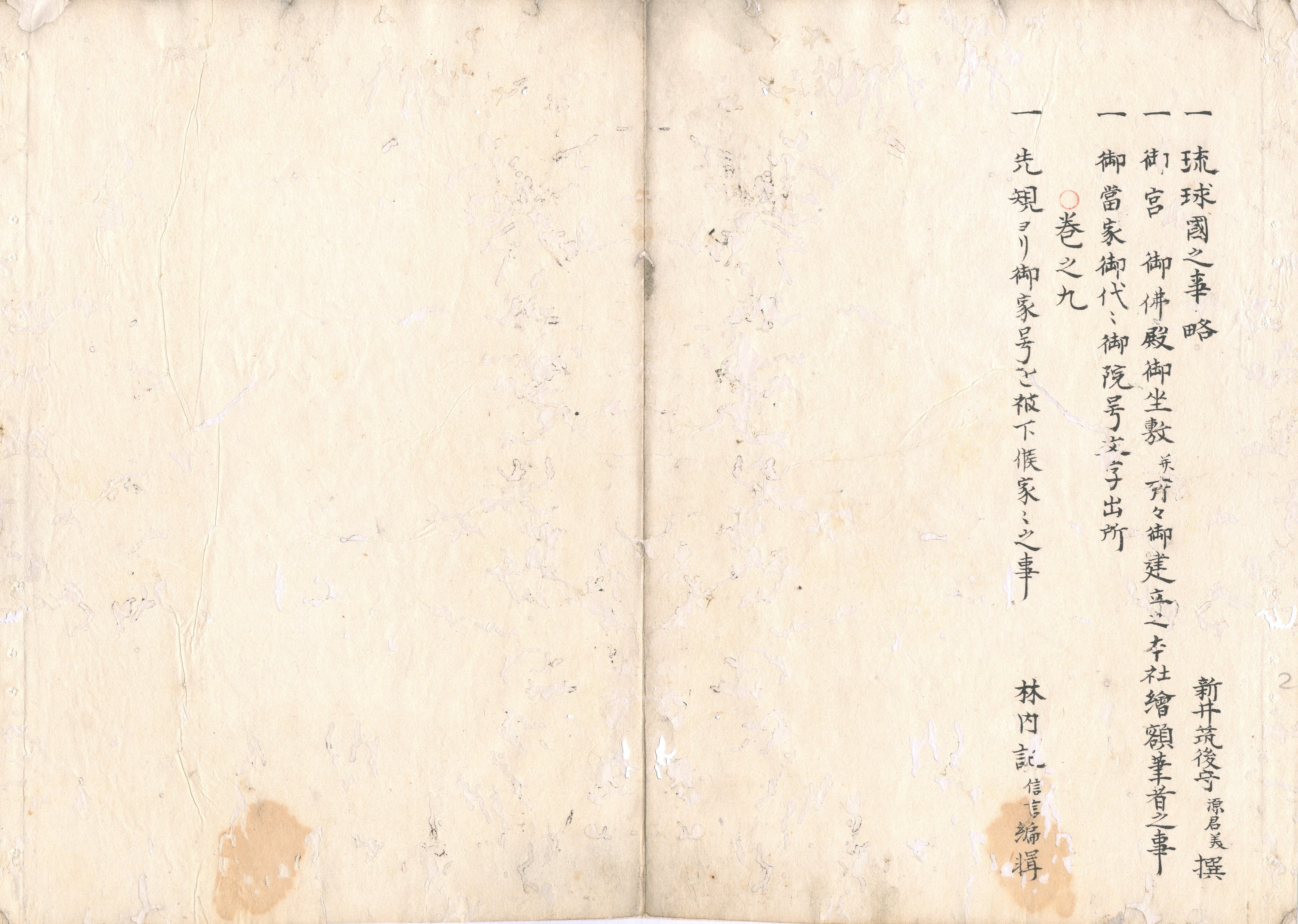 【備考】分類「雑記」。袋綴じ展開収録。江戸幕府の政道や諸大名統制・処分、内政・経済・外交等に関する諸記録を集めたもので、底本は全9巻から成り、「惣目録」によれば、1巻(室新助撰、「天下は天下の論」~「御当家御代々御書判・御朱印の図(御三家松平加賀守書判)」)、2巻(林大学頭撰、「除邑録」)、3巻(林春斎撰、「武家執政之事」~「嘉定之事」)、4巻(新井君美撰「本朝宝貨事略」、林内記撰「年紀考」)、5巻(太宰弥右衛門撰、「米穀金銀之事」)、6-7巻(新井君美撰、「殊号事略」)、8巻(雨森藤五良撰「朝鮮風俗之事」、新井君美撰「琉球国之事略」ほか)、9巻(林内記撰、「先規より御家号を被下候家々之事」)を収録する。