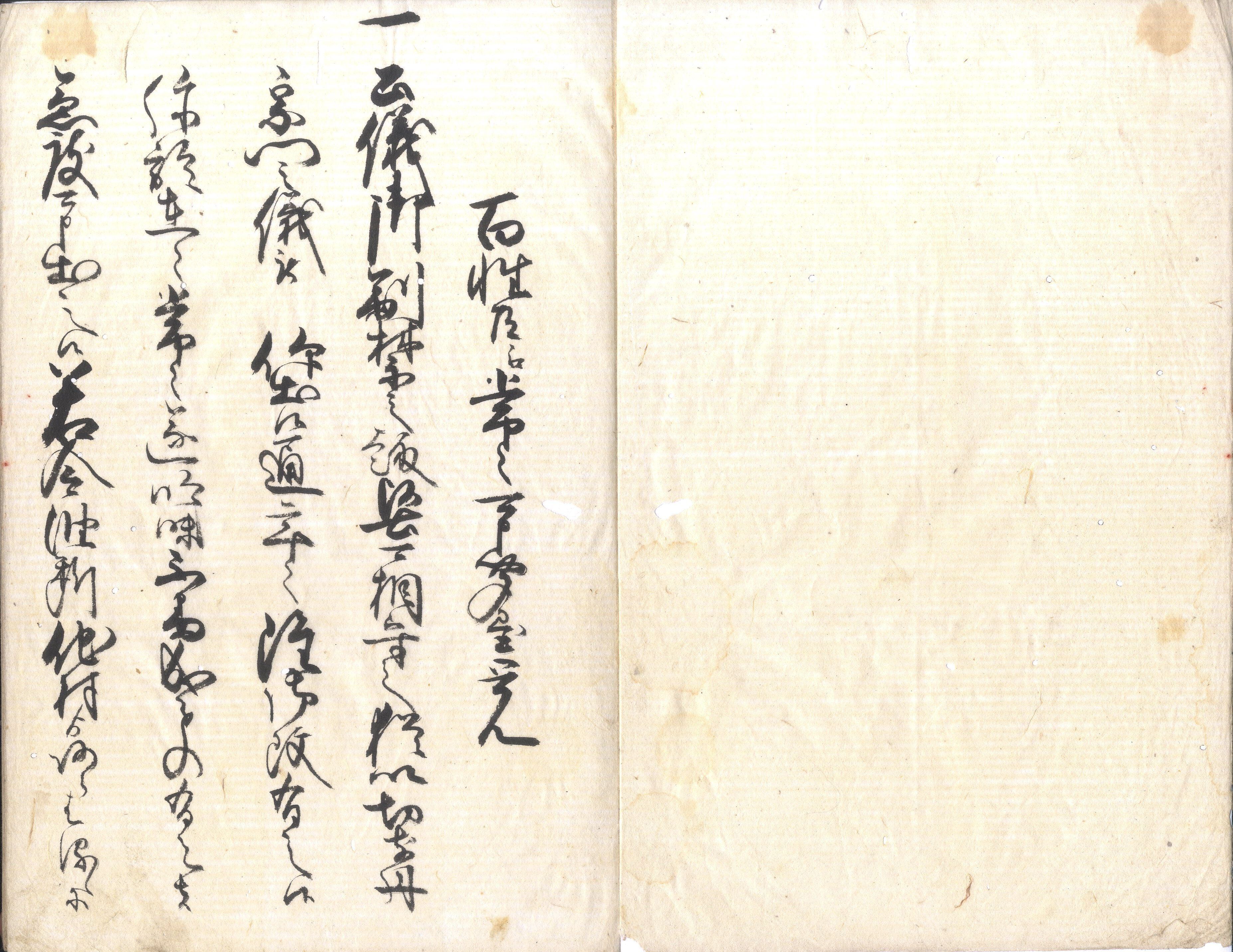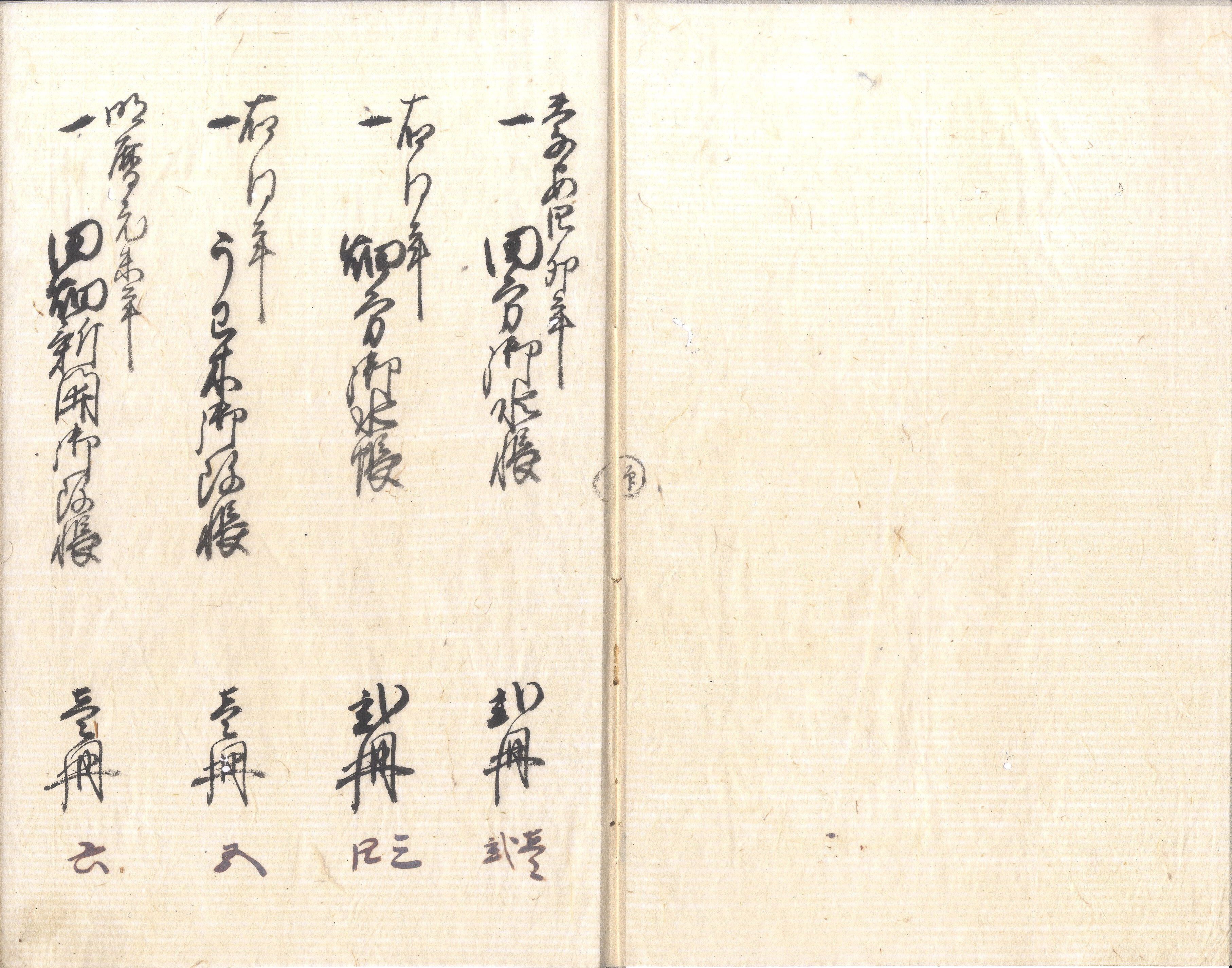 【備考】分類「古文書」。小田村(広島県高田郡*現安芸高田市か)の古文書2点。前者は寛政2年の御条目の控え。後者は天保10年の小田村御水帳引渡目録で、後半に種々の引き継ぎ公文書の一覧である「万引渡目録」を付す。「御水帳」は「御図帳」の当て字で検地帳のことで、後者の史料は小田村庄屋・権九郎が後任の文五郎に引き継いだ際の検地帳目録。SE02859