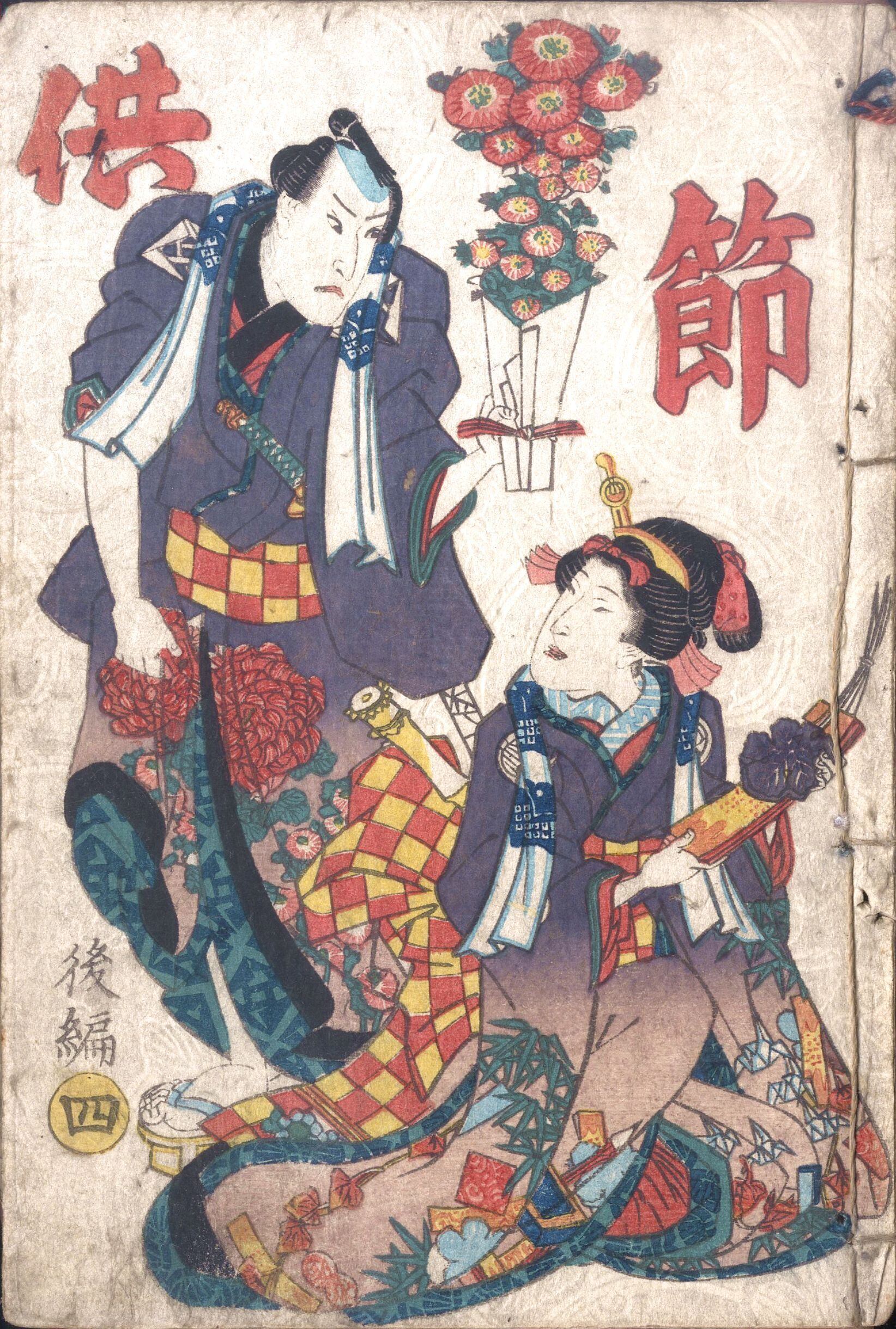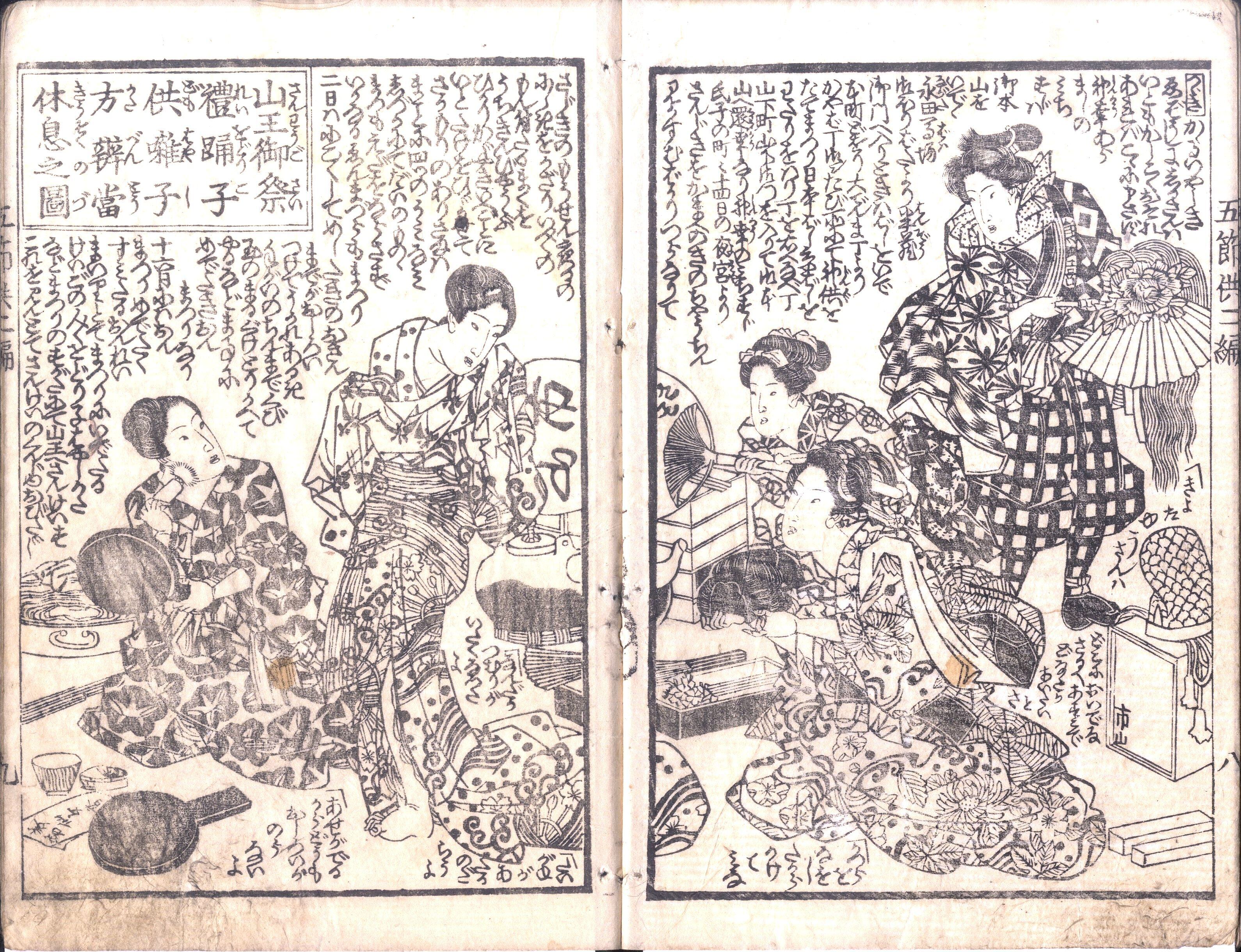 【備考】分類「合巻」。同板別本2種を収録。底本は、『五節供稚童講釈』全2編(各編4巻、全8巻)の第2編(後編)。主に江戸における五節供・祭礼・年中行事等のあらましを絵入りで解説した往来物。全頁絵入りで、庶民風俗を活写した挿絵を多く掲げる。初編4巻に1月~5月の部、2編4巻に6月~12月の部を収録。2編は、6月の部に「富士さんけいの事」「土用見舞」「江戸の納涼(スズミ)」「天王まつり」「山王御祭礼踊子供囃子方弁当休息之図」「嘉祥の事」「嘉祥の餅の事」(以上第1冊)、「名越のはらいの事」、7月の部に「盆灯篭の事」「七夕の事」「たんざく竹の事」「いものはのつゆにてたんざくかく事」「七夕の雨」「七夕に硯あらふ事」「七夕に井戸がへする事」「七月七日の節供」「中元の祝ひの事」「迎火の事」「精霊まつりの事」(以上第2冊)、「閻魔まいりの事」「大斎日(オサイニチ)の事」「盆をどりの事」、8月の部に「八朔の事」「月見の事」「月見のだん子」「秋の彼岸」「いざよひの月」、9月の部に「重陽の事」「九月のひなまつり」「登山会の事」「十三夜の事」「登山会の図」(以上第3冊)、「神田御まつり」、10月の部に「亥の子の事」「炉開口きりの事」「神無月」「亥の子に火燵をひらく」、11月の部に「顔見せ」「十夜の事」「御命講(オメイコウ)」「御取越」「夷講の事」「冬至」「吹革(フイゴ)まつりの事」「酉の市」「髪置・袴着の事」「山の神まつり」、12月の部に「寒の入」「乙子(オトゴ)の朔日」「正月の事はじめ」「煤掃(ススハキ)の事」「鬼は外、福は内の事」「節分豆蒔の事」「厄払の事」「大晦日」について記す。SE02863