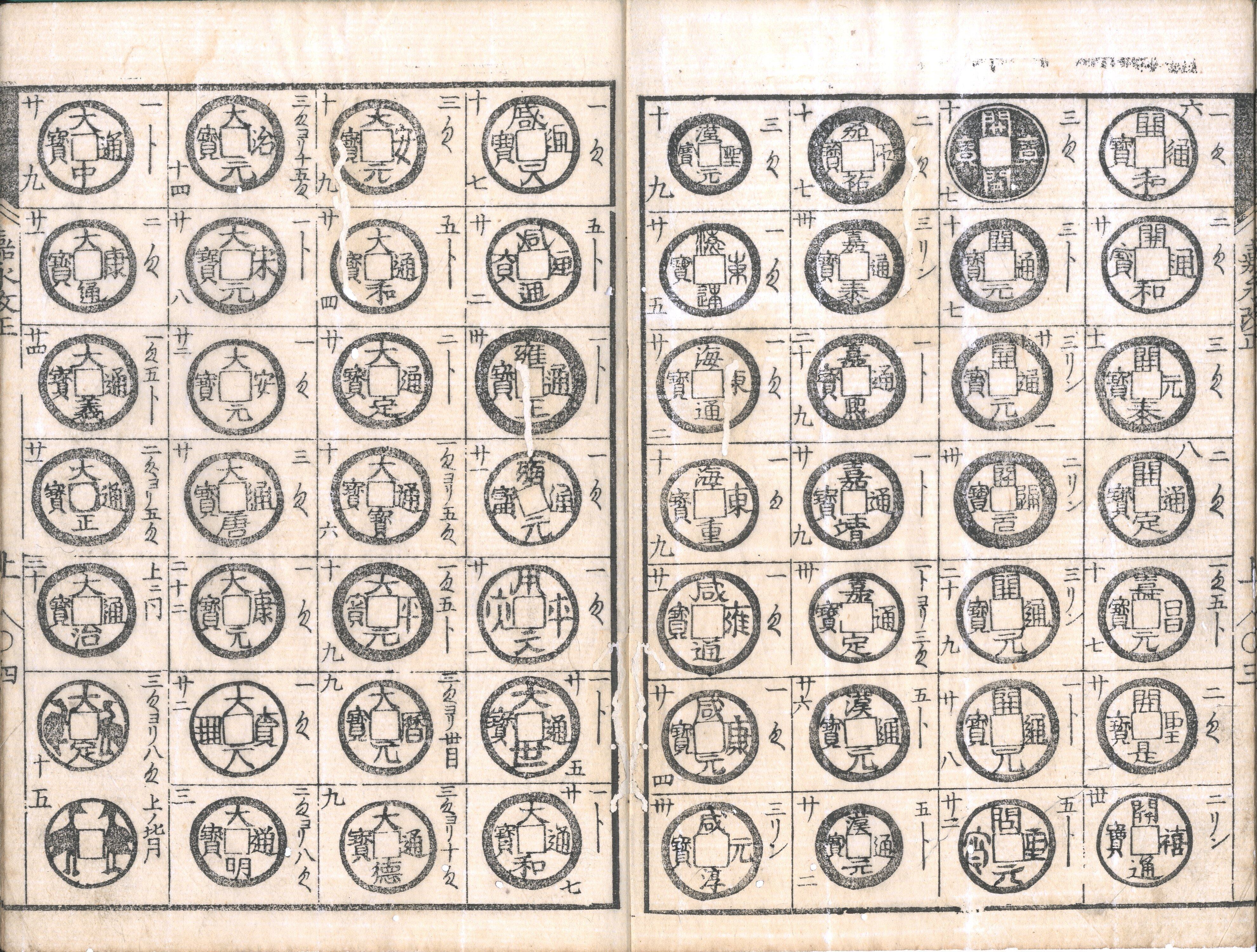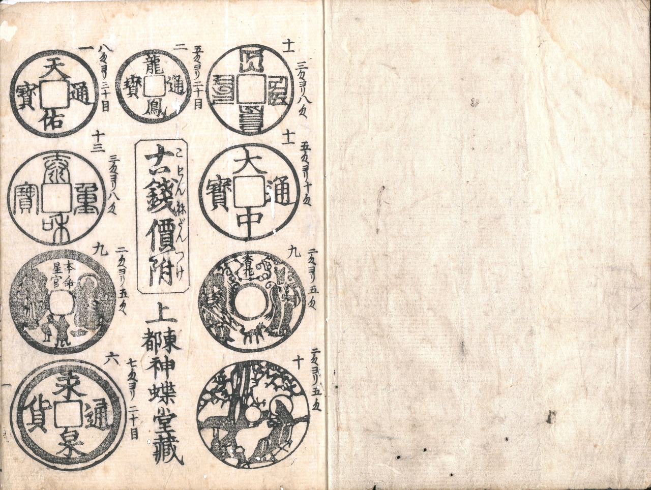 【備考】分類「貨幣」。江戸後期における古銭売買の相場を記した古銭価格一覧。古銭の名称は記載せず、図柄に相場と評価を付すのみである。