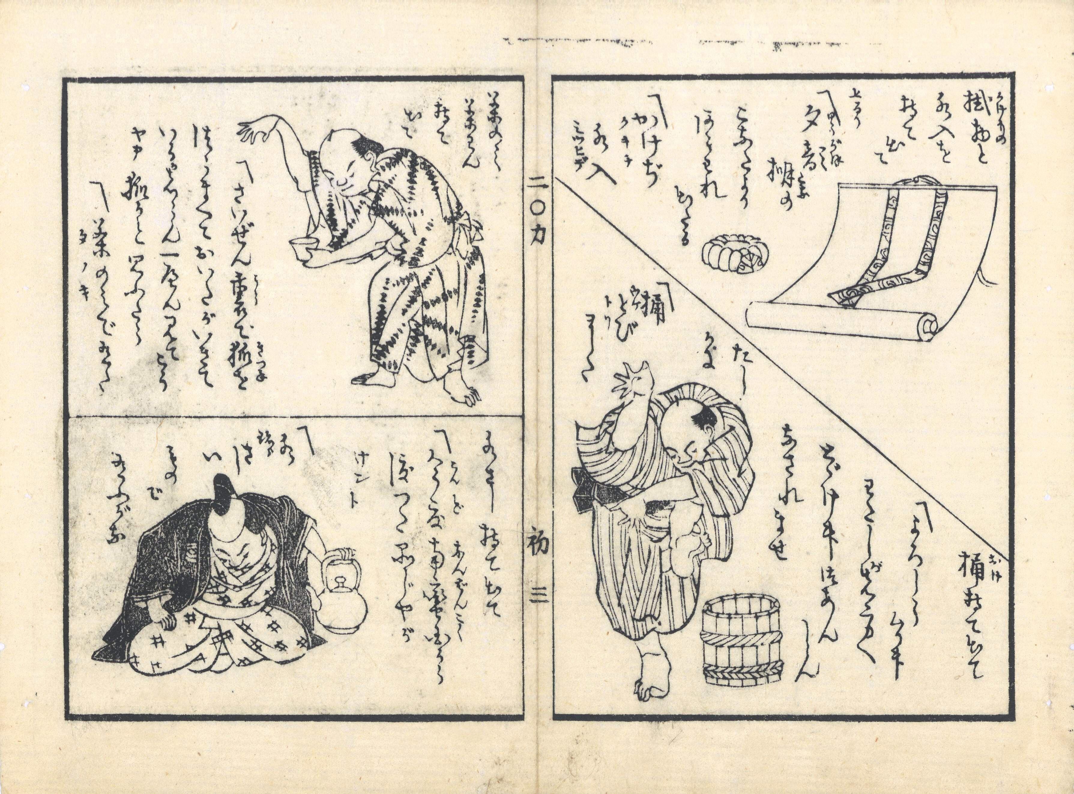 【備考】分類「芸能」。袋綴じ展開収録。『滑稽俄[滑稽に輪嘉・二○カ](初編)』は、「財布持て出て」「刷毛持て出て」「盥持て出て」「筆持て出て」のように、「○○を持て出て」と題した俄狂言を挿絵とともに半丁に2点ずつ掲げた小冊子。俄狂言は、素人が、宴席や街頭で即興に演じたこっけいな寸劇。江戸中期から明治にかけて流行。座敷で行う座敷俄、屋外で行う流し俄などがあり、大阪俄・博多俄などが有名。のちに職業として、寄席で、道具・鳴り物入りで行うようになった(コトバンク)。俄(にわか)とは、江戸時代から明治時代にかけて、宴席や路上などで行われた即興の芝居。仁輪加、仁和歌、二和加などとも書く。またの名を茶番(ちゃばん)(Wikipedia参照)。SE02873