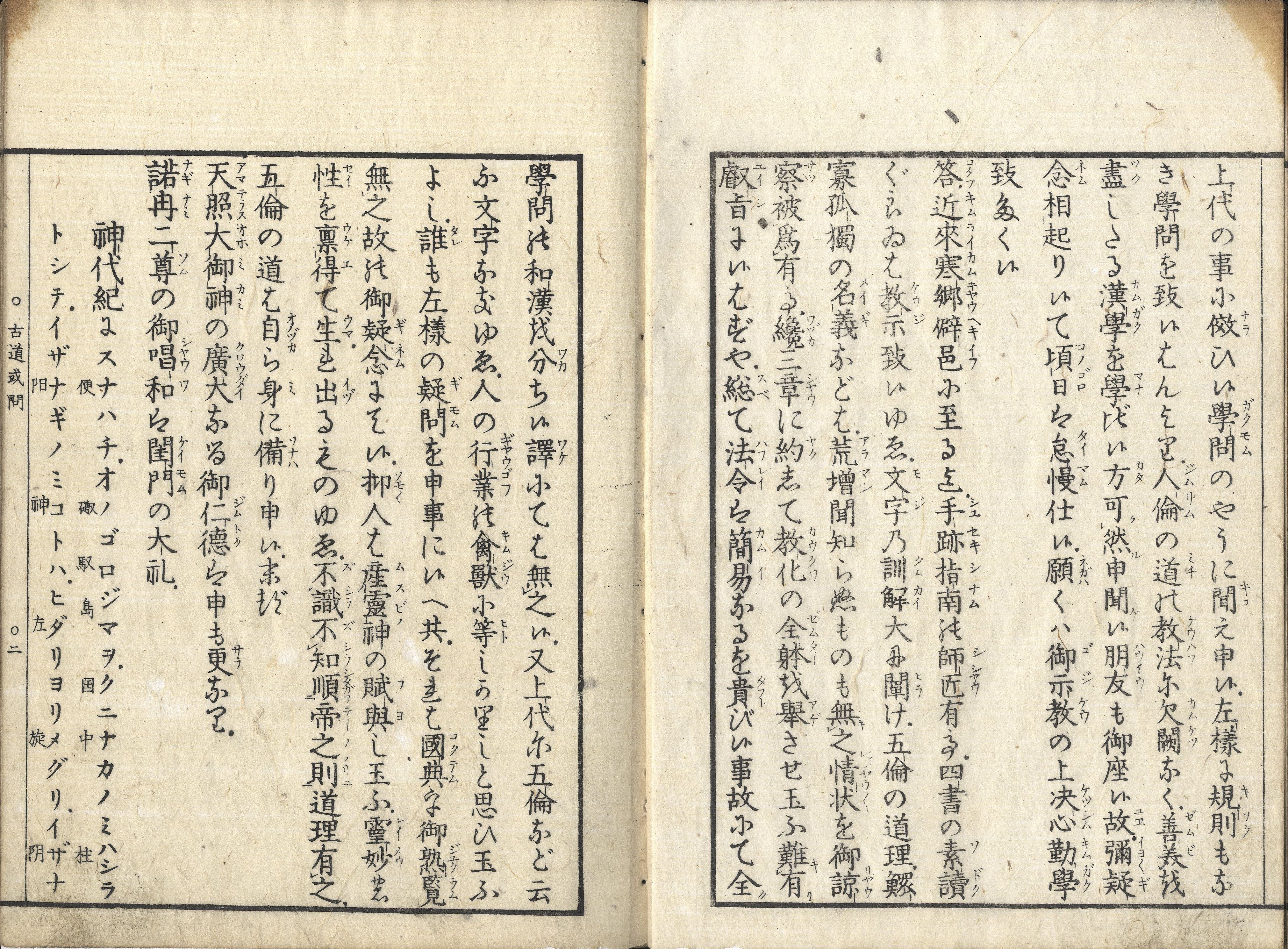 【備考】分類「神道」。巻末「咲園大人著述書目」に、本書を「新たに掲示させ給へる御制札の第一条、第二条漢語なるを以、或人漢学を専務とすべく御勧弉被遊候やと疑問し、且、本居・平田二大人の学風数件を問難せしを、悉に弁められ、古来儒流の得失、当今学問の本末順逆を正しく論(アゲツラ)ひ答へられたる書なるを以、大博士平田大人も甚(イタ)く褒賞せられし也」と紹介する。柴田花守(1809-90)は、江戸後期-明治時代の神道家。文化6年1月8日生まれ。不二道(ふじどう)の小谷三志(こたに-さんし)に師事し,不二道10世教主となり,咲行(しょうぎょう)と称する。富士信仰を神道化して,明治11年実行社を組織。15年神道実行派の名で教派神道として独立,17年実行教初代管長。和歌,書画にもすぐれた。明治23年7月11日死去。82歳。肥前小城郡(佐賀県)出身。号は琴岡,笑園。著作に「国之真柱」など(コトバンク)。