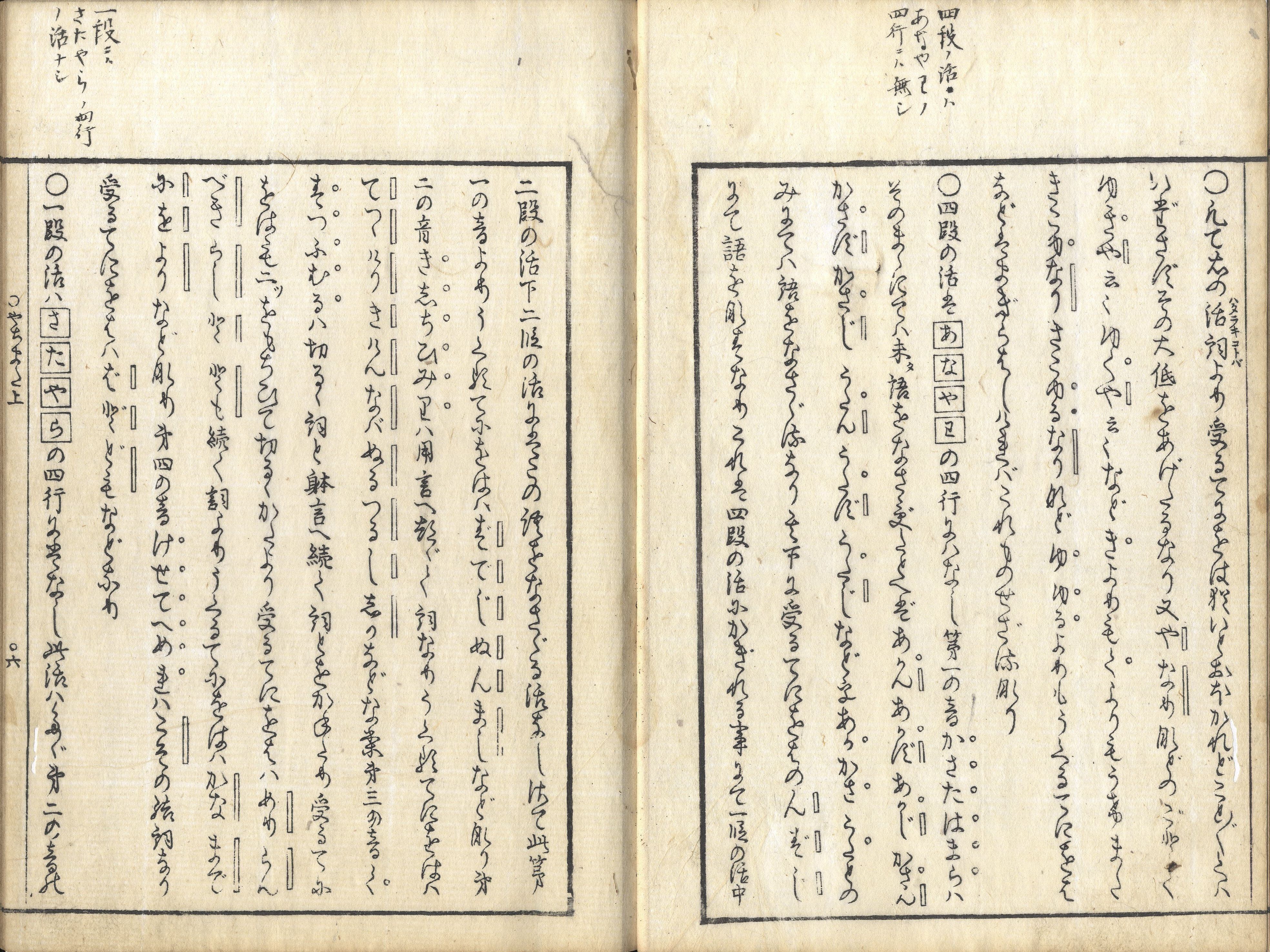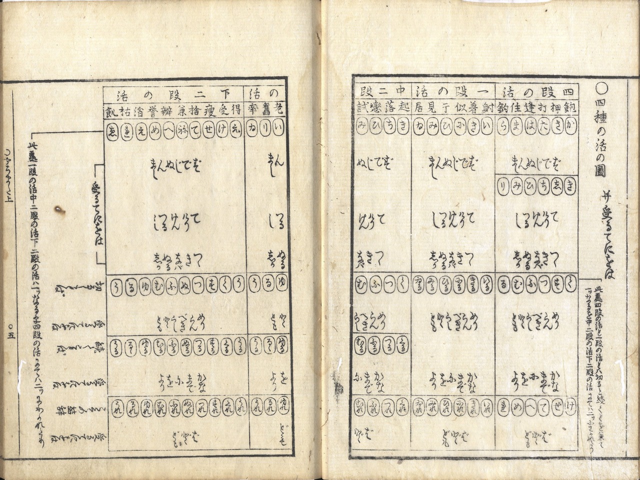 【備考】分類「語学」。末尾に、安政3年板を抄録した。本居宣長の『御国詞活用抄(ミクニコトバ-)』を基にし、これを整理統合し理論づけて、動詞の活用の種類と活用形の体系とを定めた活用研究上の画期的な著書。まず、活用の型に四段・一段(上一段)・中二段(上二段)・下二段の4種とカ変・サ変・ナ変の変格をたて、次に活用形に切れる形と続く形とがあり、続く場合にはそれを受ける辞に決まりのあることを明らかにし、5種の活用形を定め、アイウエオの段順に配列し、活用の型と活用形とから活用図を作り、五十音図の各行毎に掲げ、その後にそれに所属する語を可能な限り列挙し、その証例を示し、必要な場合には論拠を加えた。このような方法で、春庭は活用の体系を整理し、確定した。活用形の名目こそないが、古語の動詞の活用体系は本書でほとんど完成されたと言える。動詞の活用を簡明な形に総括した点で空前の研究である(「日本古典文学大辞典」参照)。SE02892