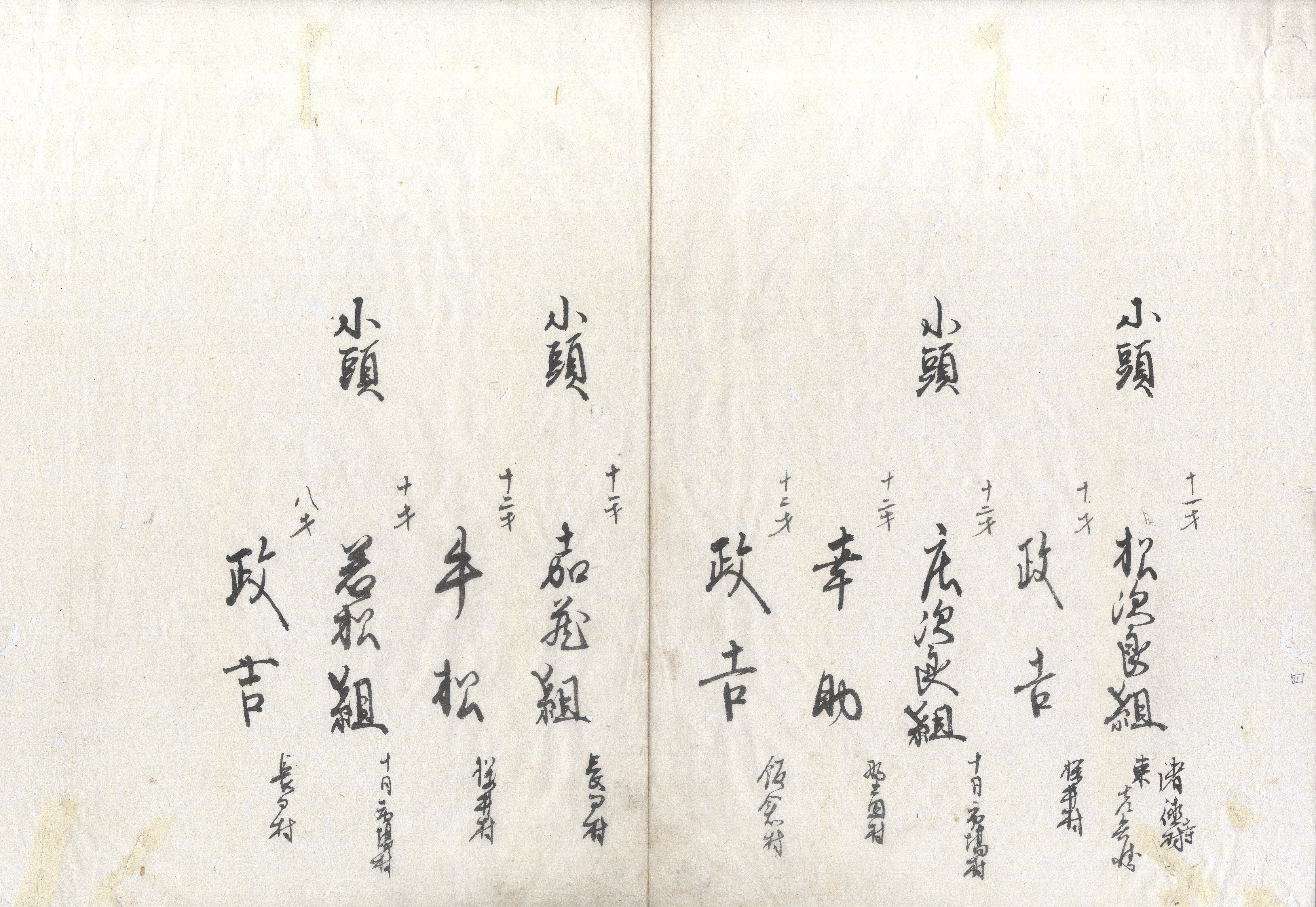 【備考】分類「教育」。『大原幽学全集』に「子供大会日記抄」と題して抄録する。同書解説によれば、幽学は、三代先を目標として万事計画的に地域の人々を善導したが、とりわけ子供の教育には特別な注意を払ってその心身の鍛練に心を砕いた。本書は、天保12年閏正月21日の子供大会以後、2月6日までの組み分けを摘録したものという。各組にはそれぞれ組長を置き、さらに小頭・大頭・世話人などの役員を設けて指導監督に当たらせるとともに、互いに善行を競わせた。幽学はその総取締役として善行者には褒詞や景物を授与して道徳的興味を促し、彼らの道徳的な生活の習慣化を計った。このグループのメンバーは概ね7歳から15歳で、それぞれ数名の小集団であったが、本記録によると、そのメンバーは集会の度に多少の入れ替えが行われていた様子が知られる。ちなみにこのような集会は、毎月17日に成人の男子大会、毎月18日に婦人大会が行われ、そのほかに毎月1回子供大会が行われたという。また、子供大会では、各組合の先輩も出席し、子供が幽学の著作である『微味幽玄考』や『議論集』の素読を行ったり、児童の行状を考査し品行方正の者には表彰して景物を授与した。